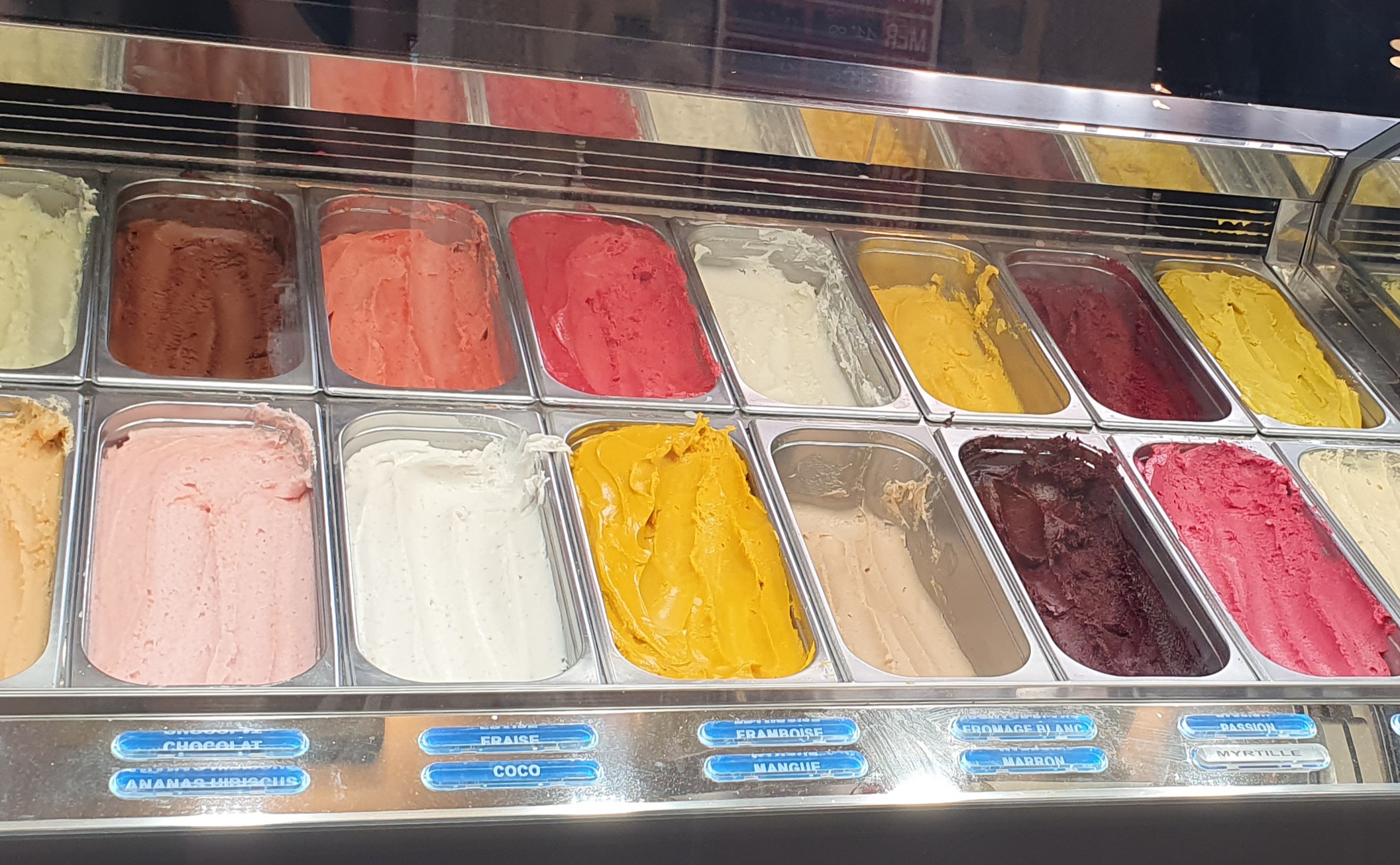 J’ai pris de la glace goût ananas hibiscus, pêche de vigne et cassis. Toutes 3 excellentes. Par contre, beaucoup de monde un samedi en fin d’aprem. Tant mieux pour l’établissement!