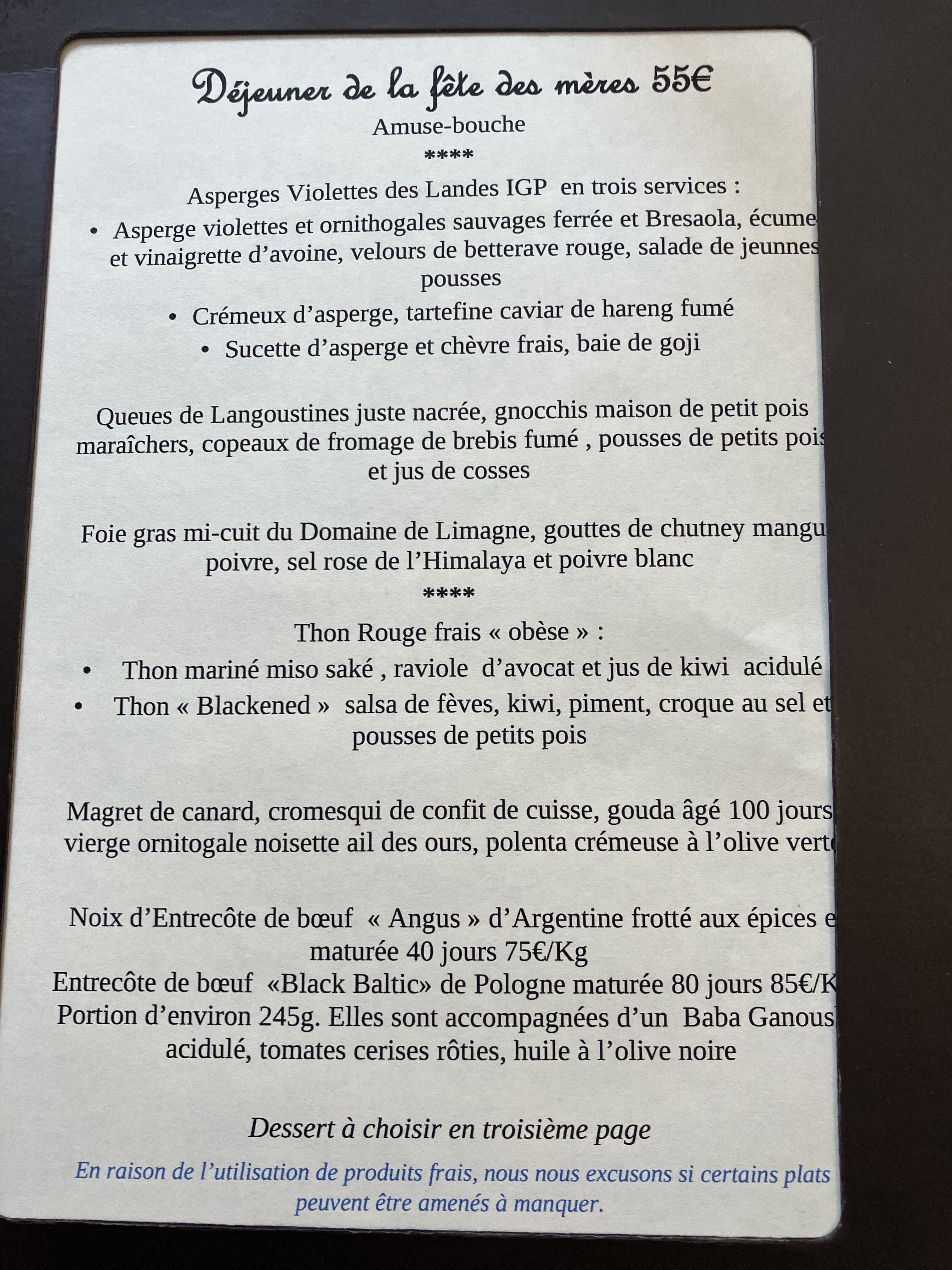 je connais déjà ce restaurant mais pour le dej fête des mères je suis déçue: Nous étions les 1er arrivés , On nous disait qu’ il ne restait que 2 plats de thon! ( c’était faux, les clients arrivés après en ont eu droit) On s’est rabattu sur l’entrecôte du menu . Sur la note finale l’entrecôte était comptée 18€ en plus du forfait menu à 55€. sans que ce soit indiqué de façon explicite.