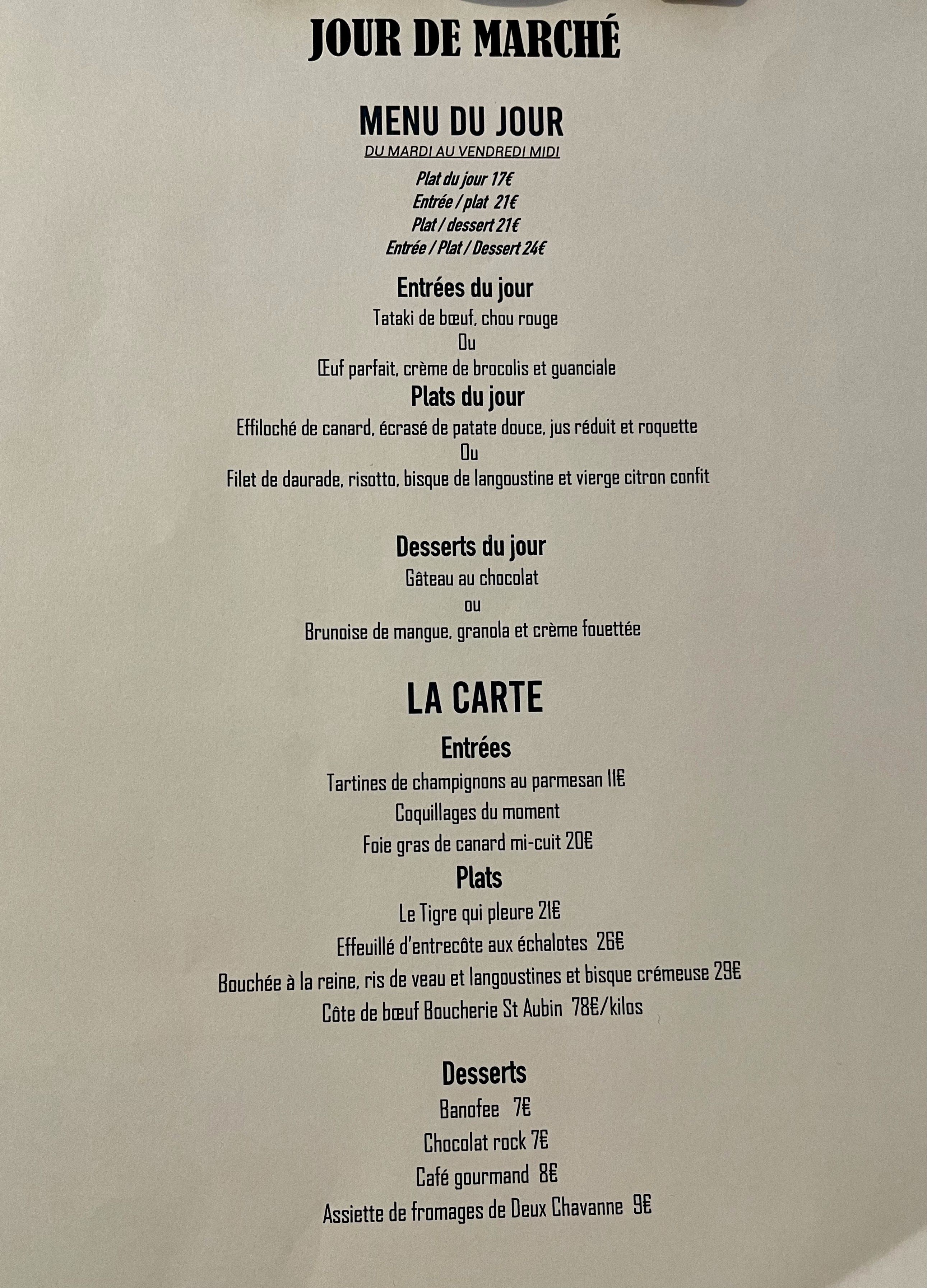 Nous avons passé une excellente soirée sur la terrasse de Jour de marché. Très bons produits et surtout excellent service, très agréable et avec beaucoup d'attention.