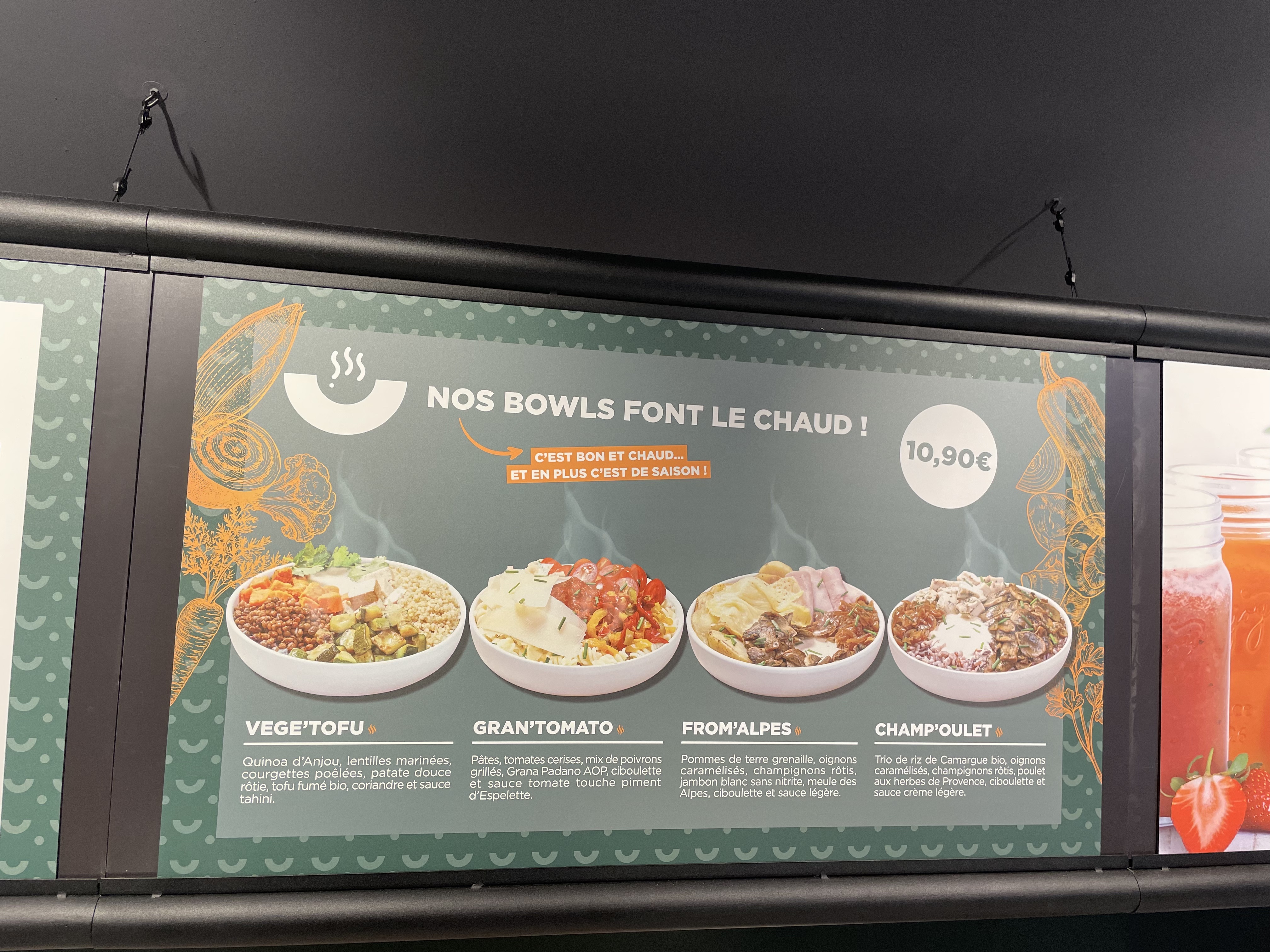Produit frais, très beau concept. Très radins en quantité..et Pas de menu en livraison : Plat + dessert (fruits) + boisson = 24,10€