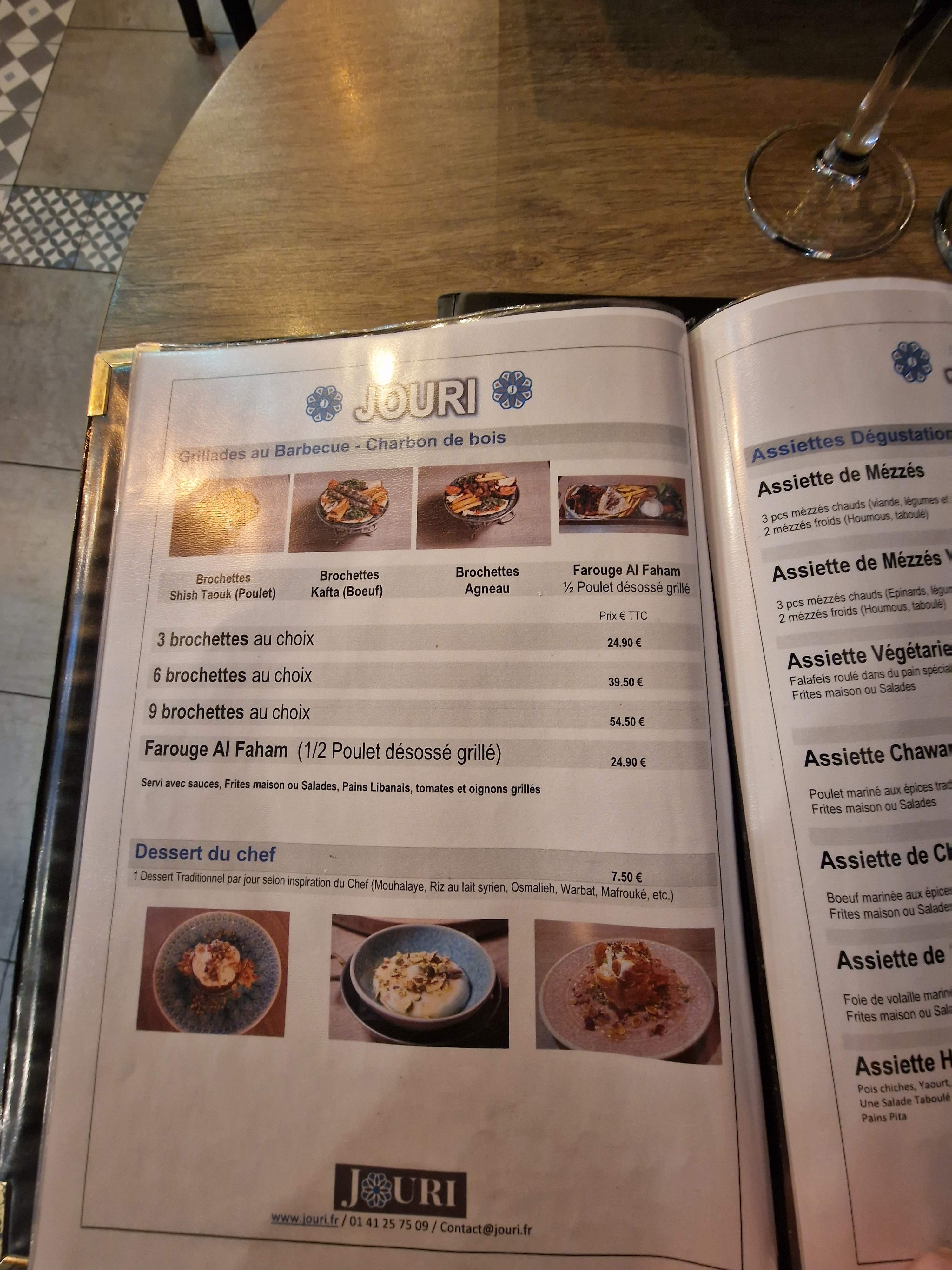 Sur une agréable place de Nanterre, Jouri, ouvert récemment, vous offre un voyage gustatif en Syrie. Le chef prépare une délicieuse cuisine authentique.aux multiples saveurs. Tout est très bon, fait maison, avec un service irréprochable. Et le samedi soir, un chanteur et joueur d'oud vous accompagnera.