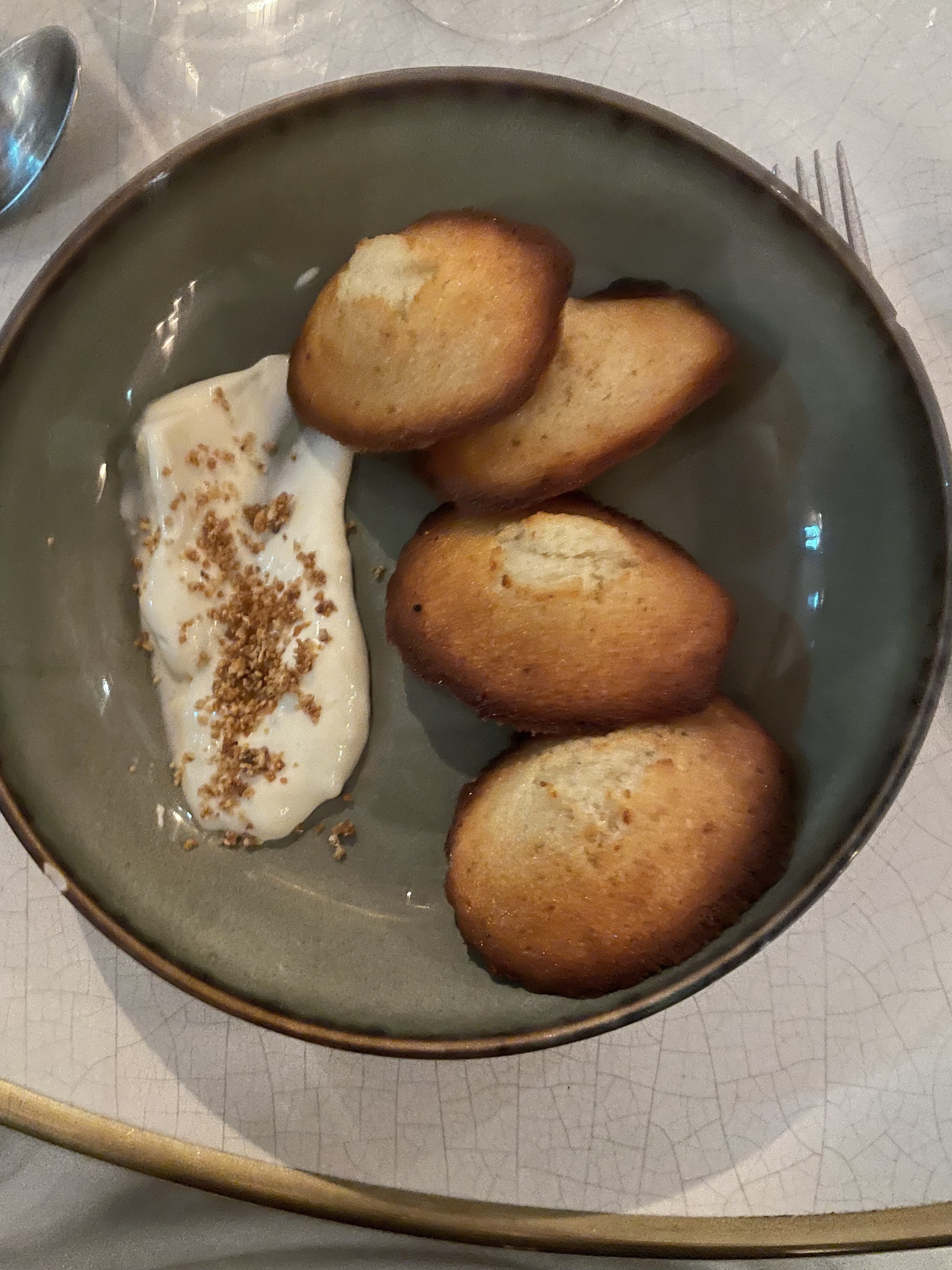 Très bons plats dans l’ensemble . Petit coup de cœur pour le dessert aux madeleines qui est très régressif. Le point - c’est l’entrée de tomates qui manquait cruellement d’assaisonnement.