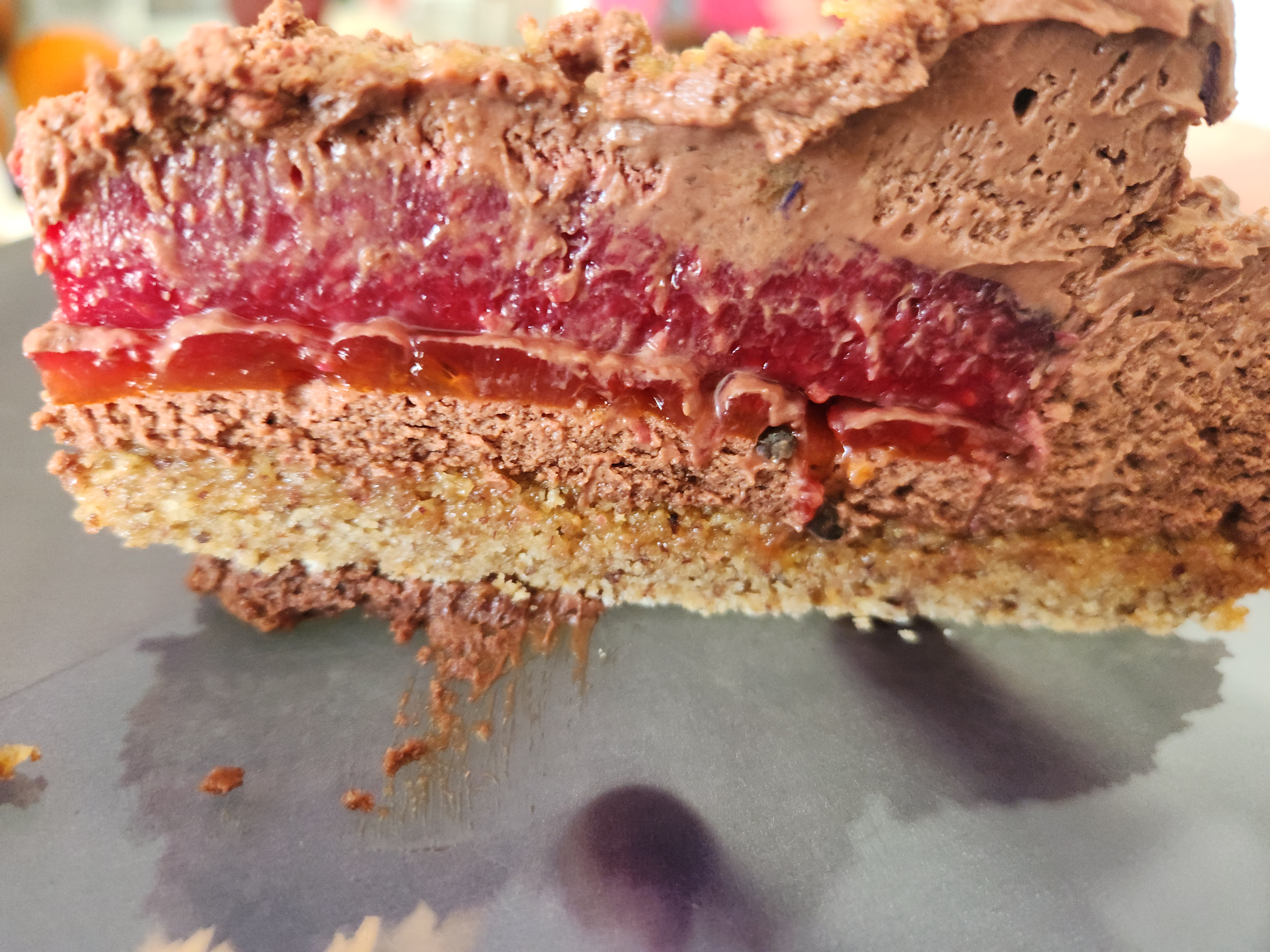 Incroyable gâteau sans lactose ni gluten... pas fan de chocolat mais là bravo Mme ! Mousse chocolat /insert framboise/insert passion / dacquoise amande. Équilibre, légèreté, texture, une claque! Désolé pour la photo dernière part disponible ...