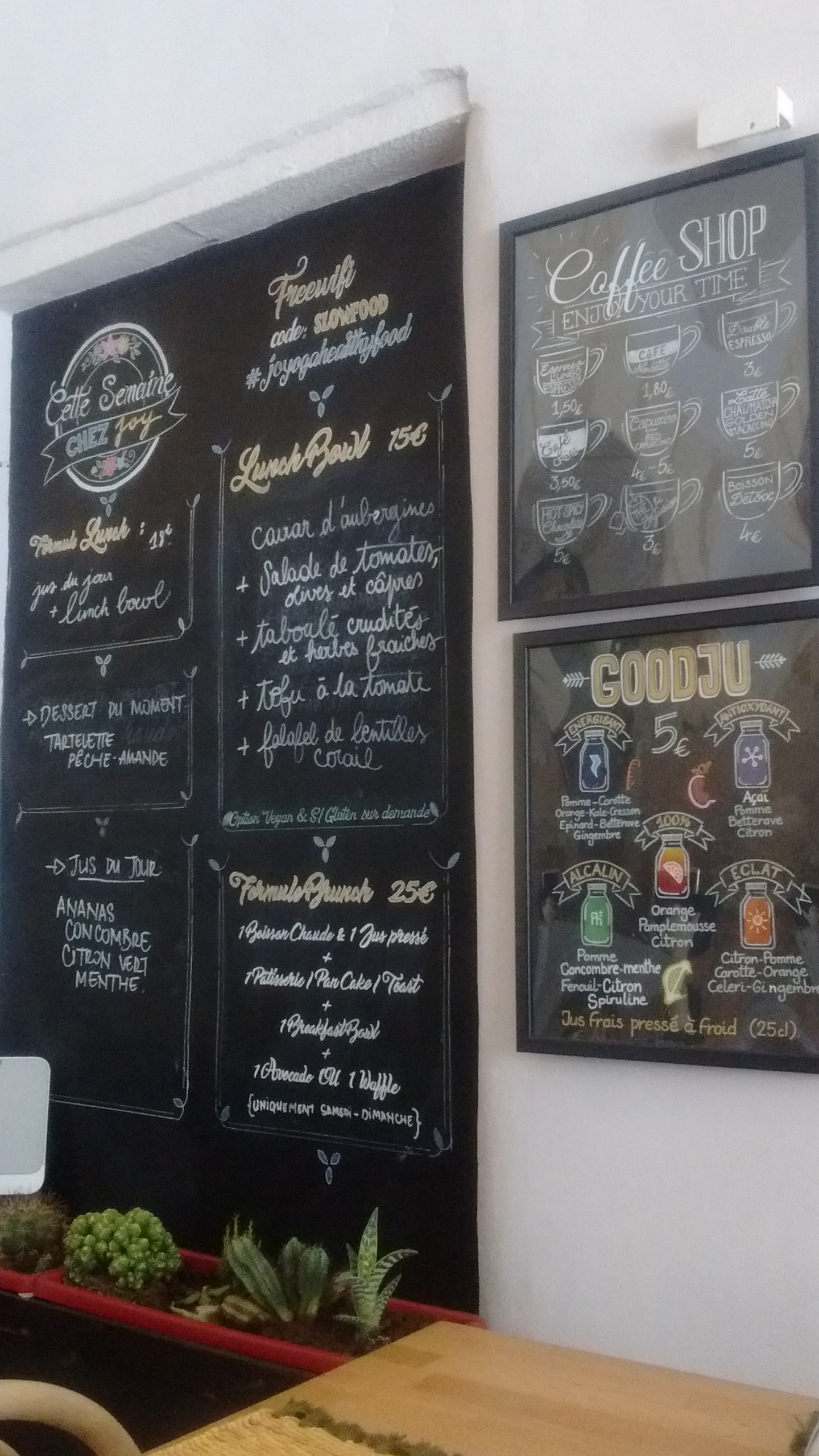 Un endroit charmant, on l'on se sent comme à la maison. Une cuisine (ouverte) végétarienne pleine de saveurs (choix vegan et sans gluten), des desserts gourmands, un grand choix de boissons froides et chaudes toutes aussi delicieuses les unes que les autres. L'établissement propose également un brunch le dimanche (SUR RÉSERVATION) avec un plat salé et boisson chaude au choix, un jus frais, et un buffet sucré salé à volonté. Le seul problème: être plus fort que la petite voix dans sa tête qui dit retourne au buffet te servir. Une équipe de supergirls, puisque pas un mec, que des jolies filles (oui il faut le dire) souriantes, qui seront là pour vous conseiller, et vous cuisiner de bons petits plats ! EnJOY Healthy Food