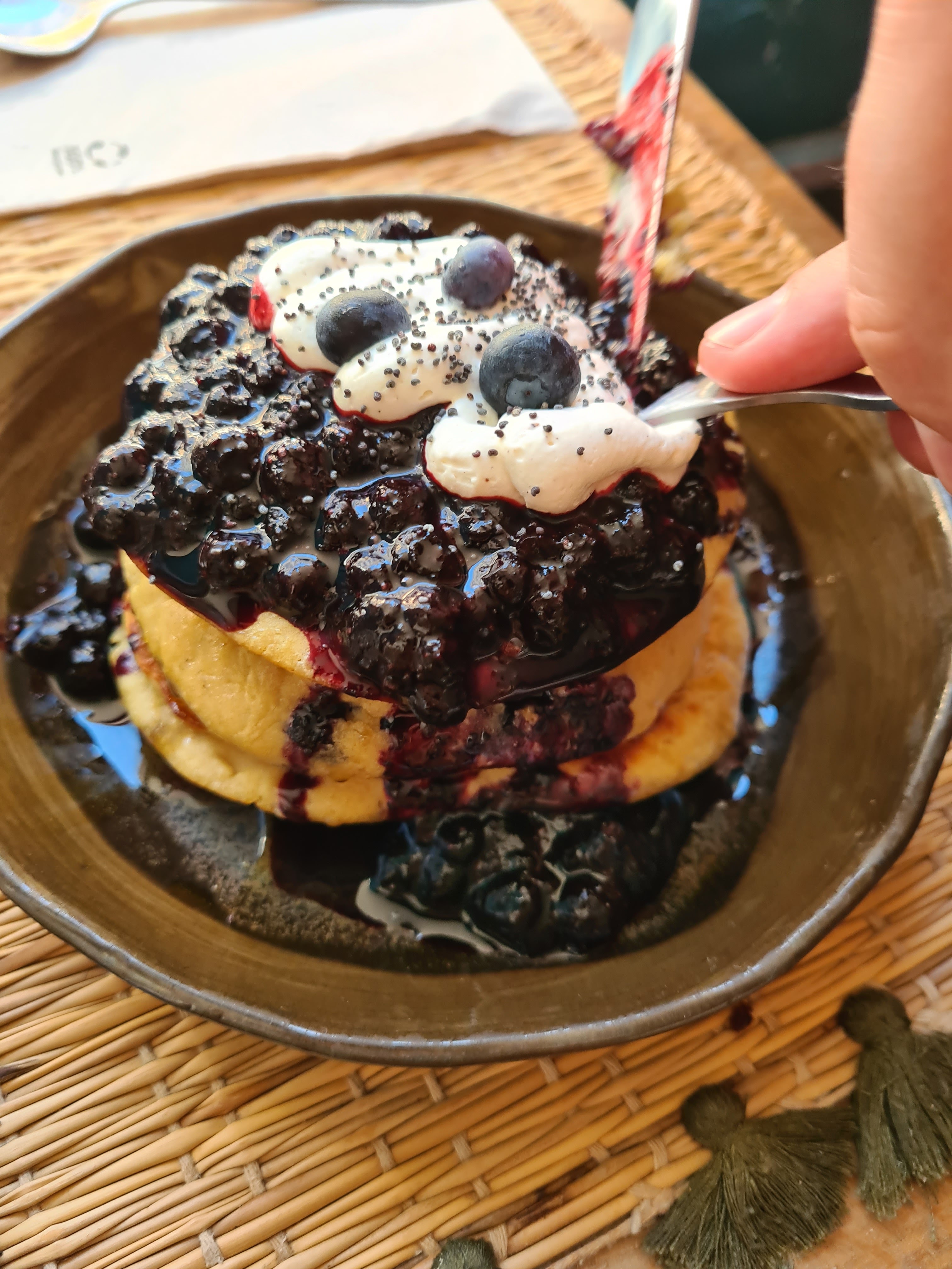 Habitués à une cuisine gourmande, super créative et surtout généreuse, la nouvelle formule ne me séduit pas vraiment… commande directe (pratique mais pas mal de queue), beaucoup d'attente une fois commandé (25-30mn) et surtout peu de choix en plats principaux à 13h alors que le service est en continu jusqu'à 18h, il aurait fallu prévoir un peu plus pour un samedi. Recette de saison : Joy Bowl, un curry intéressant mais dans une quantité très limite pour un plat à 16€. Pas de fantaisie, juste des légumes, pois chiches et quelques pousses. Resté sur ma faim. Blueberry Pancakes : gourmands, mais arrivés froids (précuits ?), c'est dommage pour des pancakes. C'est assez triste car très bonne adresse que j'avais en tête à chaque retour sur Montpellier ! Un petit goût amer donc.
