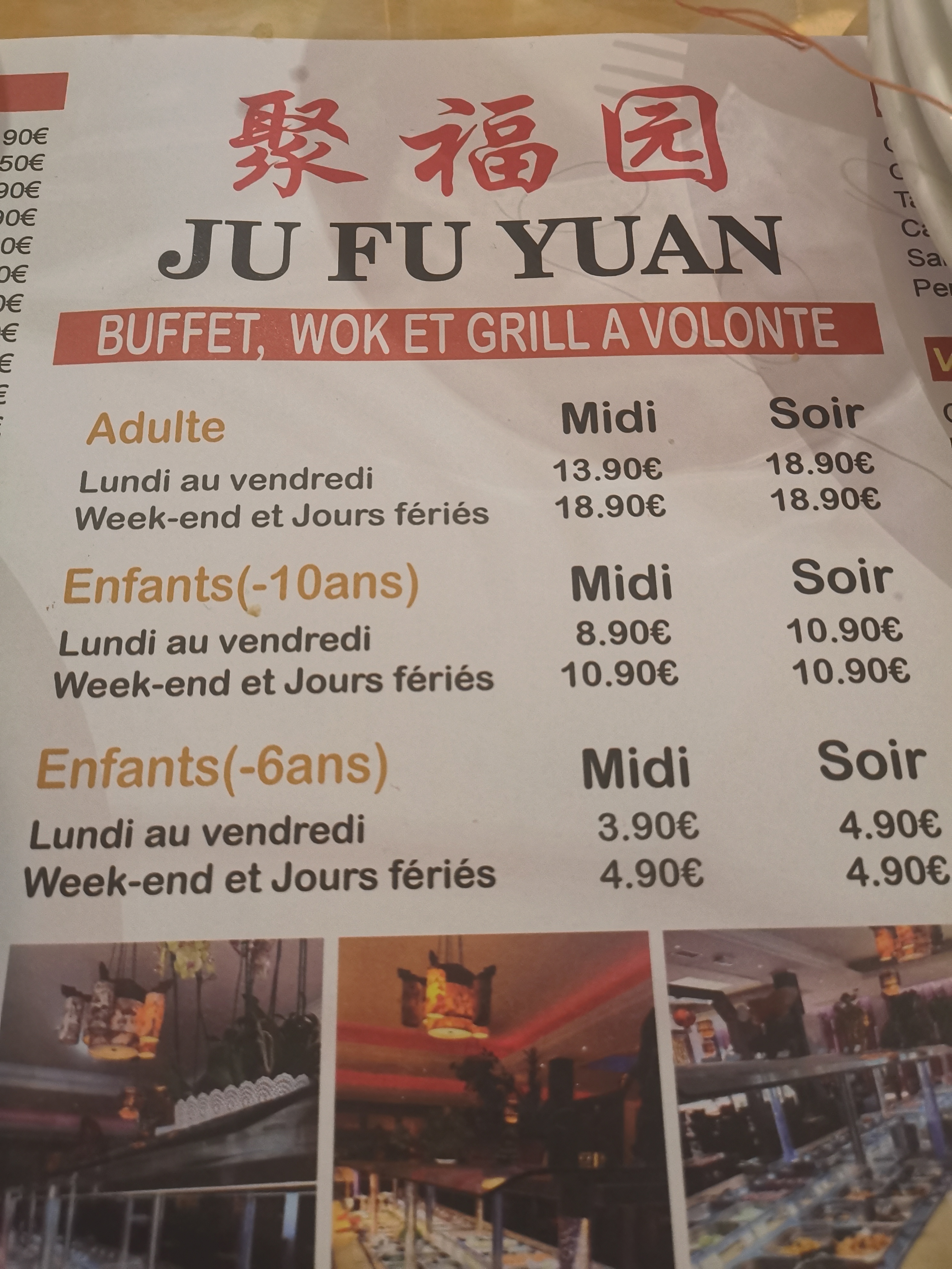 Restaurant à fuir, serveur mal aimable répond vulgairement au clients suivis d'une remarque à sont collègue je site ( Qu'il vient sont mec il vas voir) car la cliente étais mécontent de devoir payé avant de mangé de plus habillé en jogging pour servir il lance des regard pendant tout le repas ambiance mal saine du moment où ont vous demande de payé avant le repas pour que vous ne partez pas sans payé... Si vous avais le malheur de dire votre mécontentement ont vous dit d'aller voir ailleurs. Qualité du repas bas de gamme pour le prix qui est plutôt exorbitant pour du congelé de A à Z tout provient du Lidl en face du restaurant ont revient du repas avec un mal de ventre c'est pourtant pas le fait d'avoir beaucoup mangé puisque à chaque assiettes le serveur vous regarde comme si vous lui volé sont goûté. Horrible comme expérience. Nous sommes arrivé à l'ouverture du soir et le sol collé en dessous de notre table. Si vous voulez une scène digne d'une caméra cachée de François l'embrouille bienvenu à Ju Fu Yuang !!