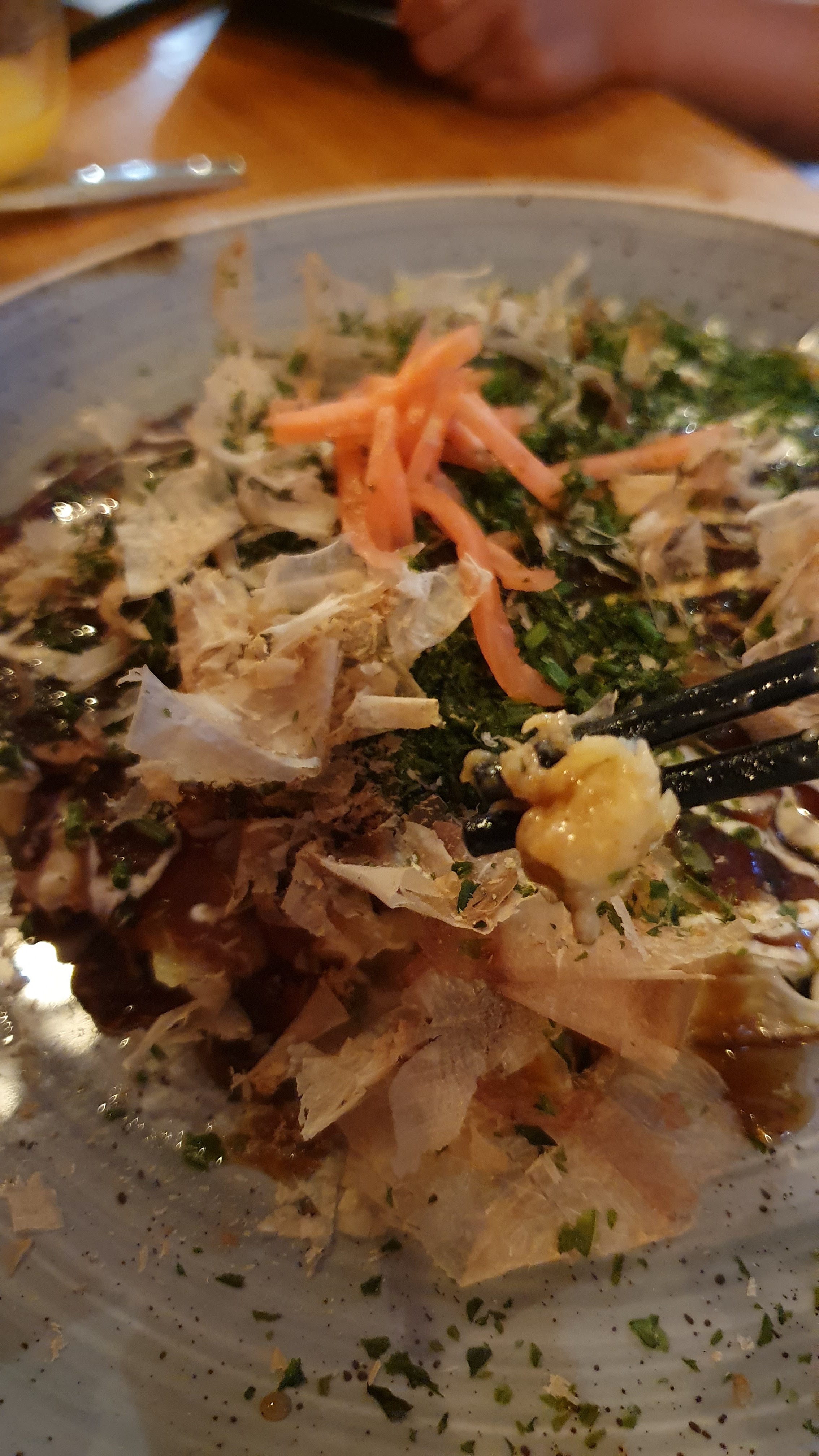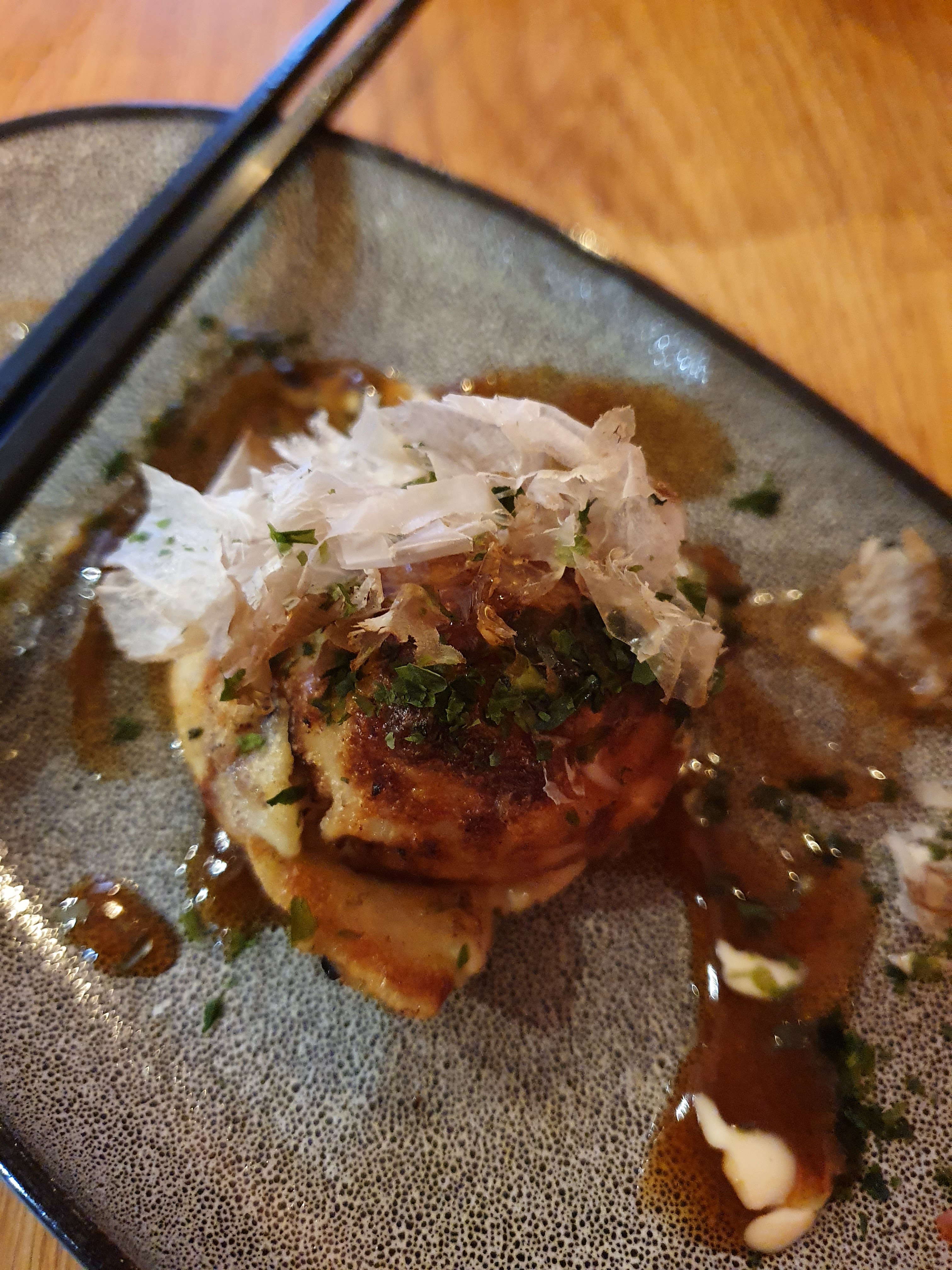 Découverte de l'Okonomiyaki, original . J'ai pris celui au crevettes et à la sèche, c'est bon mais la sauce au poisson est un peu trop salé et gâche un peu le goût du plat. Ma compagne a pris des nouilles, bien aisaissonnées mais rien de nouveau. Nous avons aussi pris des entrées , les gyozas étaient bonnes par contre il n'y avait qu'un petit bout de tentacule de poulpe dans les takoyakis, c'est peu . Service impeccable , à l'écoute et force de proposition