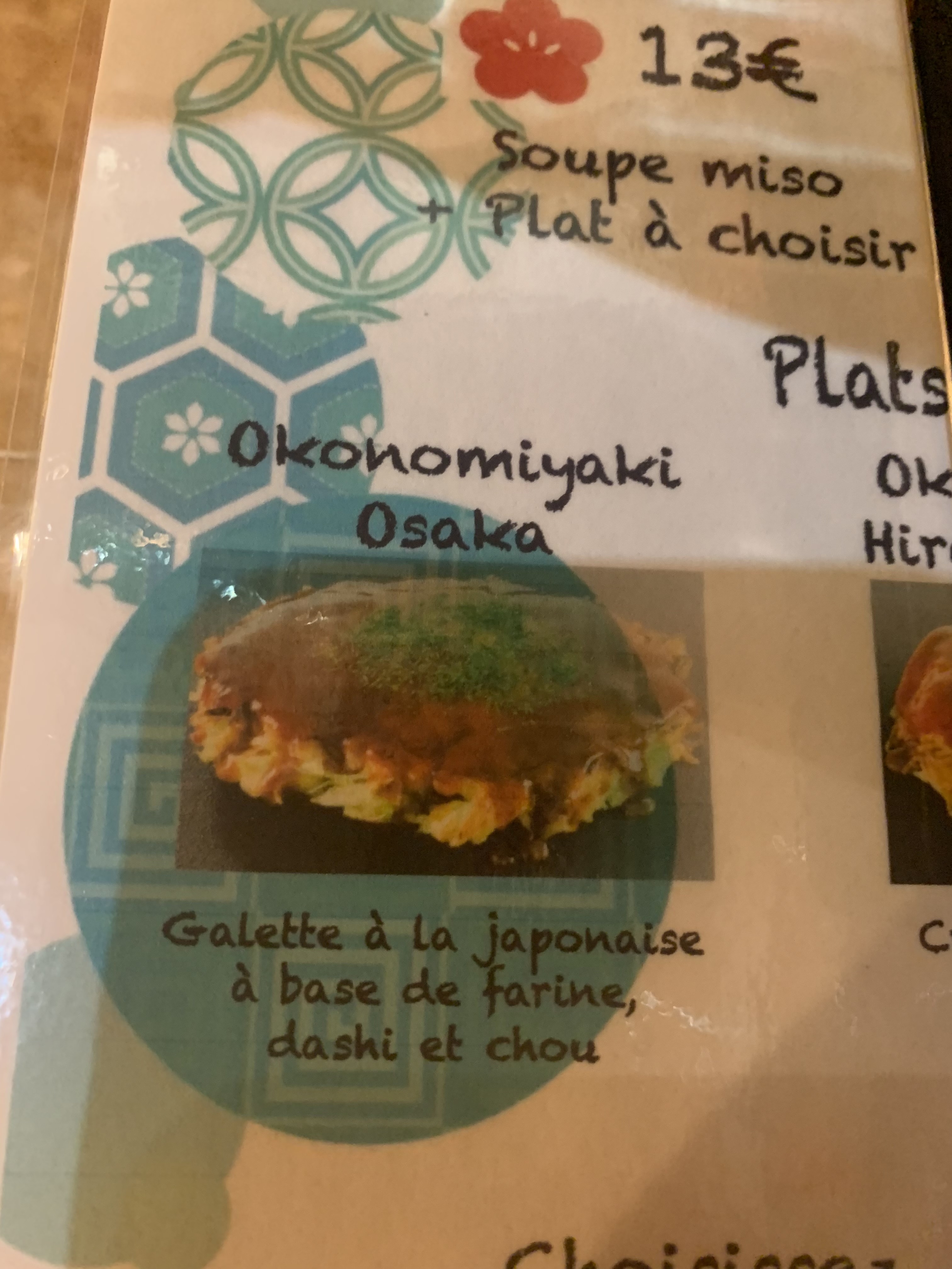 Menu à 15€ soupe+okonomyaki+dessert Très copieux et très bon. Le cheesecake sésame noir était excellent. Je recommande