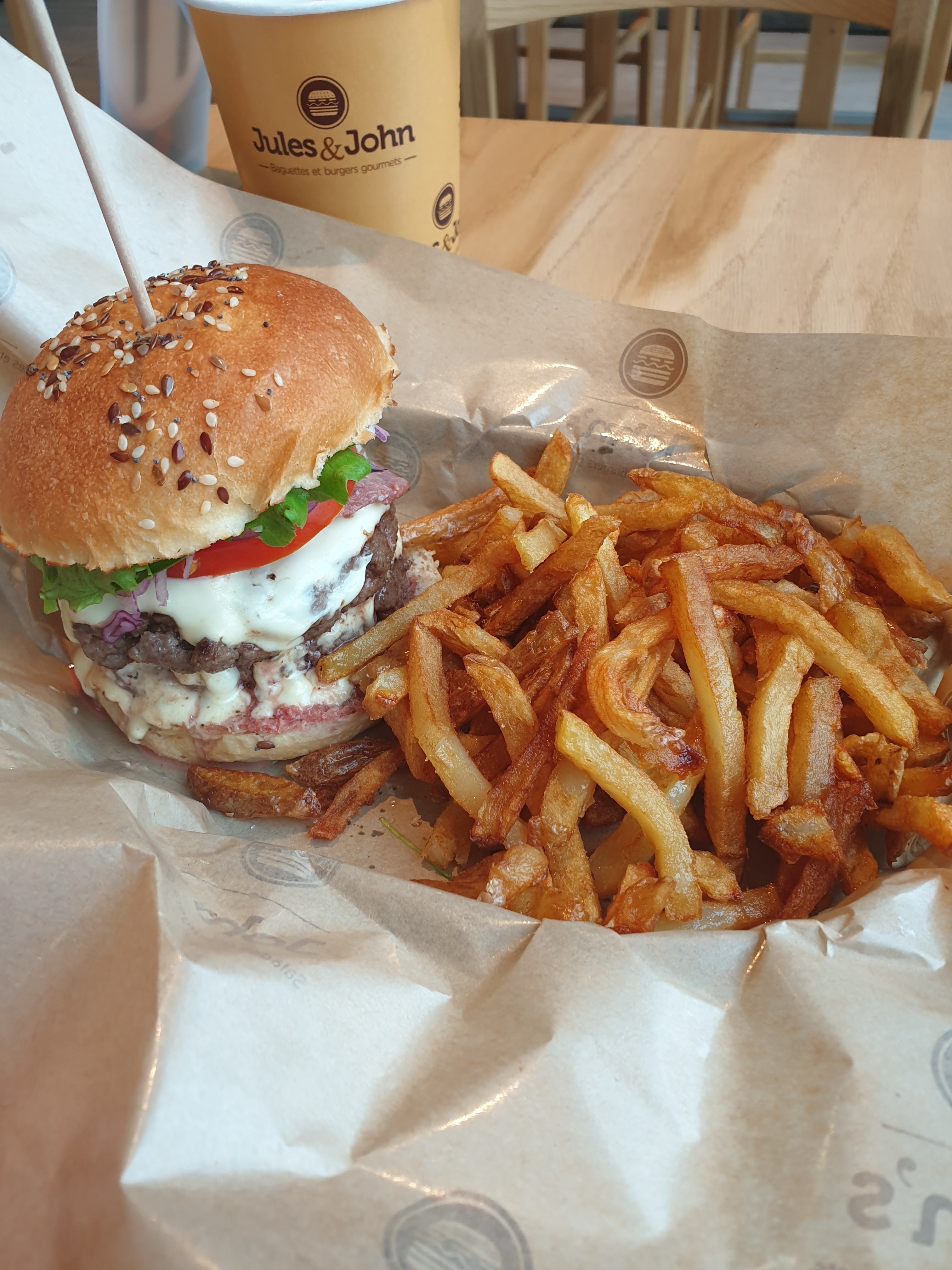 1ere expérience par hasard......le hasard fait bien les choses. Très très satisfaite. Belles découvertes de salades exquises et hamburgers originaux. Personnel pro, agréable, poli et très serviable. Je recommande vivement . J'étais adepte d'une grde marque.....Ben elle peut se faire petite par rapport à Jules&John. Merci pour ce bon moment