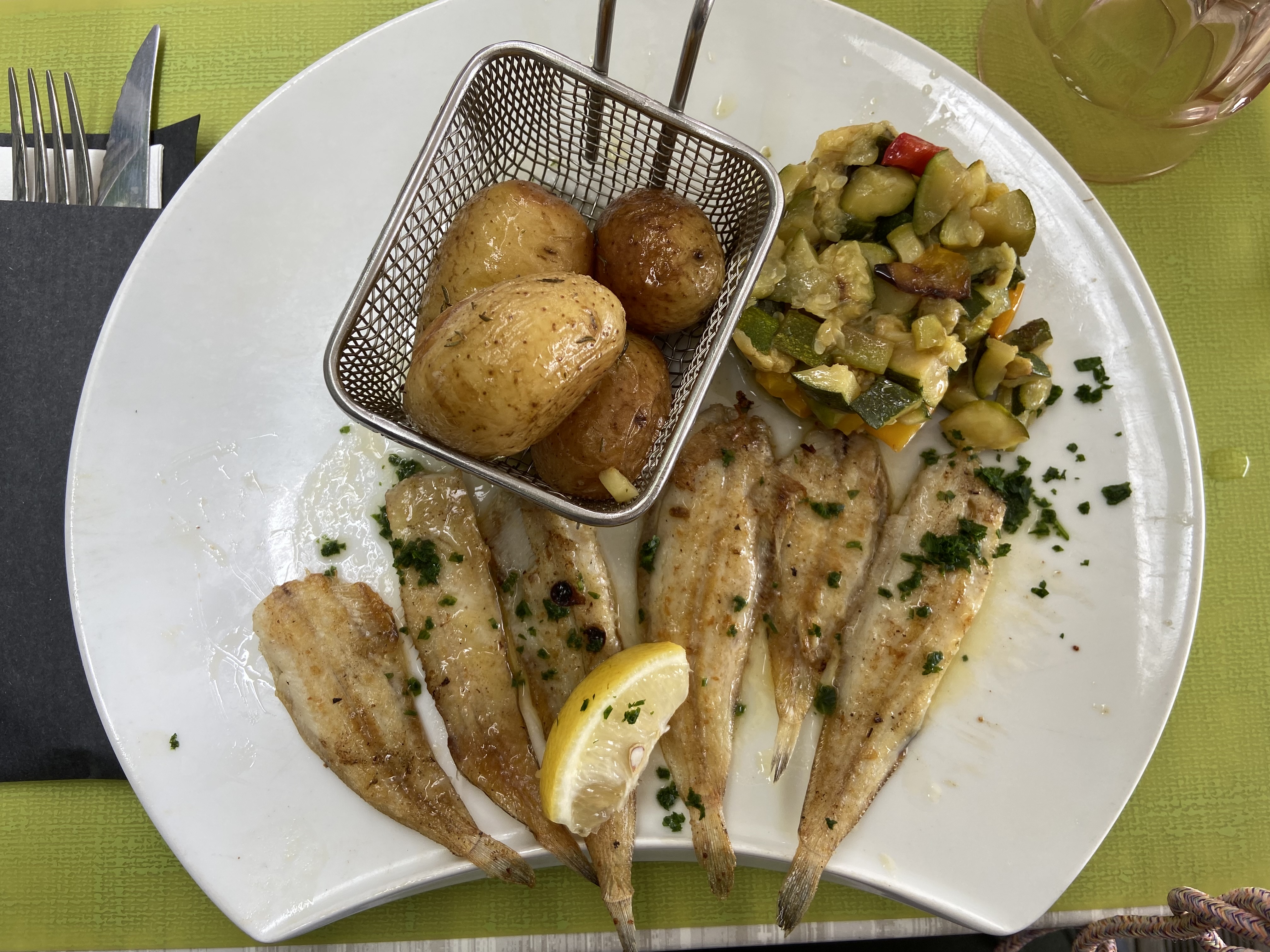 Accueil très sympathique. Apéritifs cocktails ok. Prise de commande sur le pouce. Sardines grillées en entrée ça part très bien. Seiches en persillade en plat je cherche les seiches et la persillade déçu. Mon verre de vin blanc arrivera après mon plat fini. Très déçu.
