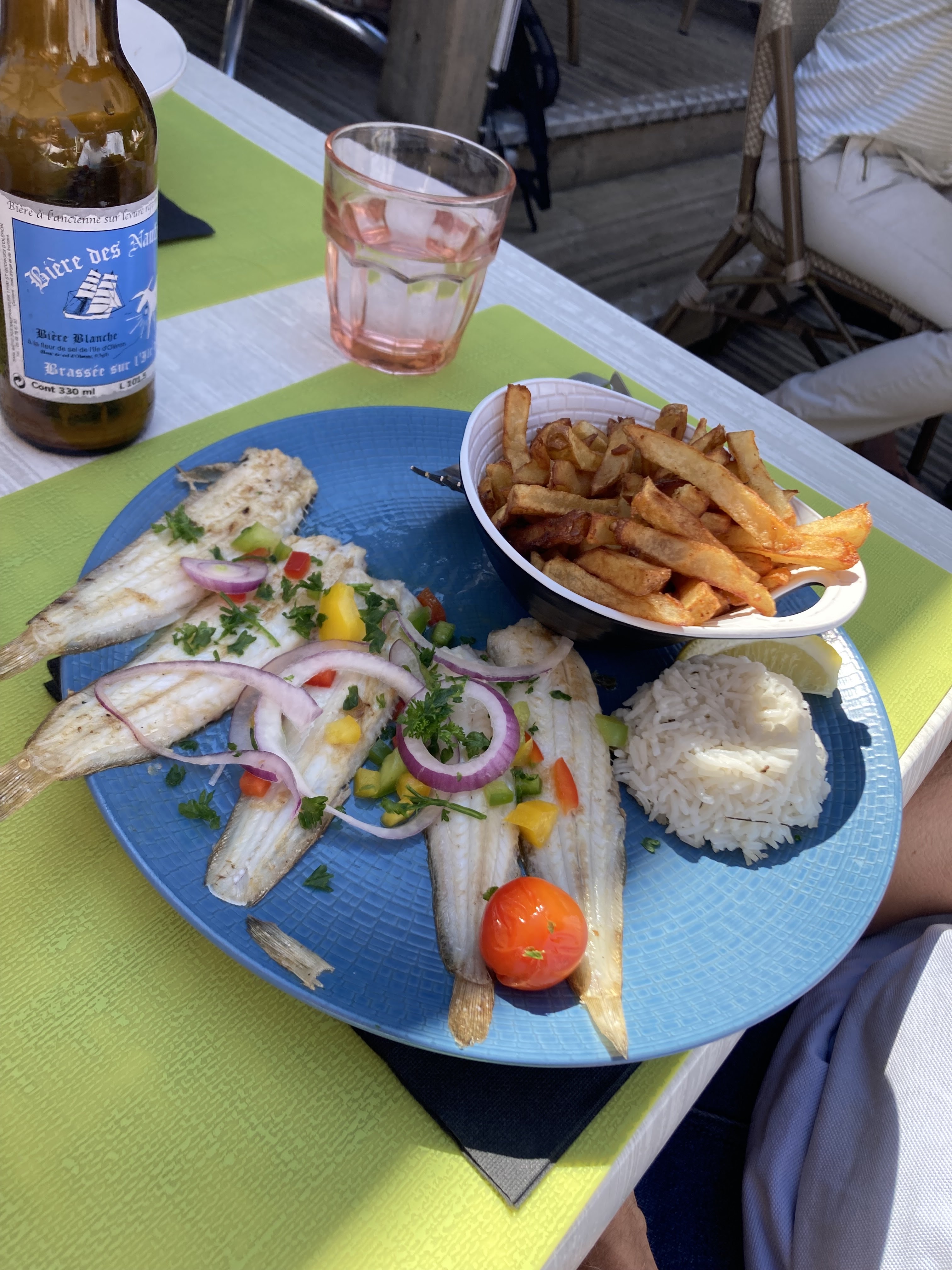 Belle terrasse, personnel très sympathique, prix raisonnable, j'ai pris des cétaux de la cotiniere (5 pièces dans l'assiette) avec frites maison pour 17 € , crêpe dessert très bonne aussi, bref je recommande