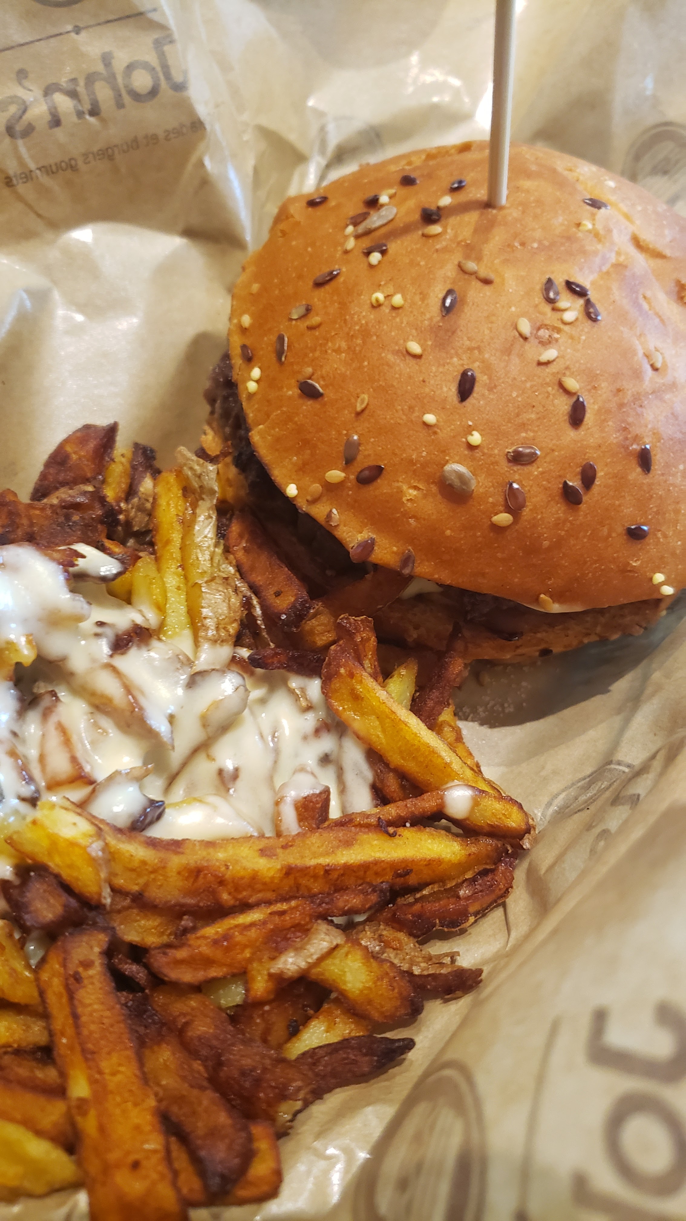 C'est la deuxième fois que je mange un burger chez Jules et John à chaque fois les burgers baignent dans la sauce ce qui ramollit le pain et c est pas pratique a manger . les frites sont toutes petites et trop grillées la première fois je me suis dit que j'étais tombé sur un fond de panier mais là je me rends compte qu elles ont toujours la même dimension réduite et la meme surcuisson c'est dommage car le goût est là.