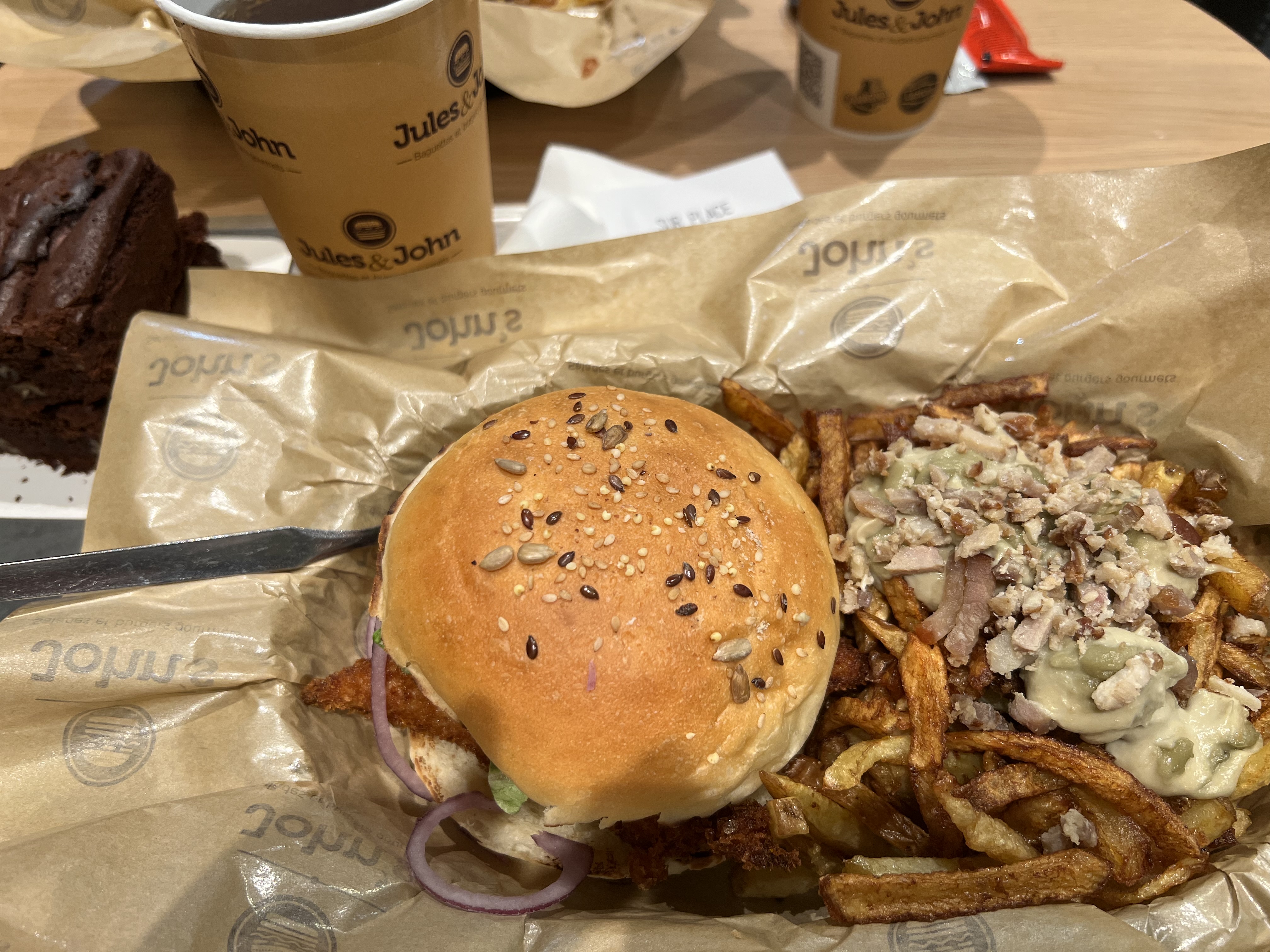 Jules et John propose une partie boulangerie et une partie restauration. Le pain est bon les pâtisseries sont sans plus. En revanche, leurs burgers et salades sont très bons. C'est un très bon rapport qualité-prix. Les burgers et salades sont fait avec des aliments frais qui font la différence. Je recommande donc cet établissement