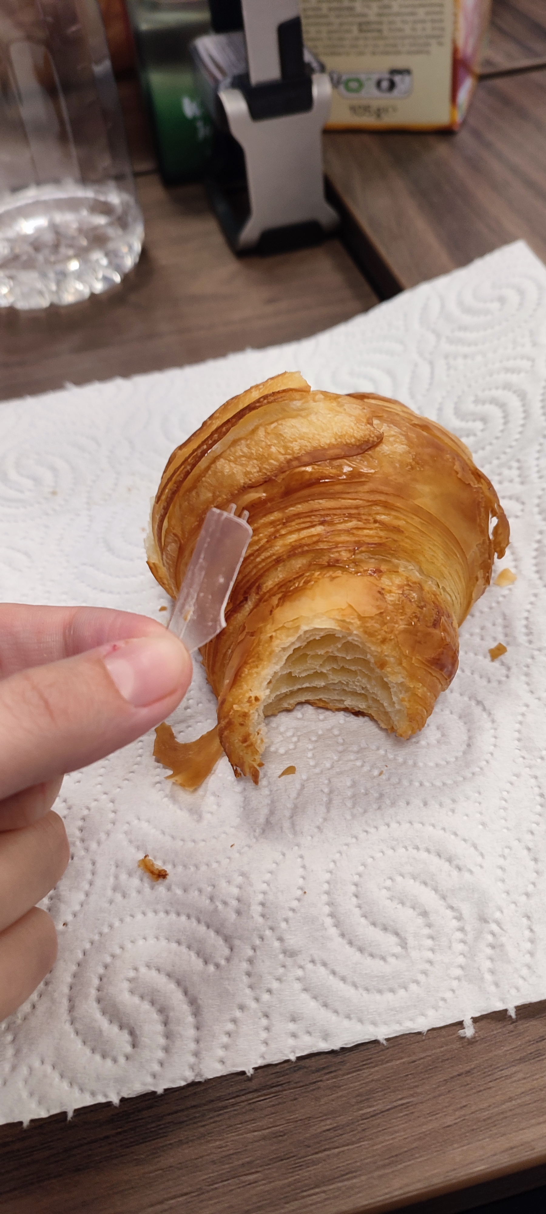 Petite surprise à l'intérieur du croissant acheté ce matin .. heureusement que ce croissant n'était pas pour un enfant, cela aurait pu être dangereux.