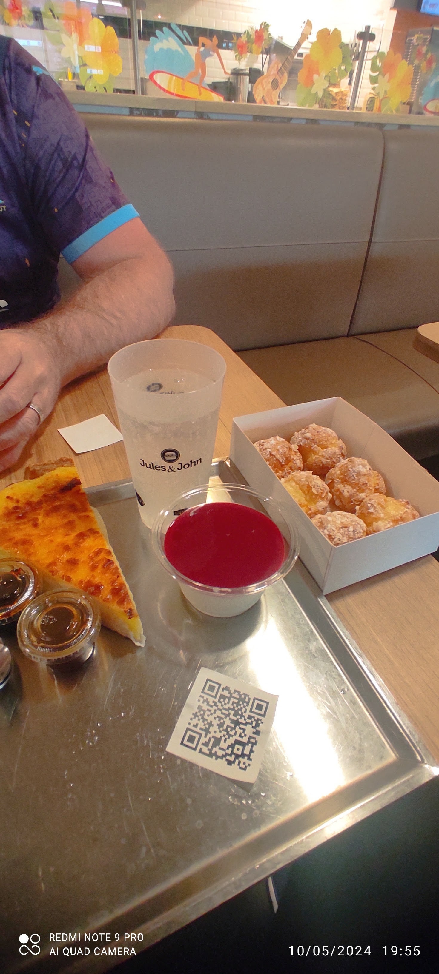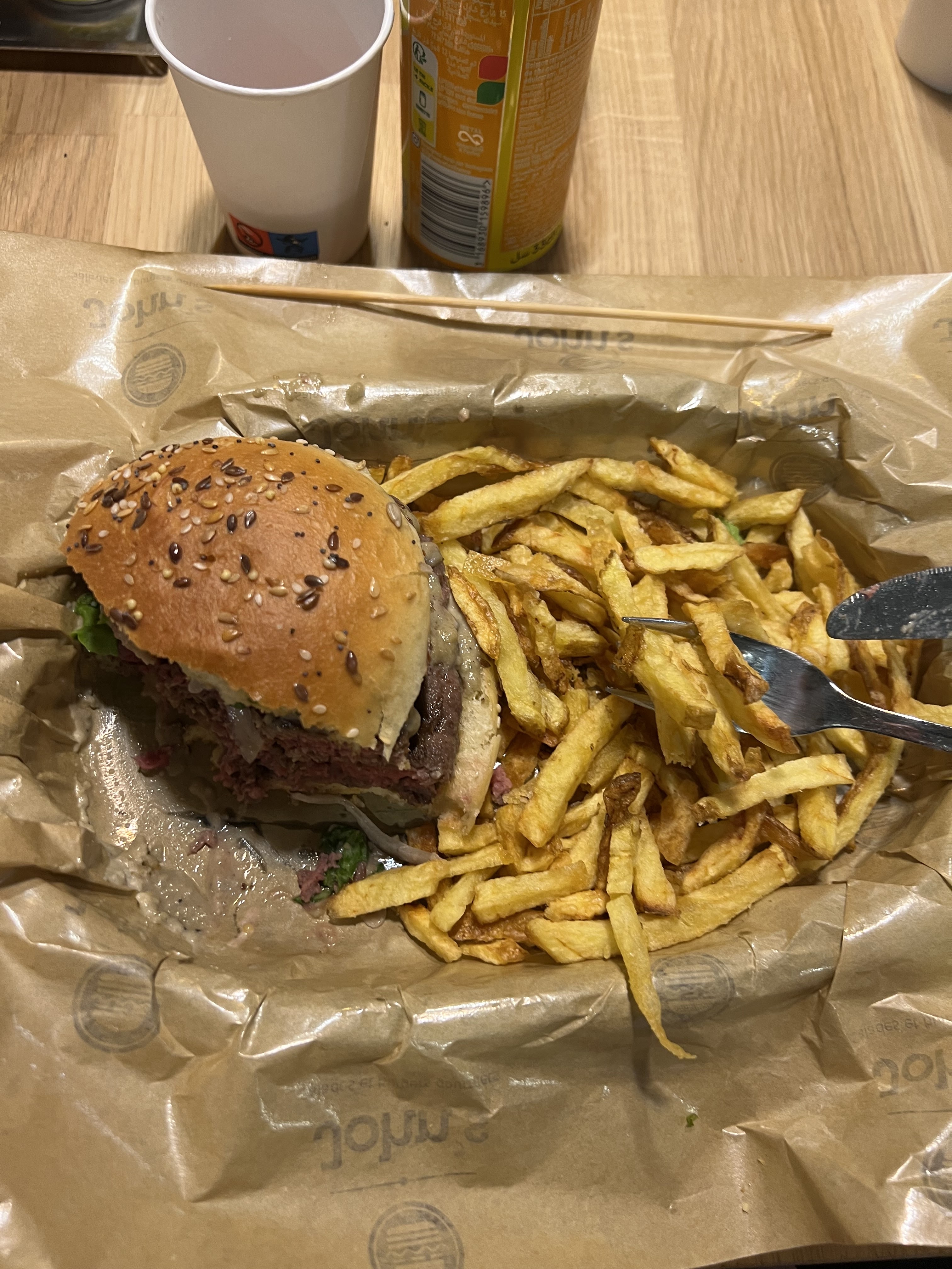 Pas forcément d’attente mais une cheffe qui cherche à motiver tout le long son équipe pour accélérer le rythme! Et ça se fait ressentir… En attendant, on boit notre boisson, dont on a eu du mal à se servir car le système de QRcode est difficile à s’approprier et avec la mousse le verre n’est pas entièrement pleins…(heureusement qu’il nous redonne un verre.. avec 2 verres on arrive a en faire un!) et on découvre plus tard qu’on aurait peut être pu prendre des glaçons?!… on regarde patiemment notre dessert se réchauffer quand nous sommes enfin servit à table.. Les frites + cheeses sont un peu trop grasse à mon goût.. et les « miettes » de frittes sont assez dur à manger. Vive la « fabrication maison » mais on fait mieux chez nous finalement 😅 Niveau développement durable peut mieux faire surtout maintenant que tous les autres fast food sont passés au non-jetable. Un tour rapide aux toilettes pour constater une robinet cassé et un vieux sèche main qui n’existe plus de nos jours … pour nous dire qu’on ne reviendra sûrement pas ici.. Mais où sommes-nous? Le nom n’est même pas affiché à l’intérieur de la salle… mauvais point marqueting!