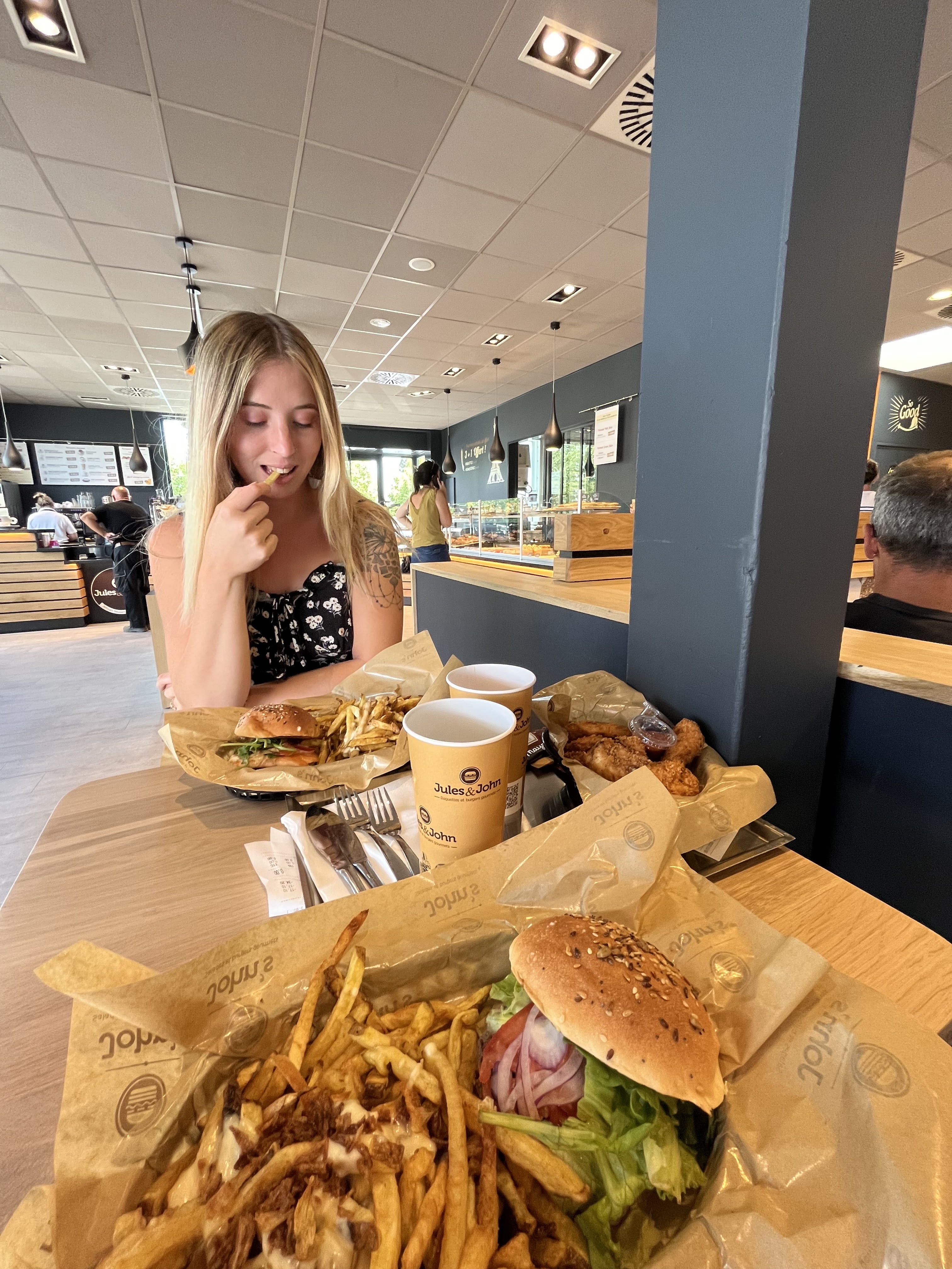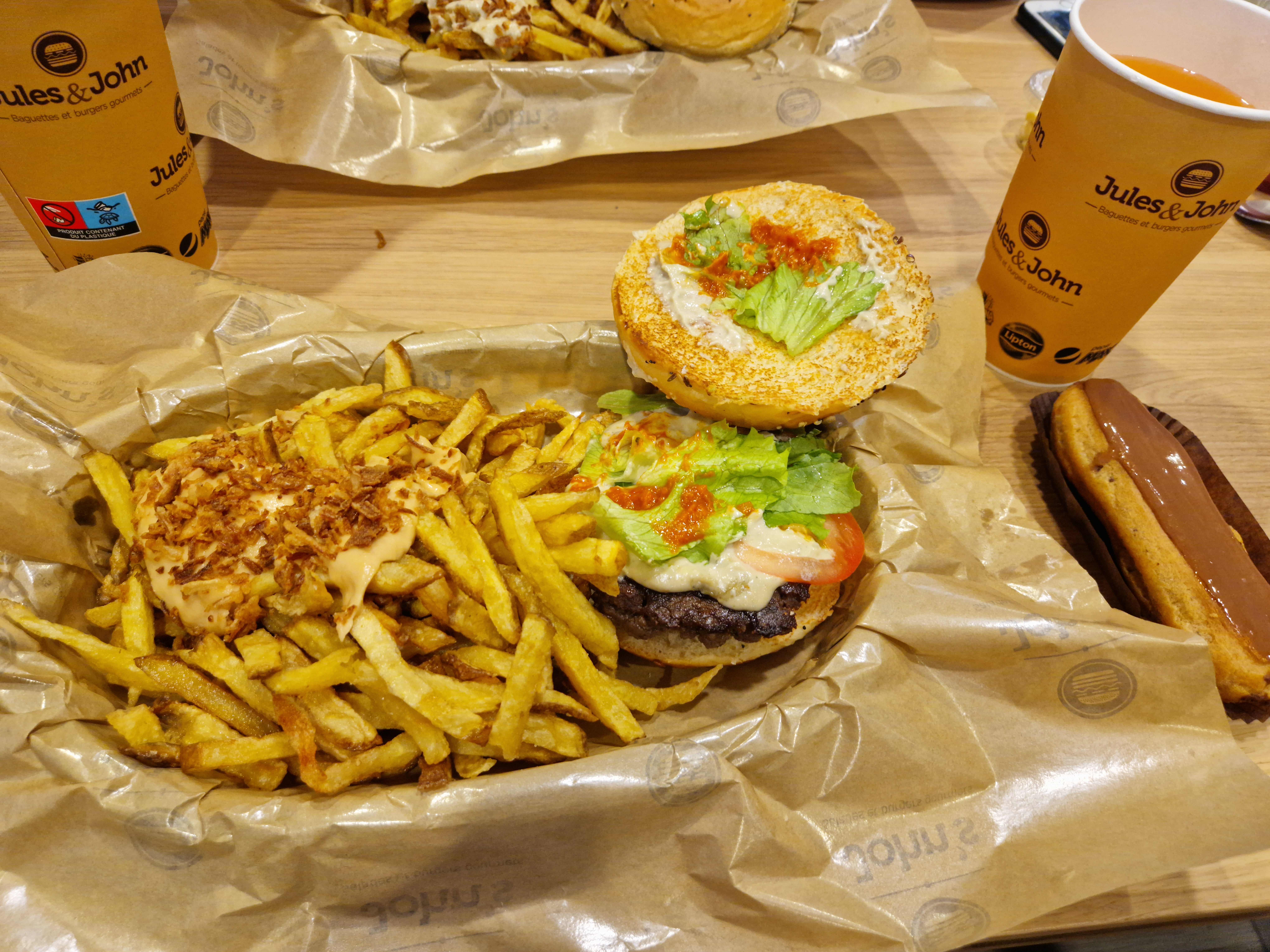 Première visite chez Jules & John car on en avait marre de toujours aller chez Burger King juste à côté. En plus, la dernière fois on a mis au moins 12h pour digèrer notre repas... Superbe ambiance très sympa et cosy avec des banquettes moelleuses, il y a même des canapés style anglais très confortable. On commande sur une borne comme c'est le cas partout aujourd'hui dans les fast food. Et encore, je ne sais pas si je le qualifierai comme un fast food justement grâce à l'ambiance... Beaucoup de choix de burgers ou de belles salades. Les ingrédients sont frais et les frites maison. Votre burger est servis dans un bun moelleux et vous choisissez avec la formule complète, avec 2 possibilités, avec ou sans dessert. Vous choisissez la cuisson de votre steack pour le burger, ça fait plaisir de ne pas manger de la semelle, moi qui mange mon steak bleu, là j'ai choisi saignant. Au fait, j'ai payé 46,20 euros pour 4 avec des supplements fromage + lardons dans les frites. Les burgers sont bien préparés comme sur les photos, sauf que les steaks sont moins épais. Frites maison délicieuses servies en grande quantité. La salade d'accompagnement au lieu des frites mériterait d'être un peu plus consistante. Je vous laisse apprécier mes photos. Juste un point négatif, on vous sert dans un plateau et des couverts pas très propres, encore humide et avec des traces...