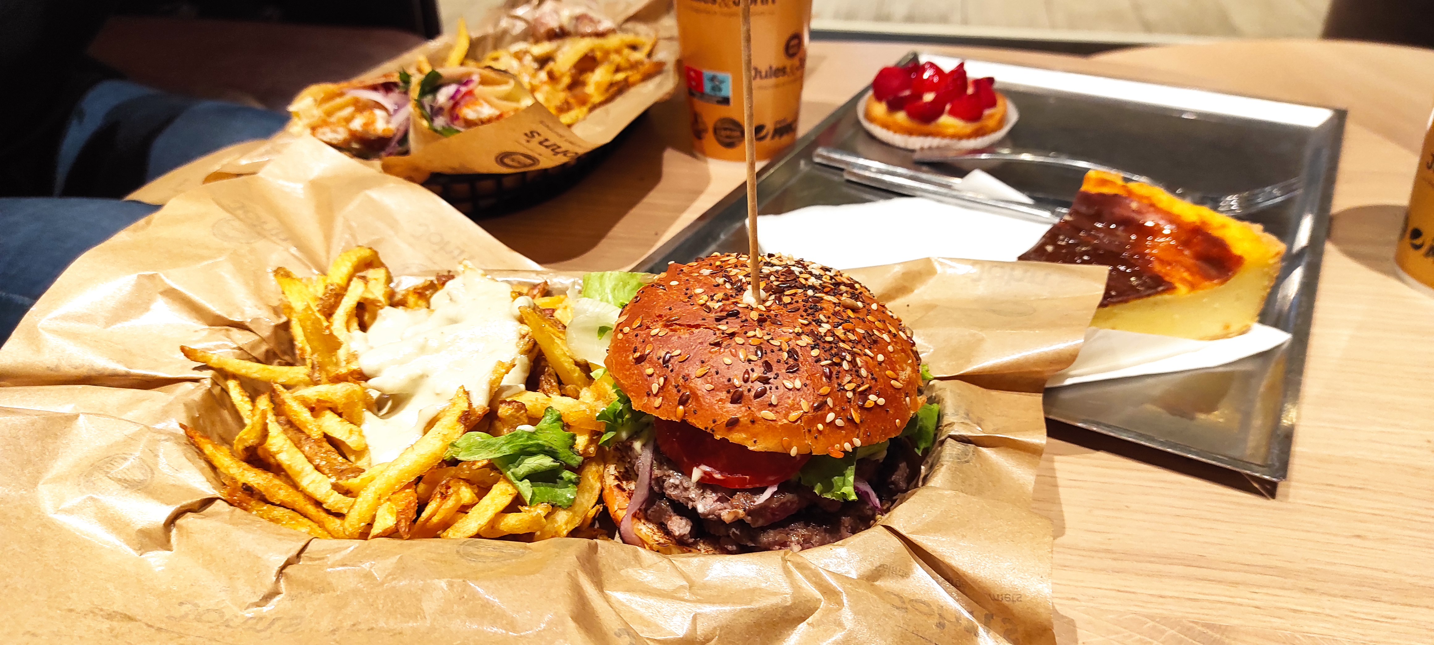 Excellent burger naturel comme ils l'appellent chez Jules&John. Taille classique (plus petit qu'un Master Burger King ou signature McDo) avec recettes proposées ou possibilité de composer son burger. Pain frais du jour. Pour ma part burger boeuf avocat fourme salade tomate, sauce onion + John. Frites fraîches possible avec sauce au fromage délicieuse (parmesan pour ma part). Prix du menu burger frites boisson dessert 15,90€ avec frites cheesy autrement 14€.