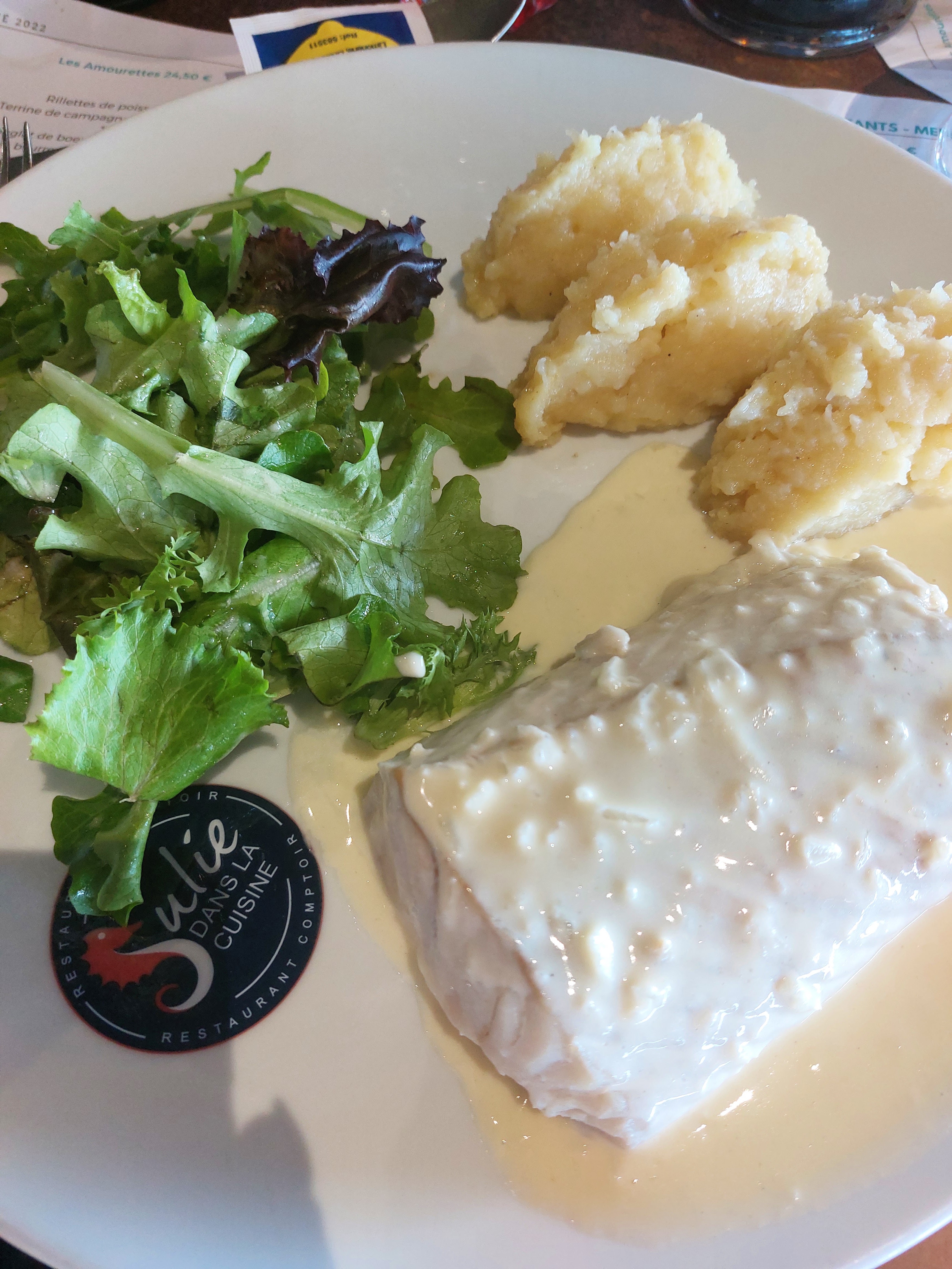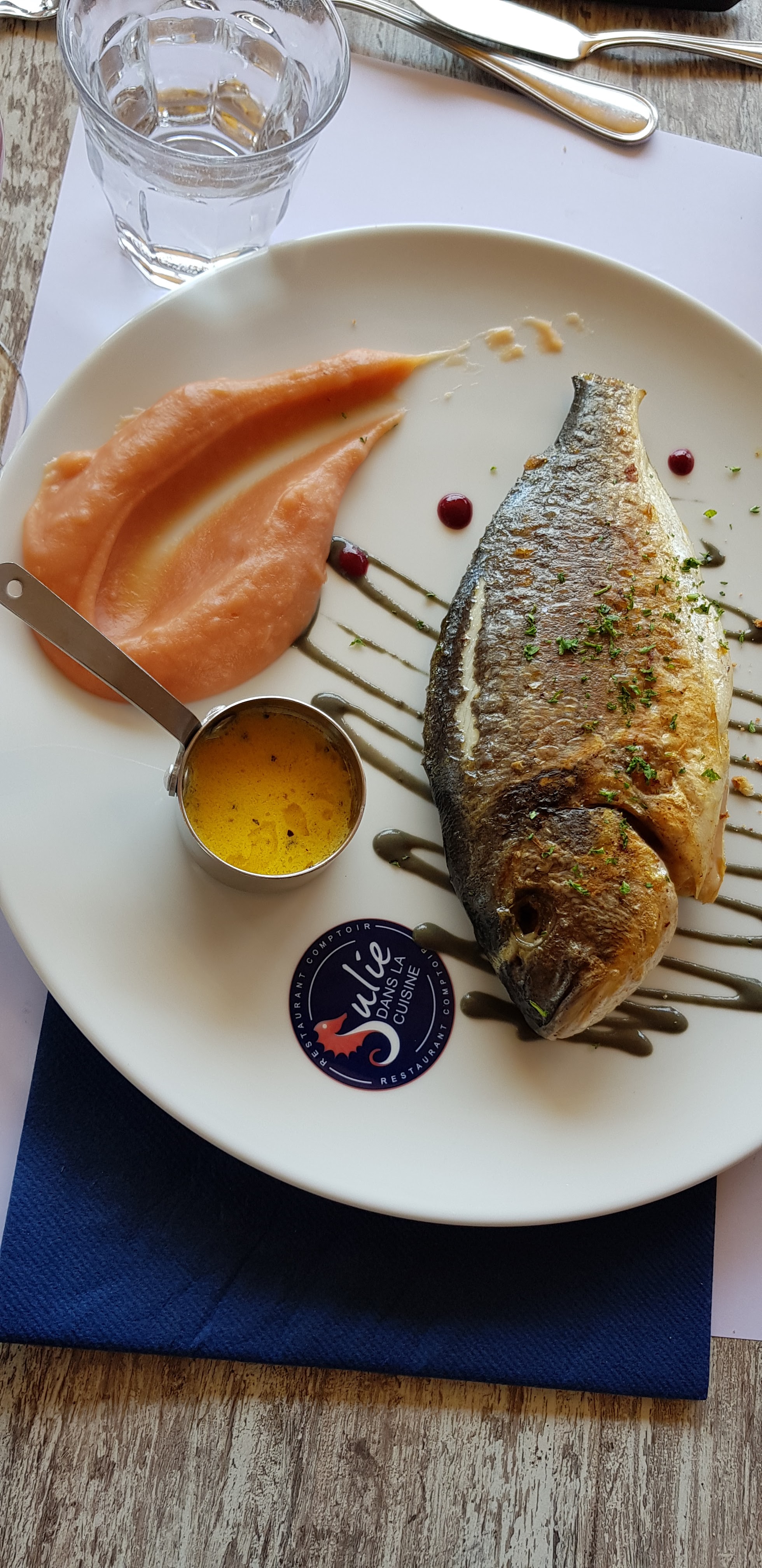 Repas du midi chez Julie en semaine. 1ère impression d'un big resto et la crainte d'être oublié...Et non pas du tout, du personnel nombreux et aux ptits soins. On a passé un bon moment sur la terrasse couverte. 3 menus adultes et un menu enfant poisson du jour. On a adoré le saumon fumé et les gambas risotto accompagné d'un vin blanc local de la maison Mercier (Vix). A bientôt. 👍