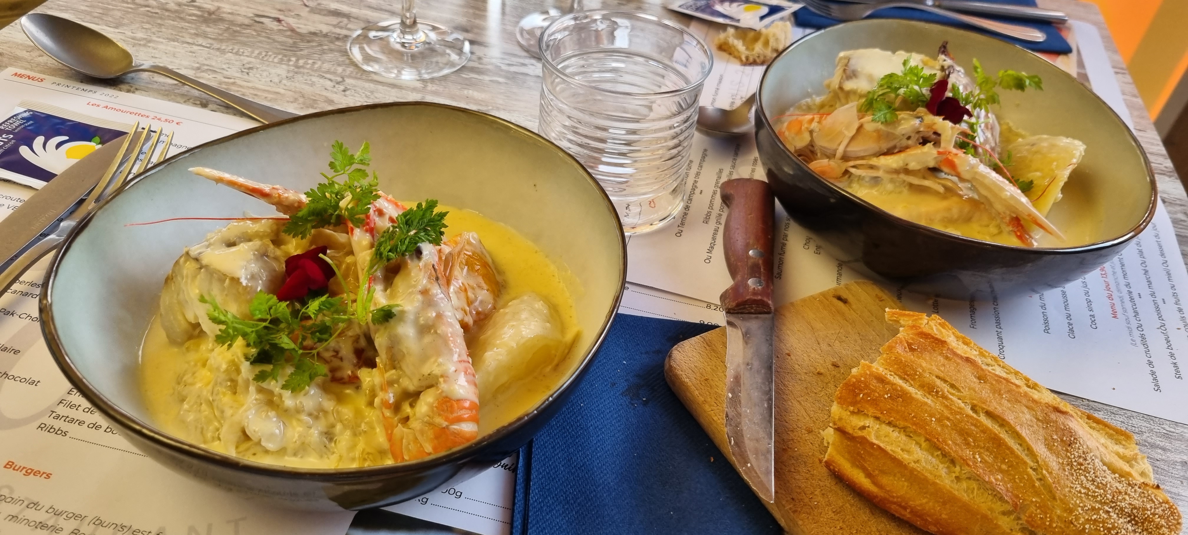 L'endroit magnifique le manger rien a dire. Cuisine crustacés et poissons et viande. Rampe pour handicapé sur bien agencé, petit jardin accueillant pour les enfants et adulte. Le vin très frais et boisson aussi. Les chiens admis et bar a toutou les patrons sont là pour vous bien placé avec les chiens. Une ambiance très agréable, large terrasse grand parking. Et l'intérieur des grands spacieux , si il fait trop chaud vous recevez un brumisateur.