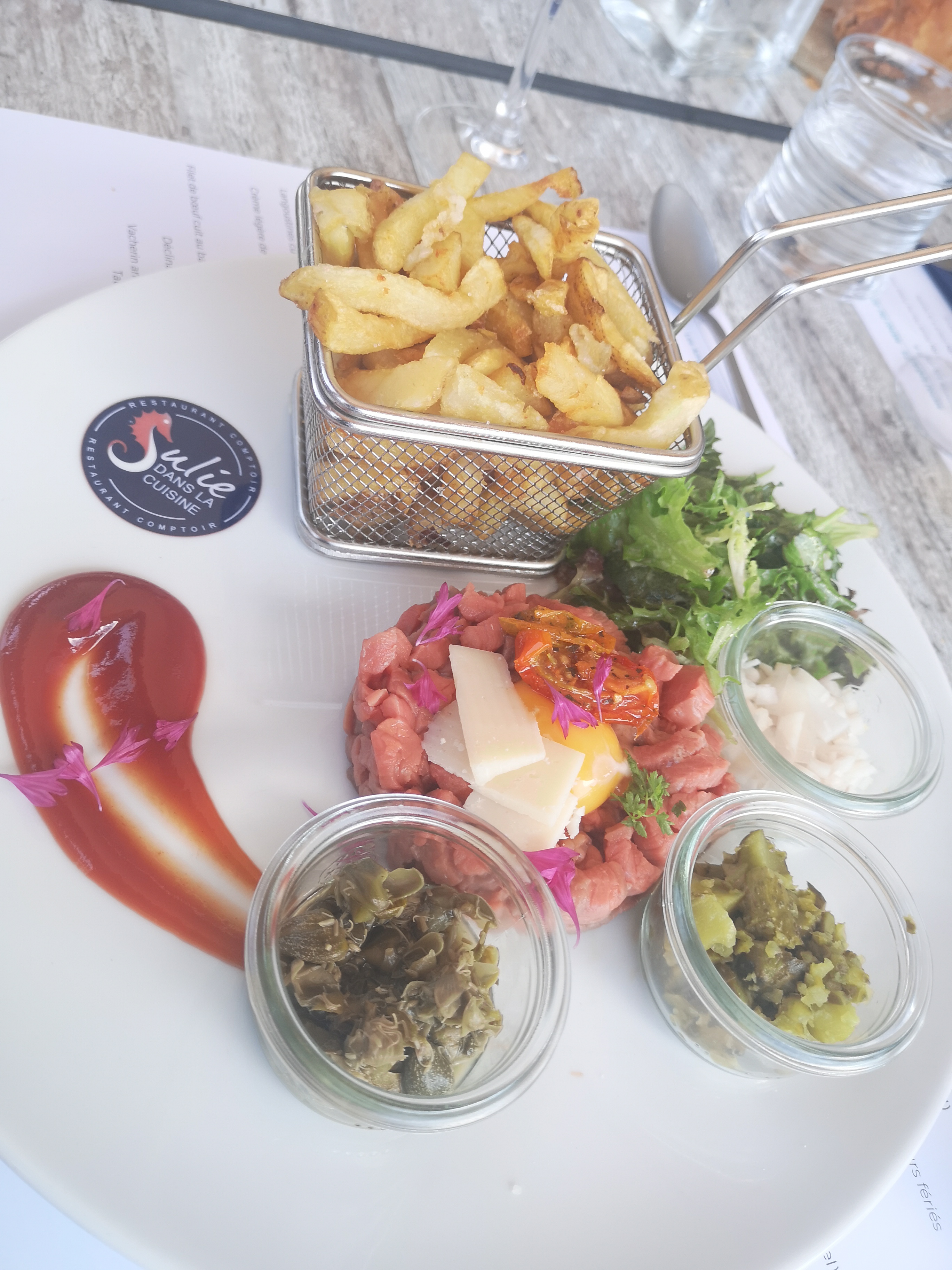 Nous séjournons à La Tranche sur Mer depuis deux semaines et avons mangé 3 fois chez Julie dans la cuisine. Nous avons été impressionnés à chaque fois. Le service est très efficace et le personnel est très accueillant et professionnel. Nous avons essayé plusieurs autres restaurants dans la région mais Julie est un cran au-dessus des autres et offre également un bon rapport qualité-prix. La nourriture est bien présentée et délicieuse. Aujourd'hui, nous avons eu le menu déjeuner à 3 plats avec un large choix pour 13,90 €, pain compris. (3 photos ci-dessous) C'est un peu excentré du centre de L'Aiguillon sur Mer mais ça vaut vraiment le détour. La réservation est conseillée et très simple sur internet. Hautement recommandé!!