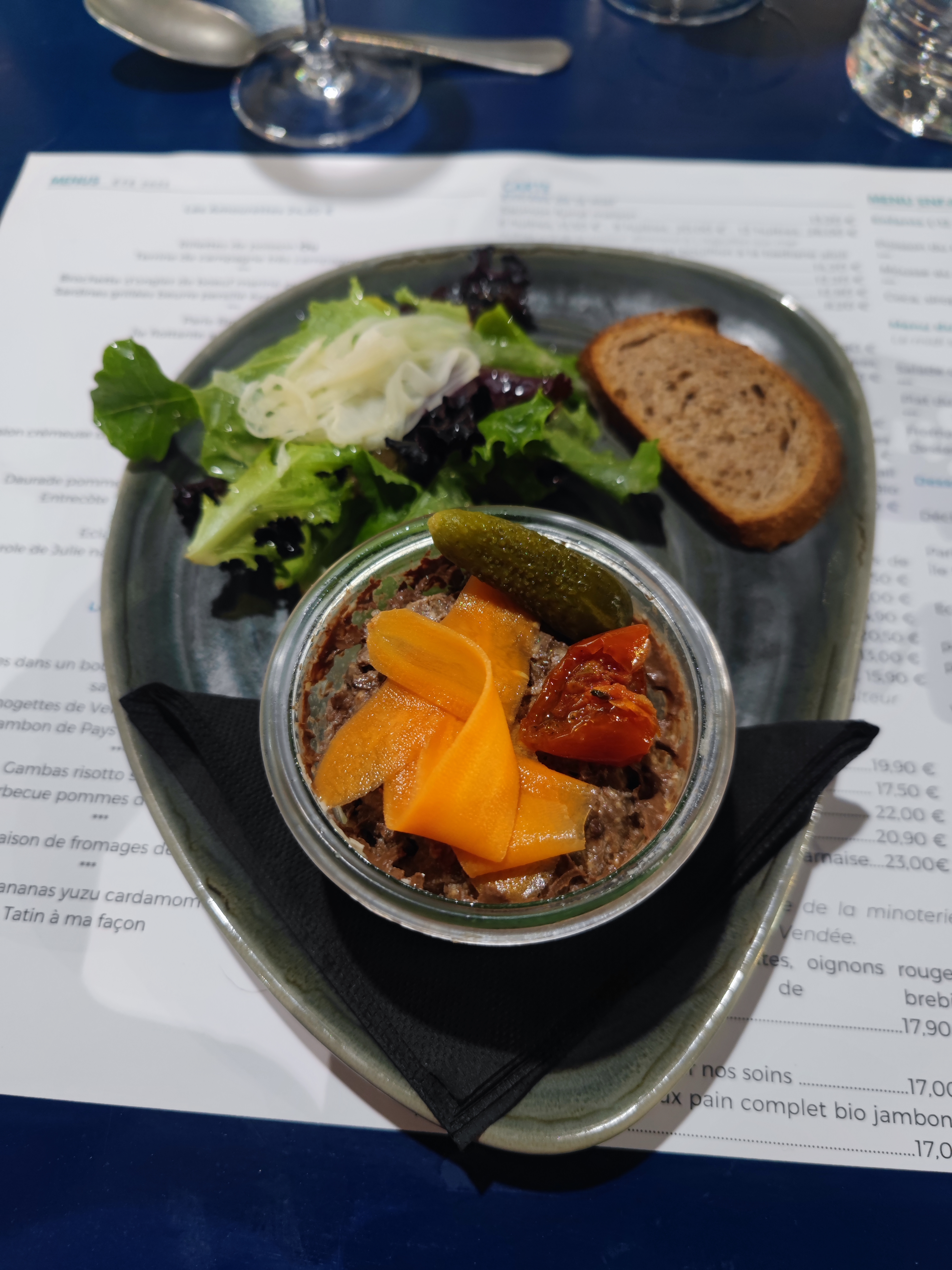 Bon Accueil. Lieux agréable et propre ( ainsi que les toilettes, et ça c'est tjrs rédhibitoire pour moi 😊) J'ai beaucoup aimé le mojito sans alcool avec l'accompagnement d'un en-cas au saumon. Les plats sont très généreux. Un peu trop pour moi en tant que petit bout de femme ☺️😉) . Les rillettes était délicieuse mais la quantité trop importante ( je dis bien pour moi, 😊). Le saumon était top 👌. Je n'ai pas pu manger le risotto qui l'accompagnait. Avec le Parmesan c'était très gras ( je précise encore pour mon palais 😊😁). La choucroute de mon conjoint était elle aussi bonne et très généreuse. Il a beaucoup apprécié. Le morceau de pain sur la table comme à la maison c'est top. Les desserts était très bon. Très bon rapport qualité prix. Service rapide, personnels très agréable et souriant . Très belle découverte. Je vous le conseil