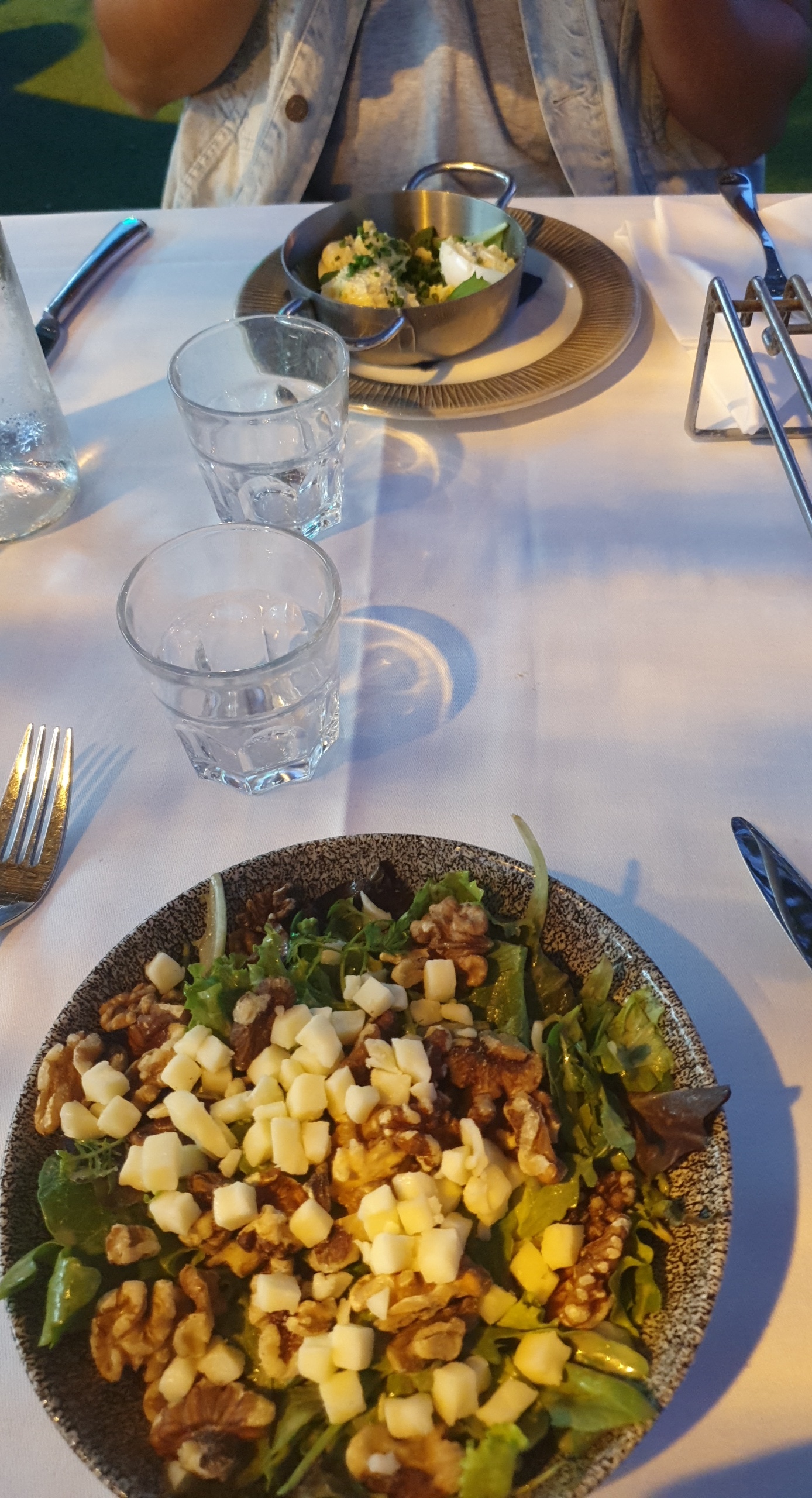 La salade verte aux noix n'était pas assaisonnée ; la viande baignait dans une mare de sauce au beurre .