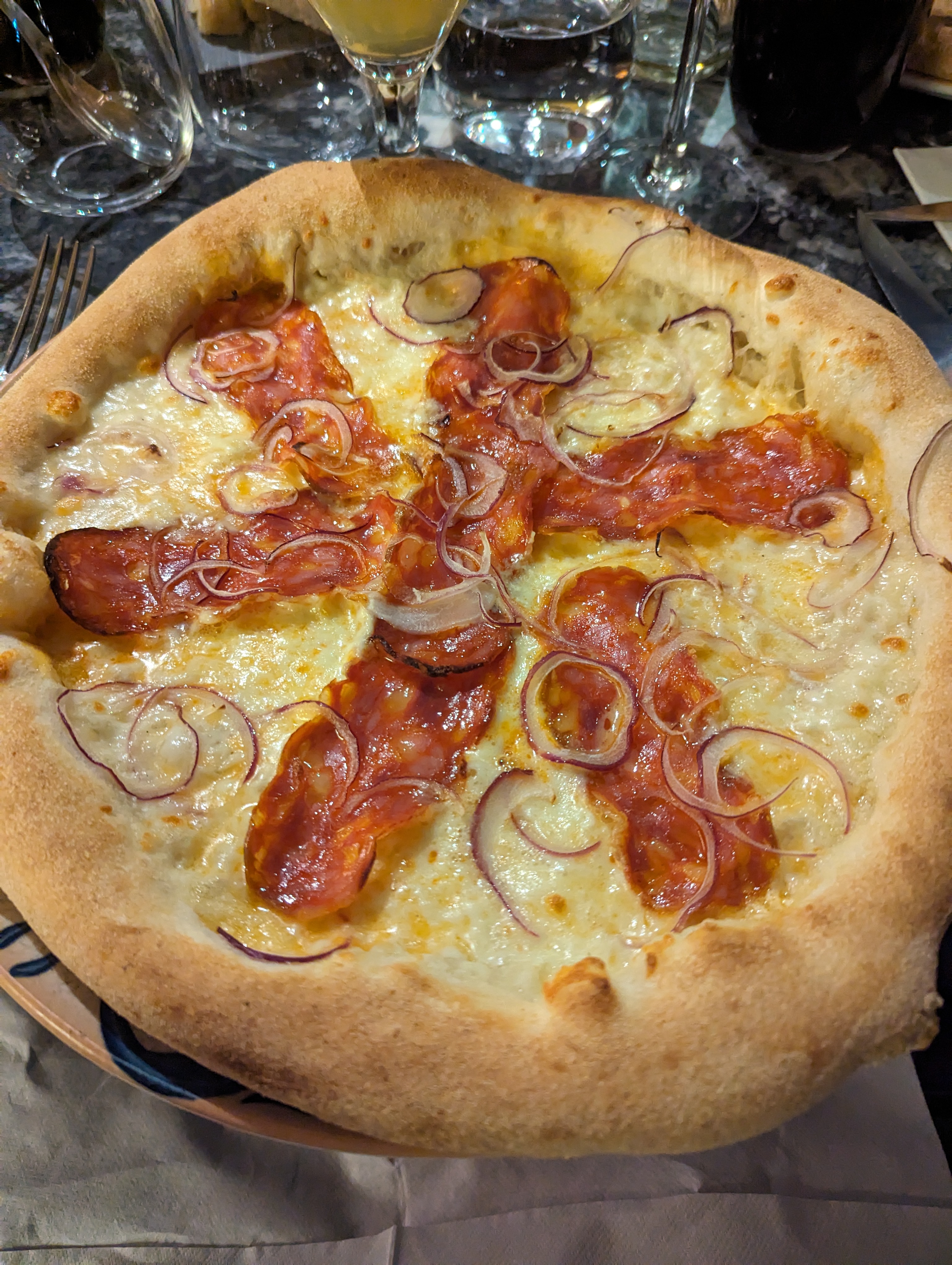 Cela change des options savoyardes habituelles. Ma femme a pris les Rigatoni Al Pecorino qui sont finis à table par le serveur, c'était très sympa mais beaucoup trop de pâtes. La pizza piquante était très bonne.