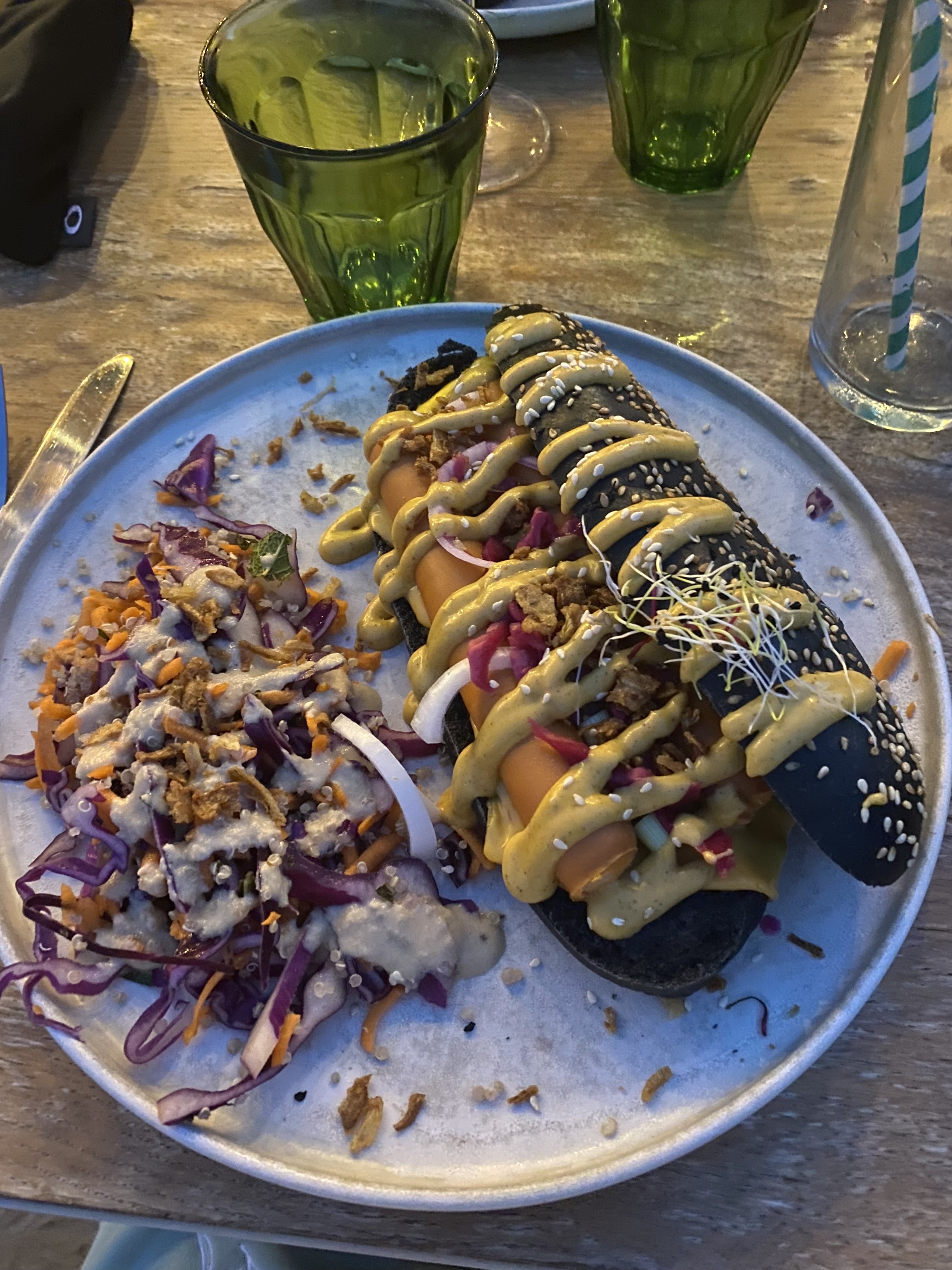 J'ai voulu vérifier ce qui rendait probable le 5/5 sur 88 avis (un petit miracle). Oui le miracle d'une équipe bienveillante, un beau sourire en venant en partant. Et un bonheur gustatif en croquant dans ce hot dog rose, qui est accompagné de beaux légumes. Un équilibre des saveurs juste parfait pour moi. Je vous laisse vous y arrêter. La preuve qu'il faille parfois aller plus loin qu'en plein centre passer le pont mais la récompense est bien là. Bravooooo et merci. Scandaleusement bon et nah