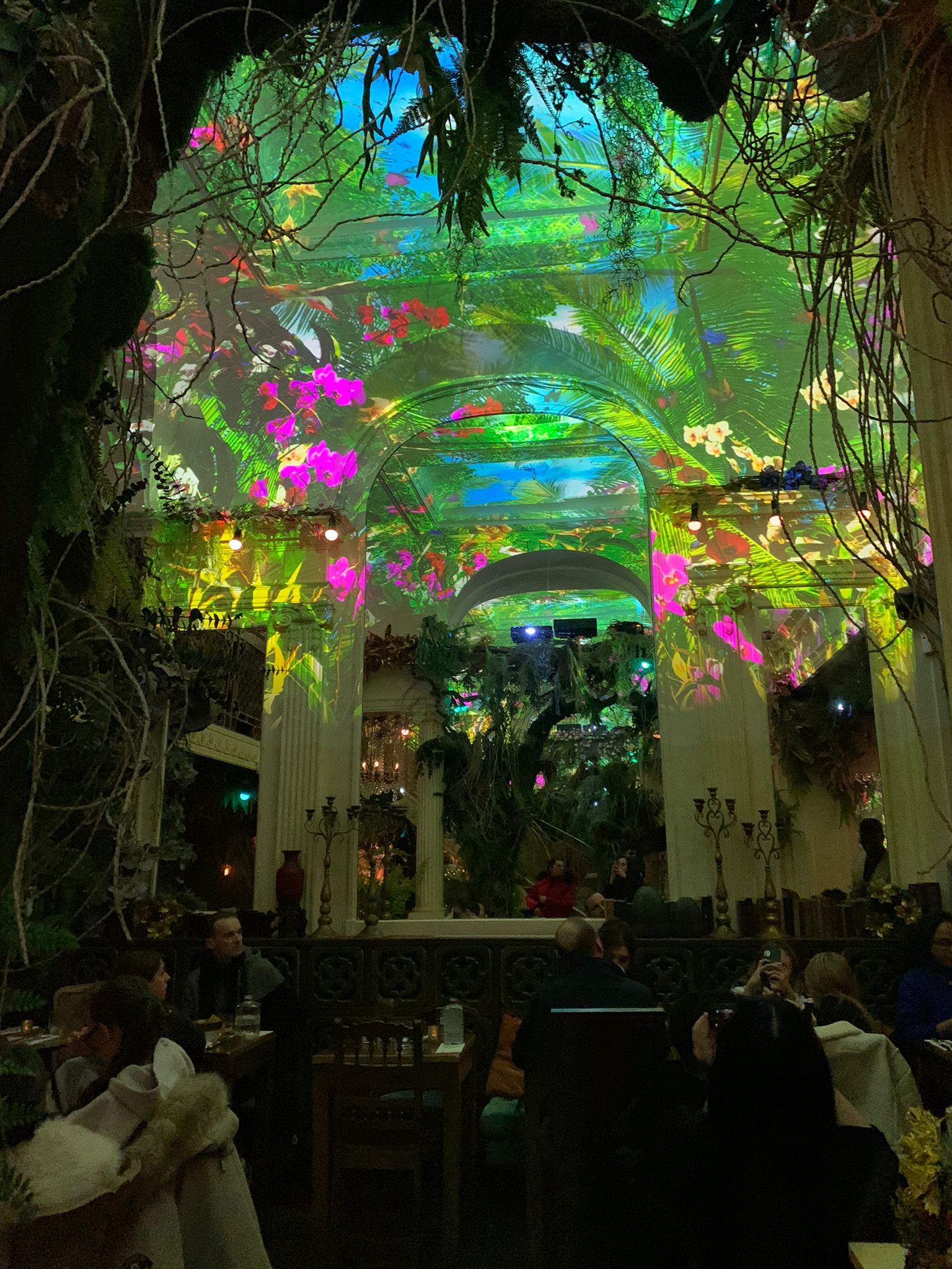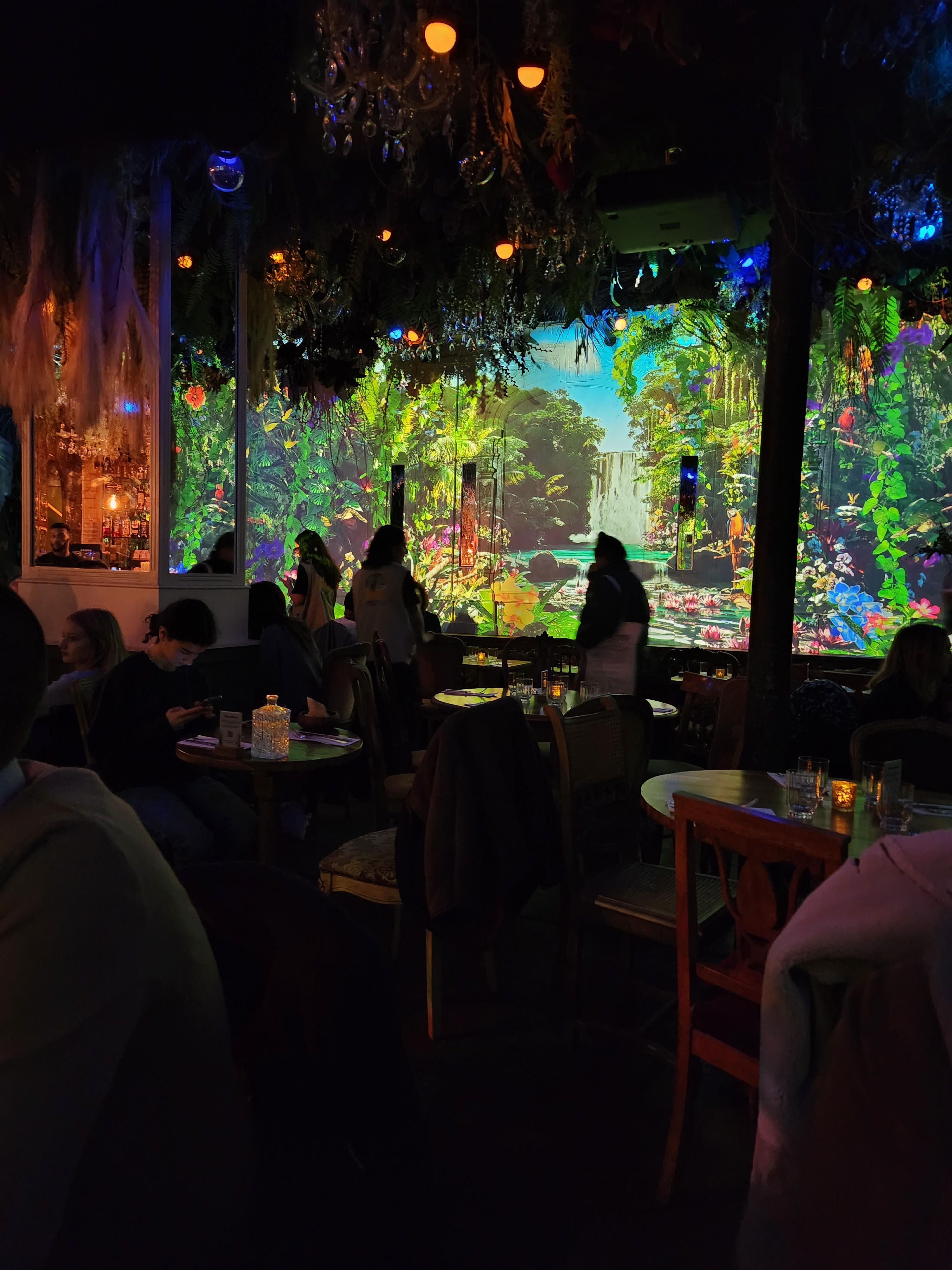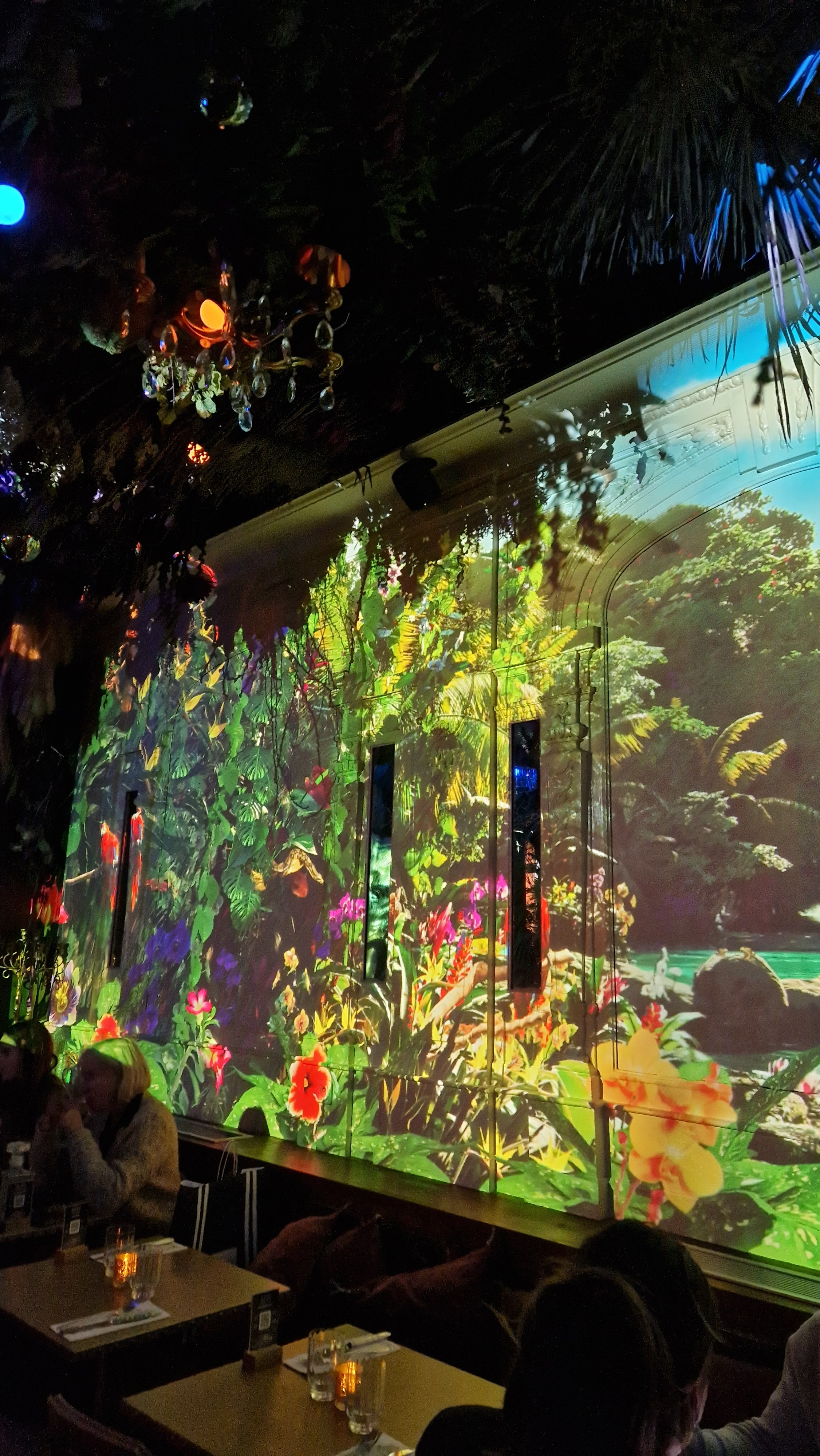 l’ambiance n’est pas assez Immersive à mon goût.. Des plantes qui pendent du plafond, rien de nouveau. C’est vrai que les jeux de lumière et la projection au mur sont sympas. Mais je n’ai pas eu d’effet Waouh en rentrant dans le restaurant. mais La cuisine était délicieuse, le personnel au top Agatha super sympa.
