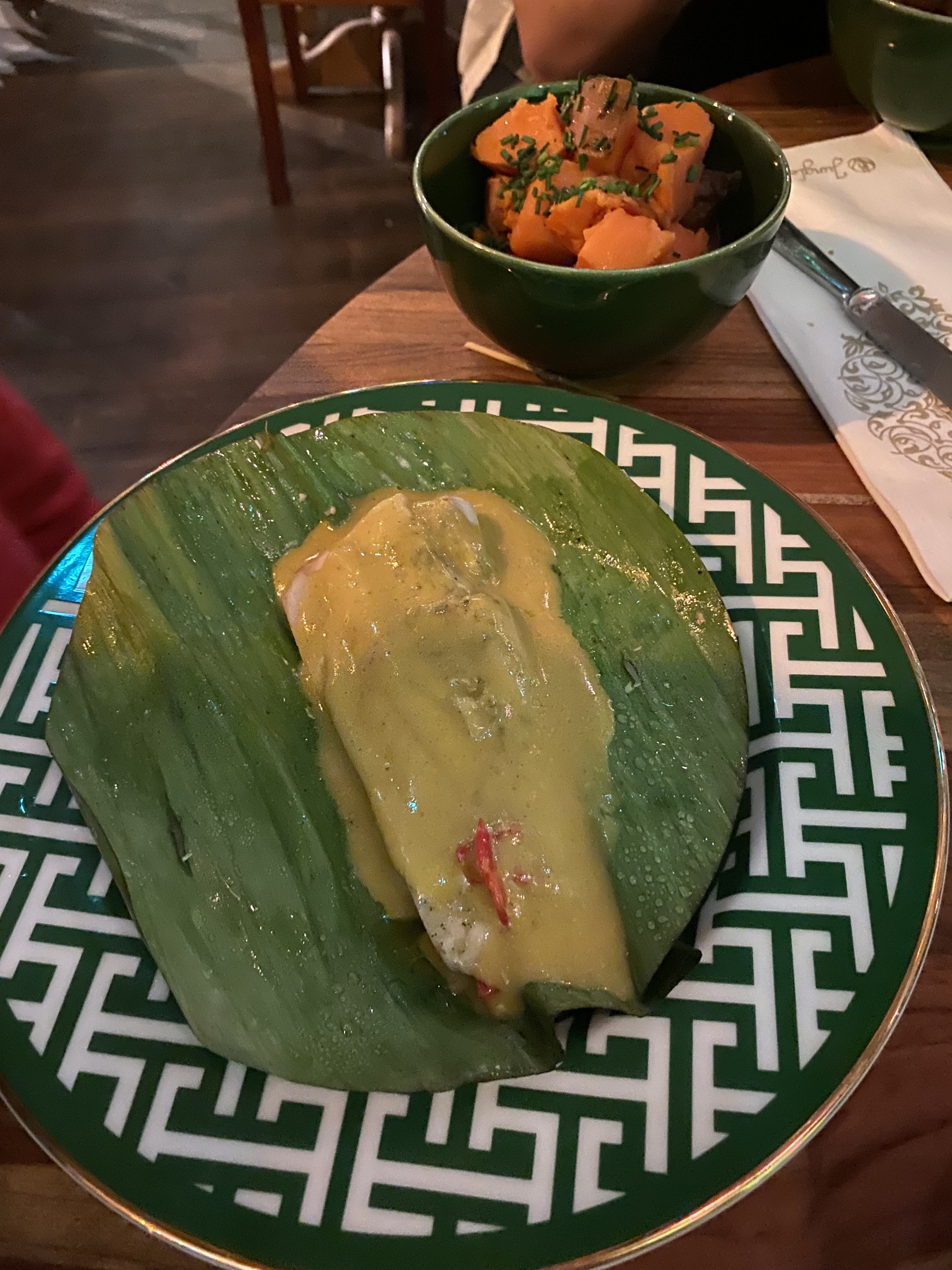 Bon on y va pour le décor.. Franchement la salle et même les toilettes sont magnifiques.. sinon nos plats étaient très peu chauffés, le poisson dans la feuille de banane manquait de peps et de chaleur...la purée de patate douce super bonne, mais pareil très peu chaud..