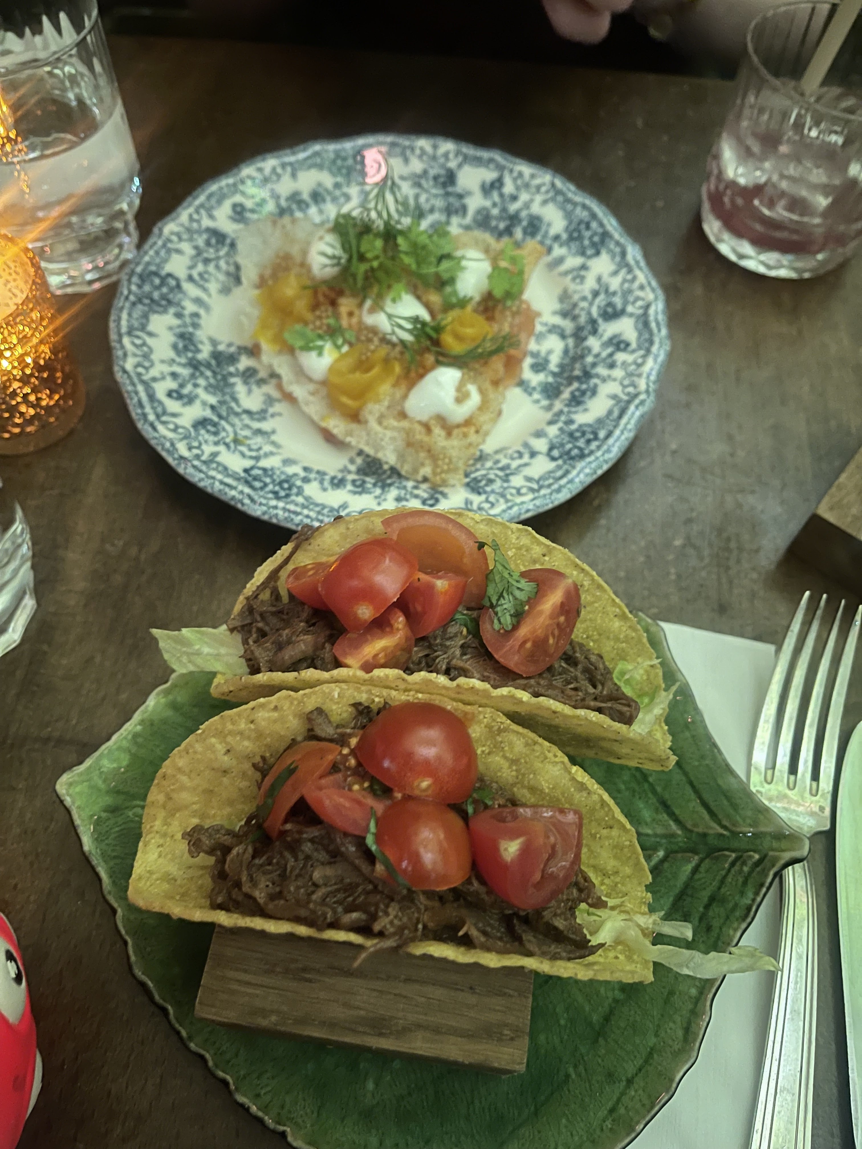 Très belle expérience. Les tacos sont très bons. Les poivrons excellents. Le monochrome de chocolat est ce qu’il promet: fu chocolat avec du chocolat sur du chocolat! Mais on sens bien les différentes parties glace, meringue tuile gruée, le crémeux grâce aux différences de texture et de température. Service ultra efficace. L’ambiance est évidemment dépaysante.