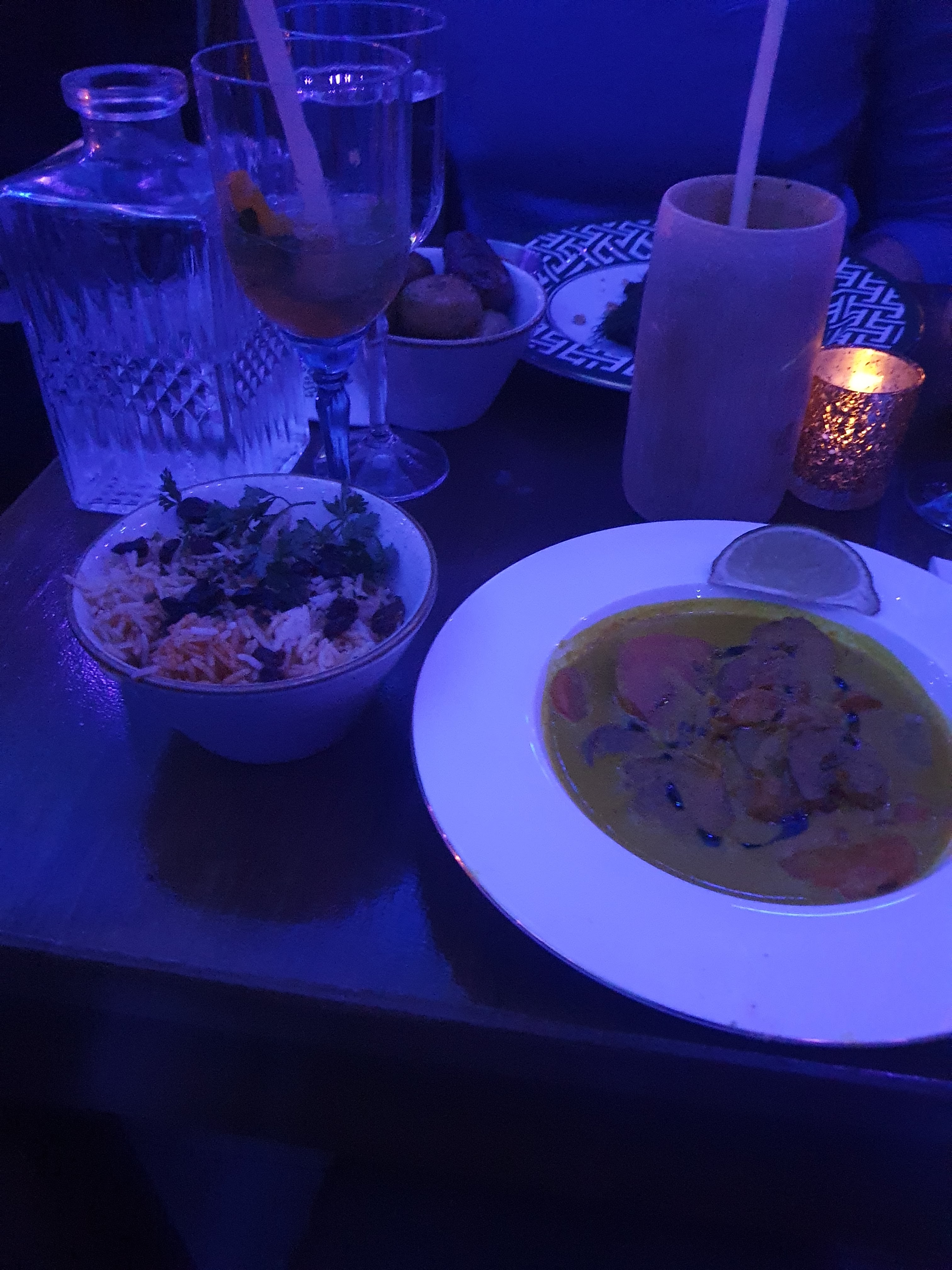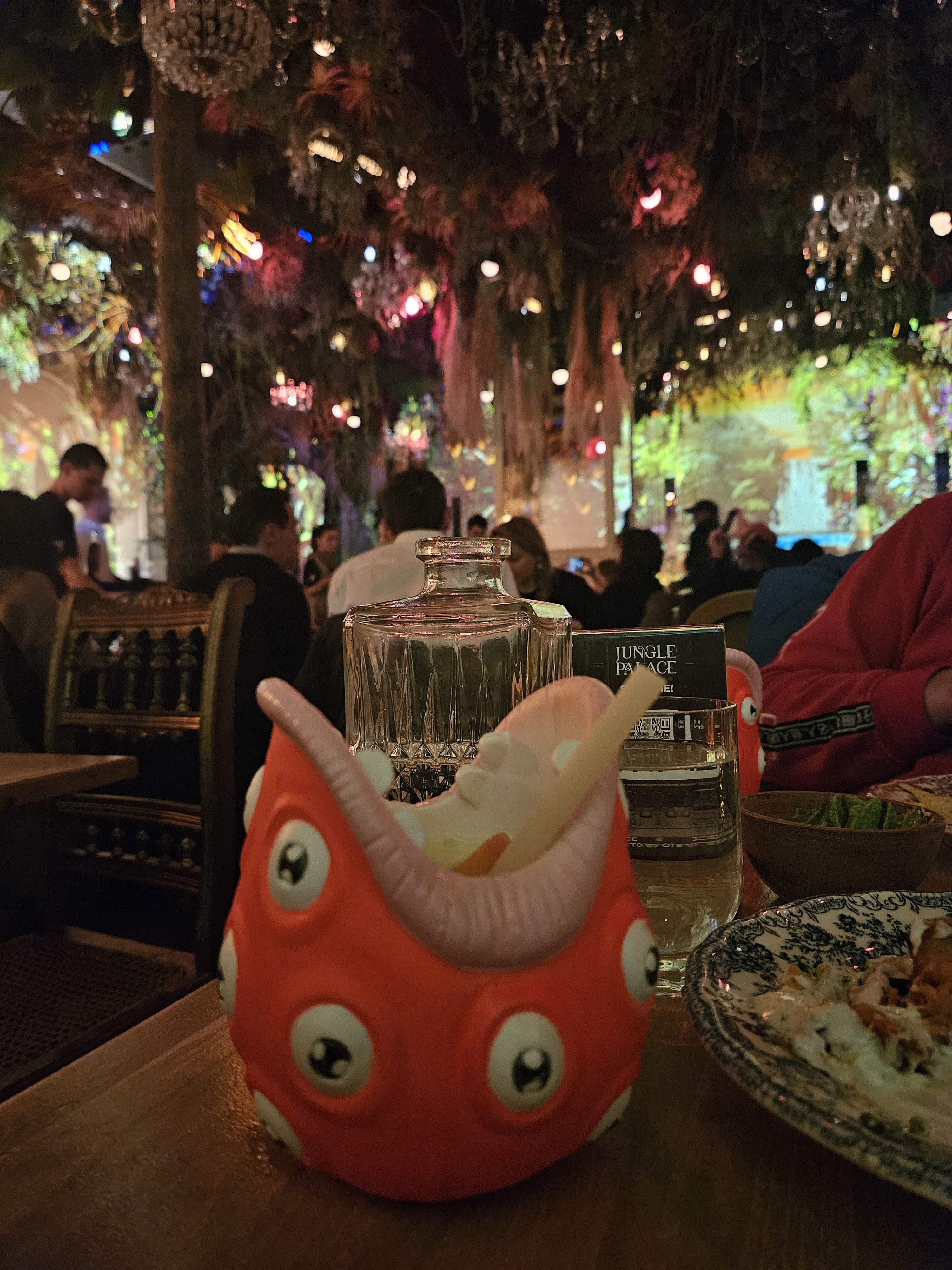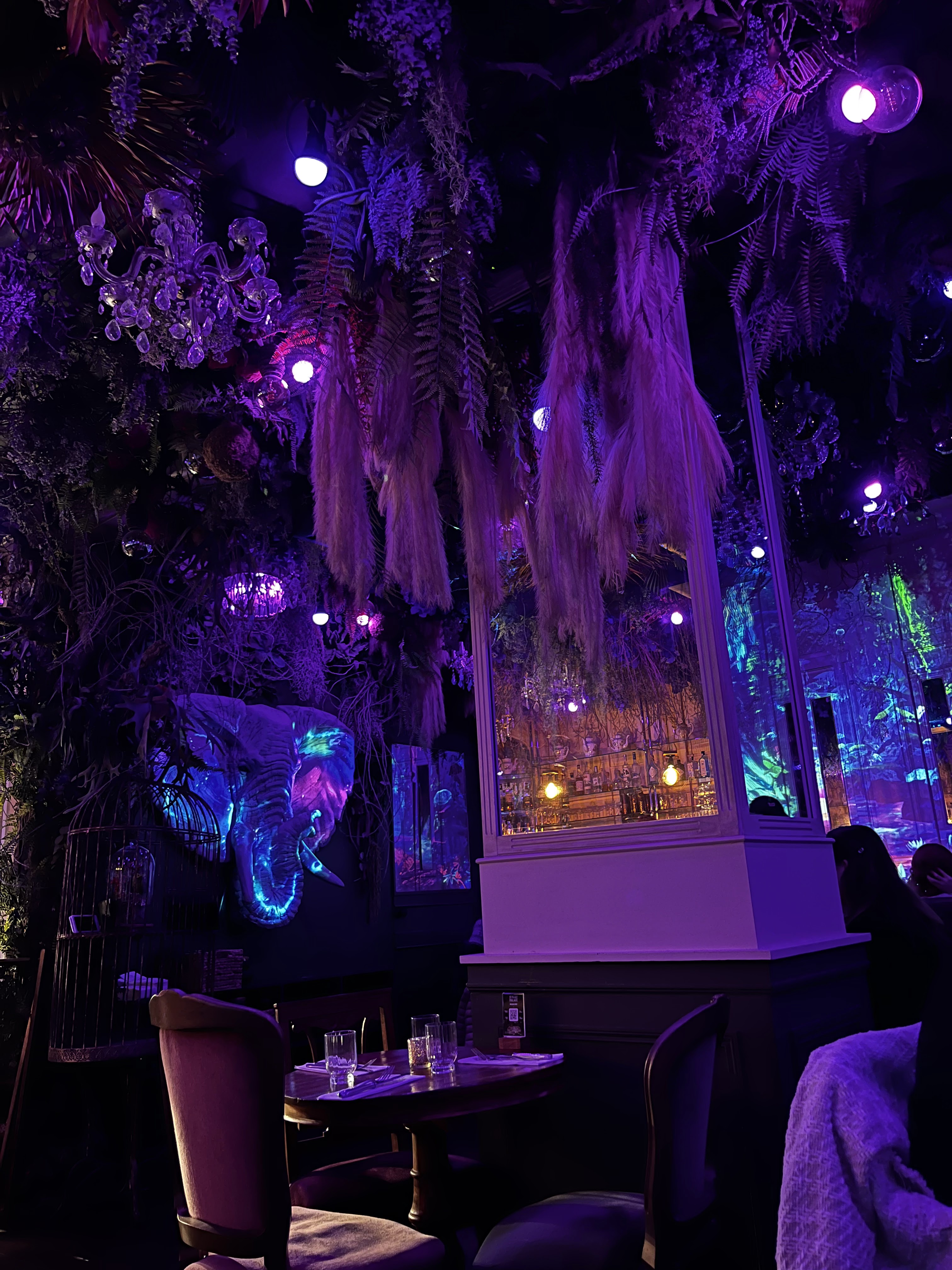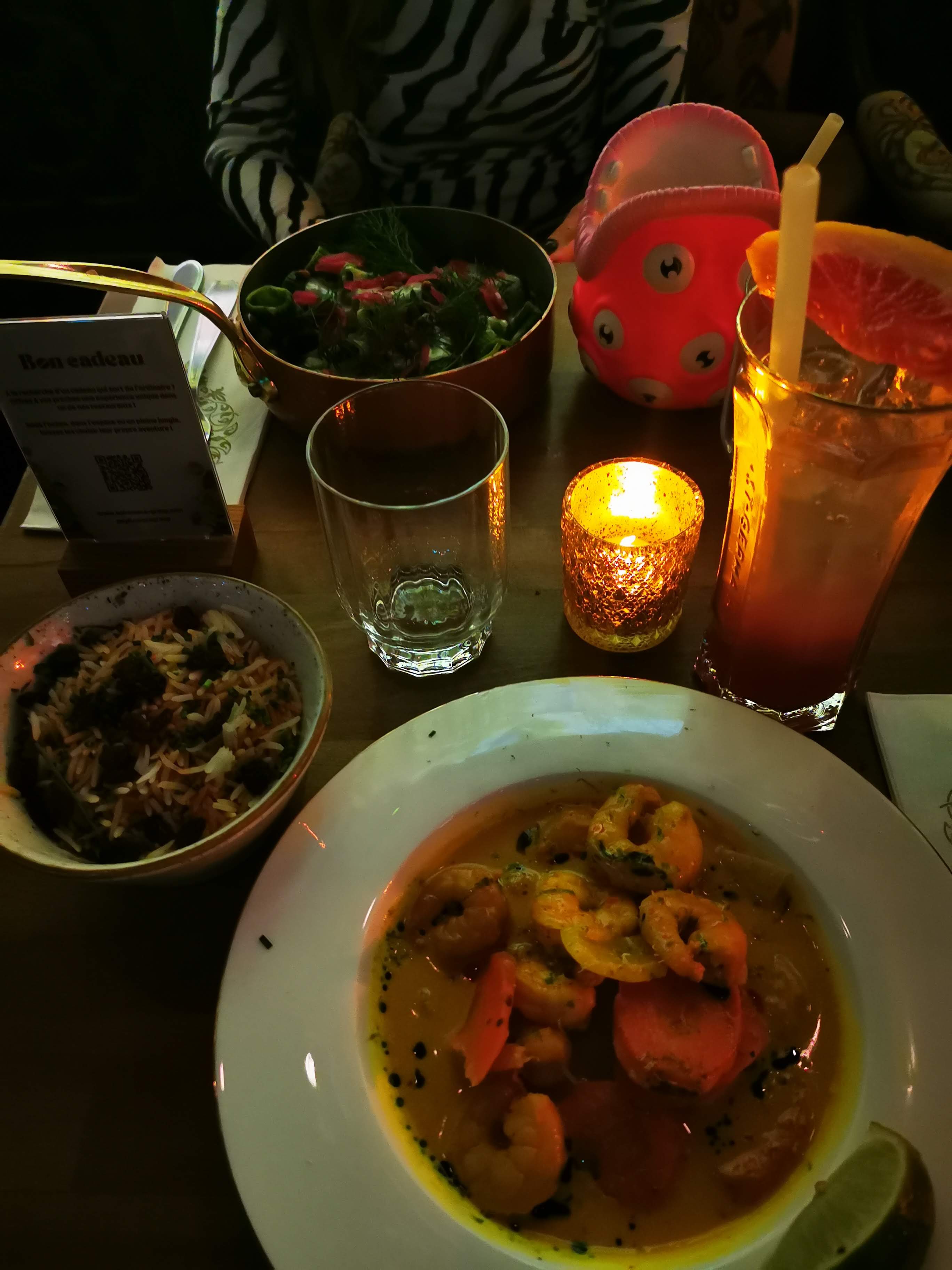 Plongez au coeur de la jungle avec cette expérience immersive. Ayant déjà eu l’occasion d’explorer un autre concept d’Ephemera, Jungle Palace aura été à hauteur de mes attentes, le lieu mérite amplement les éloges qui lui sont faites ! La décoration est sublime, chaque détail est soigné et pensé pour nous faire voyager du début à la fin. Mention spéciale pour les toilettes qui sont incroyables. Le jeu des couleurs et des projections tout au long du repas apportent de la magie et donne vie au décor. En plus de nous immerger dans un cadre sublime, Jungle palace, nous offre aussi un voyage gustatif. J’ai commencé par un cocktail, le Batida Indiana, qui était juste délicieux, j’ai vraiment beaucoup apprécié l’équilibre dans les saveurs, il n’était pas trop sucré et bien dosé. Le verre est incroyable ! En plat, nous avons choisis le curry végétarien, un vrai délice, les patates douces étaient fondantes, le curry assez léger (idéal si vous n’aimez pas quand c’est trop épicé), un plat réconfortant et bien parfumé. En comparaison à d’autres plats que j’ai pu voir passer, la portion était généreuse et suffisante. Un rapport qualité/ prix/ expérience très satisfaisant ! Seulement dommage que la carte ticket restaurant ne marchait pas …