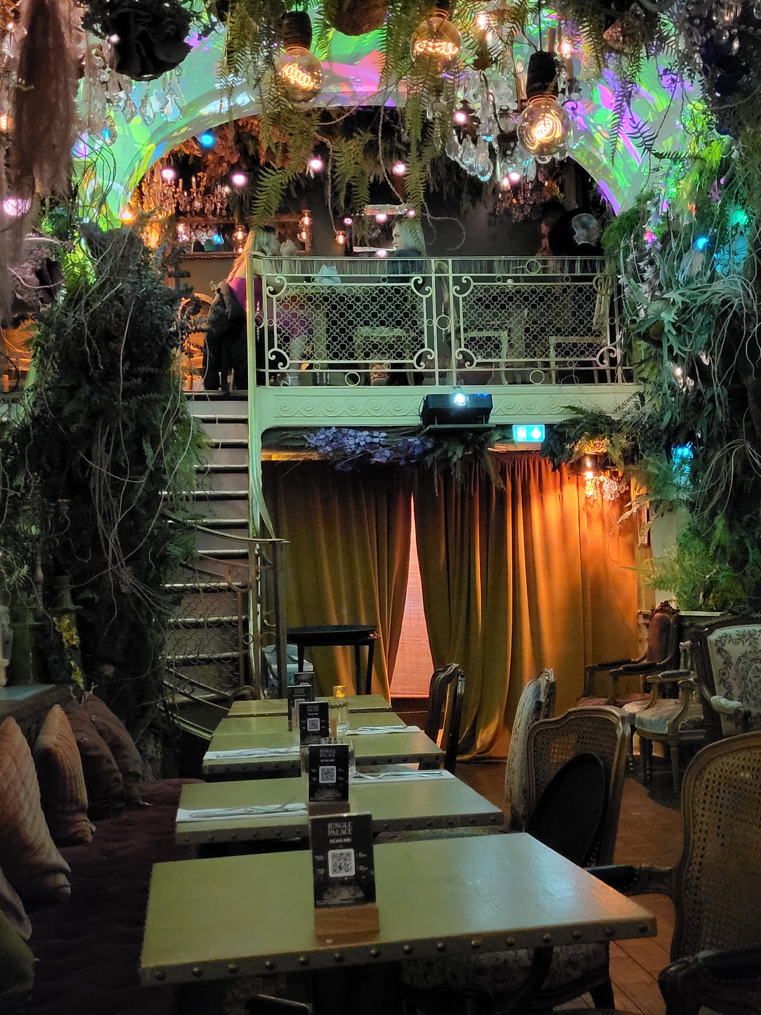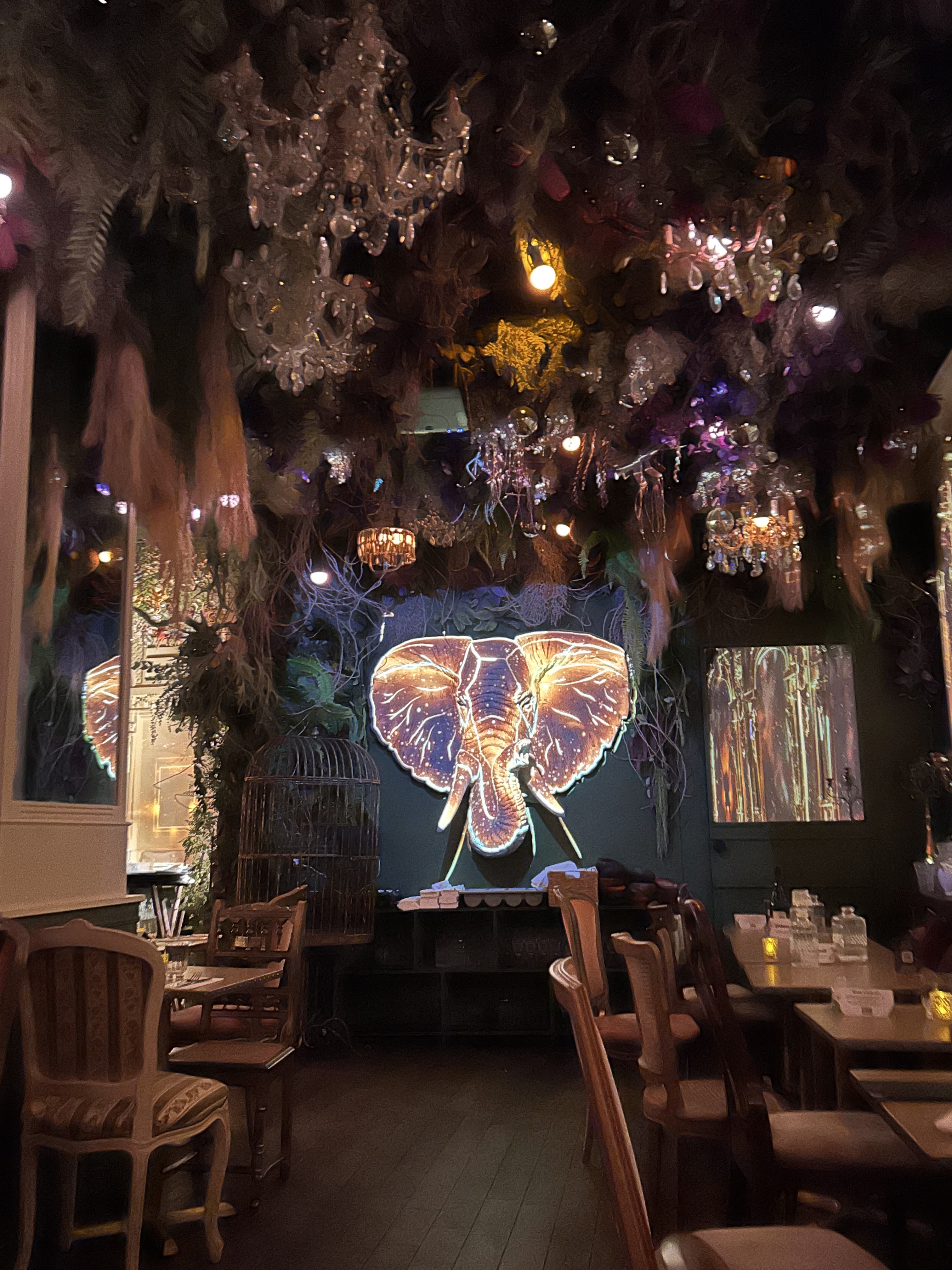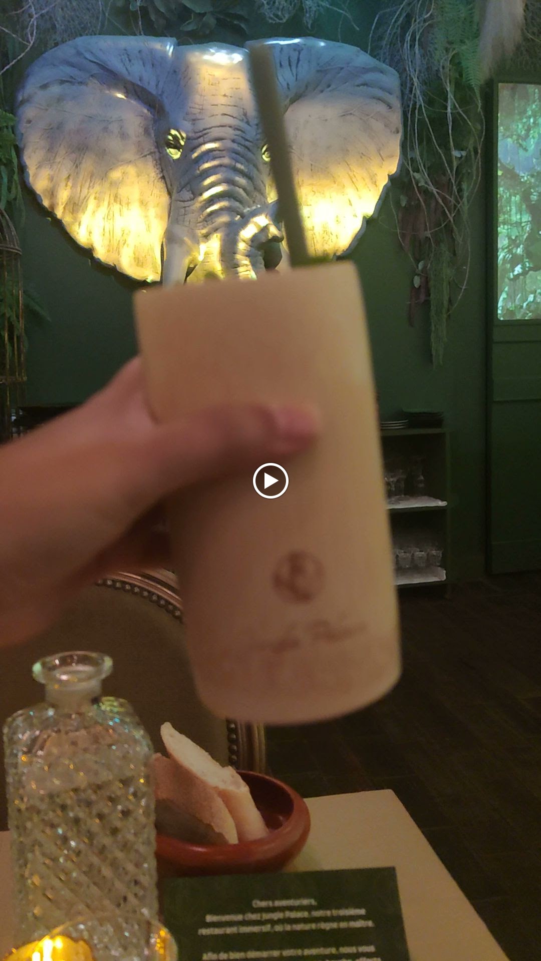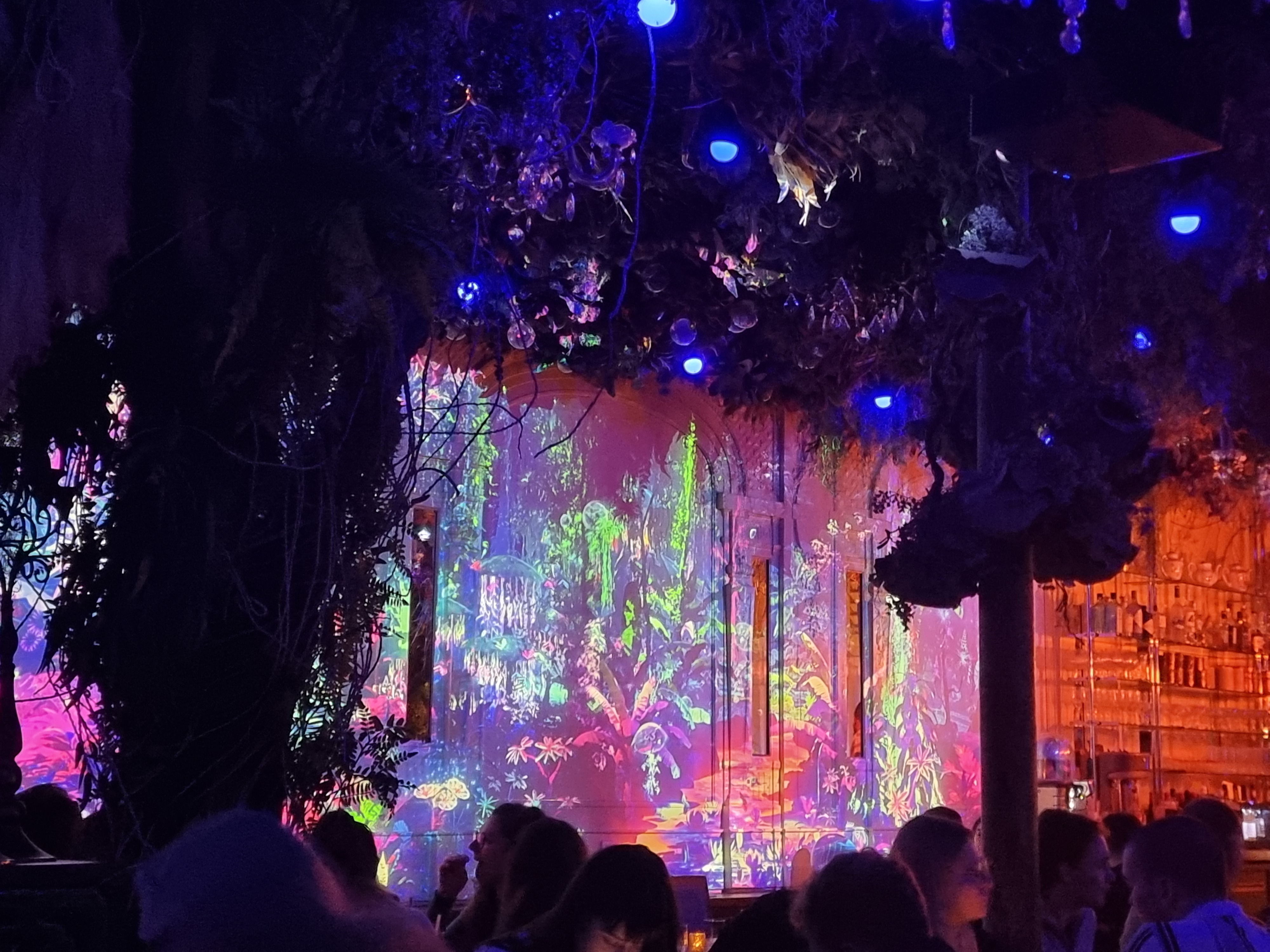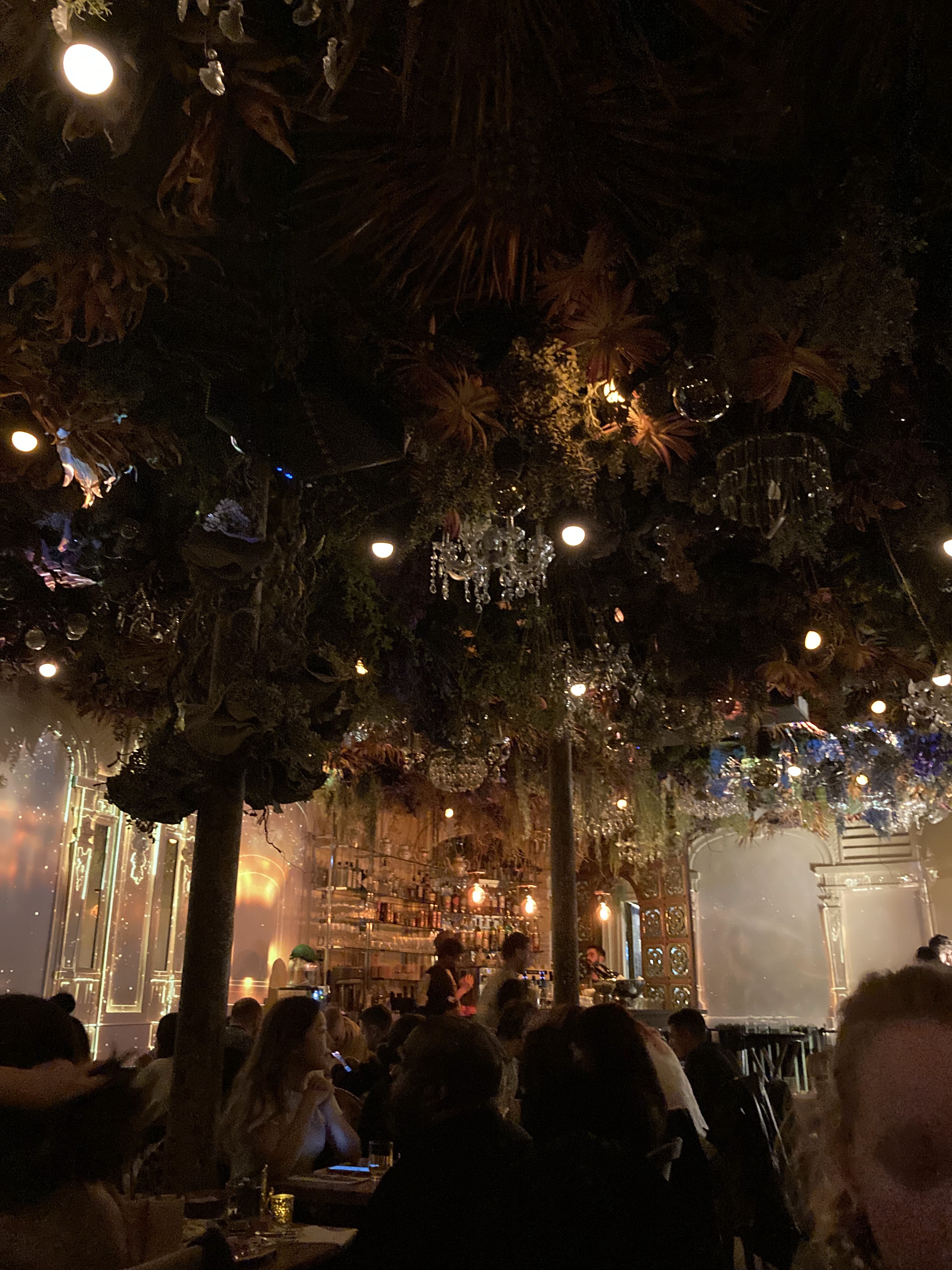 Plongez au coeur de la jungle avec cette expérience immersive. Ayant déjà eu l’occasion d’explorer un autre concept d’Ephemera, Jungle Palace aura été à hauteur de mes attentes, le lieu mérite amplement les éloges qui lui sont faites ! La décoration est sublime, chaque détail est soigné et pensé pour nous faire voyager du début à la fin. Mention spéciale pour les toilettes qui sont incroyables. Le jeu des couleurs et des projections tout au long du repas apportent de la magie et donne vie au décor. En plus de nous immerger dans un cadre sublime, Jungle palace, nous offre aussi un voyage gustatif. J’ai commencé par un cocktail, le Batida Indiana, qui était juste délicieux, j’ai vraiment beaucoup apprécié l’équilibre dans les saveurs, il n’était pas trop sucré et bien dosé. Le verre est incroyable ! En plat, nous avons choisis le curry végétarien, un vrai délice, les patates douces étaient fondantes, le curry assez léger (idéal si vous n’aimez pas quand c’est trop épicé), un plat réconfortant et bien parfumé. En comparaison à d’autres plats que j’ai pu voir passer, la portion était généreuse et suffisante. Un rapport qualité/ prix/ expérience très satisfaisant ! Seulement dommage que la carte ticket restaurant ne marchait pas …