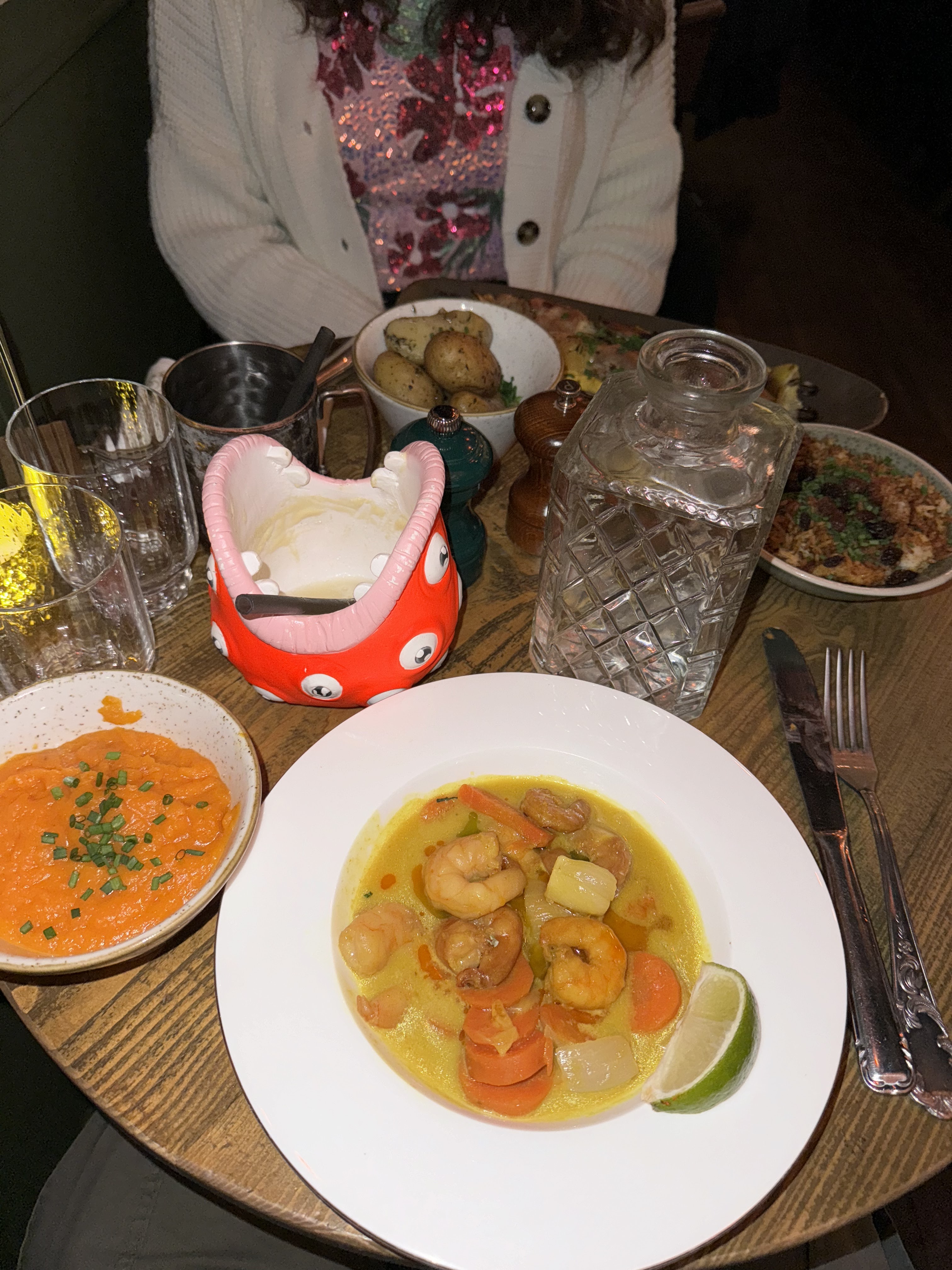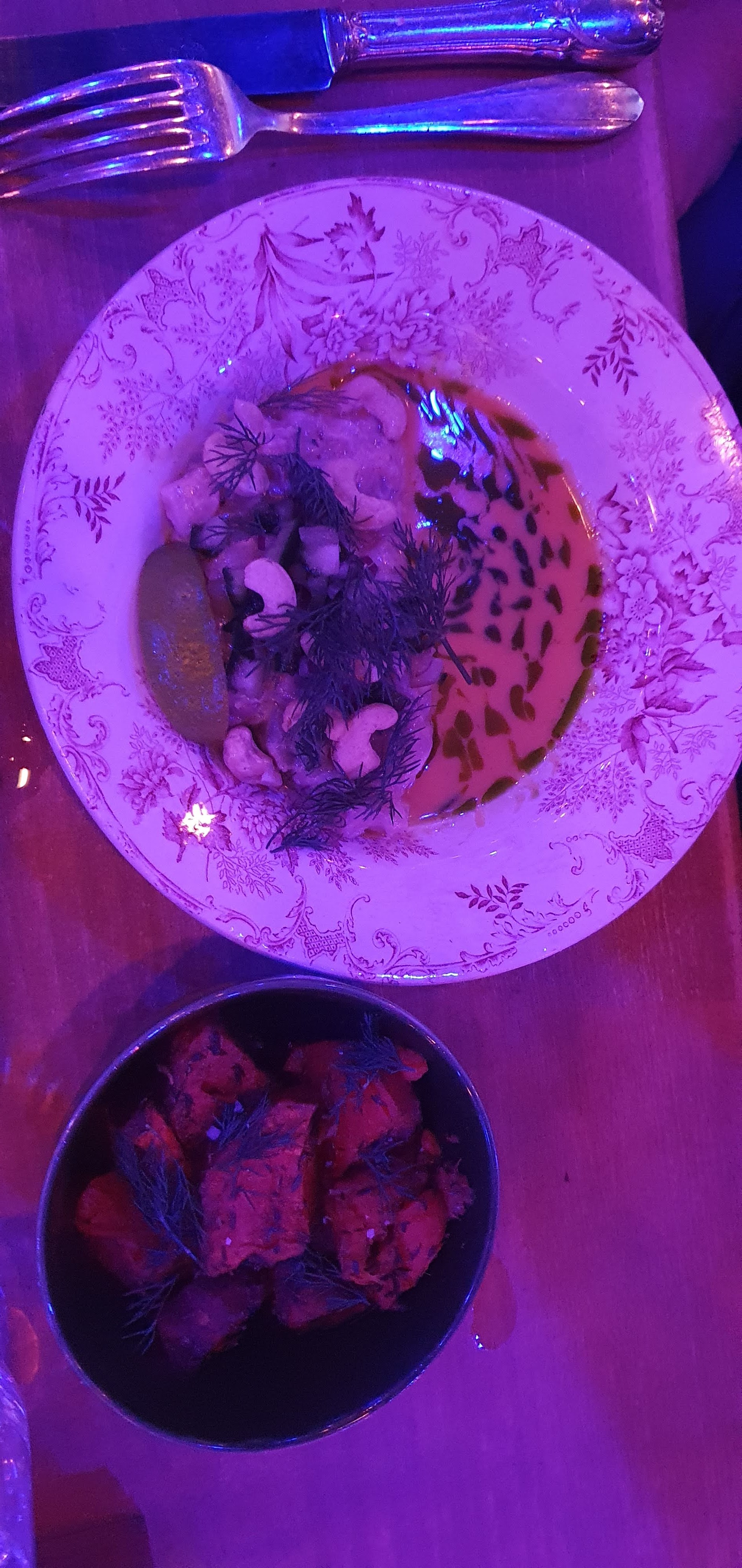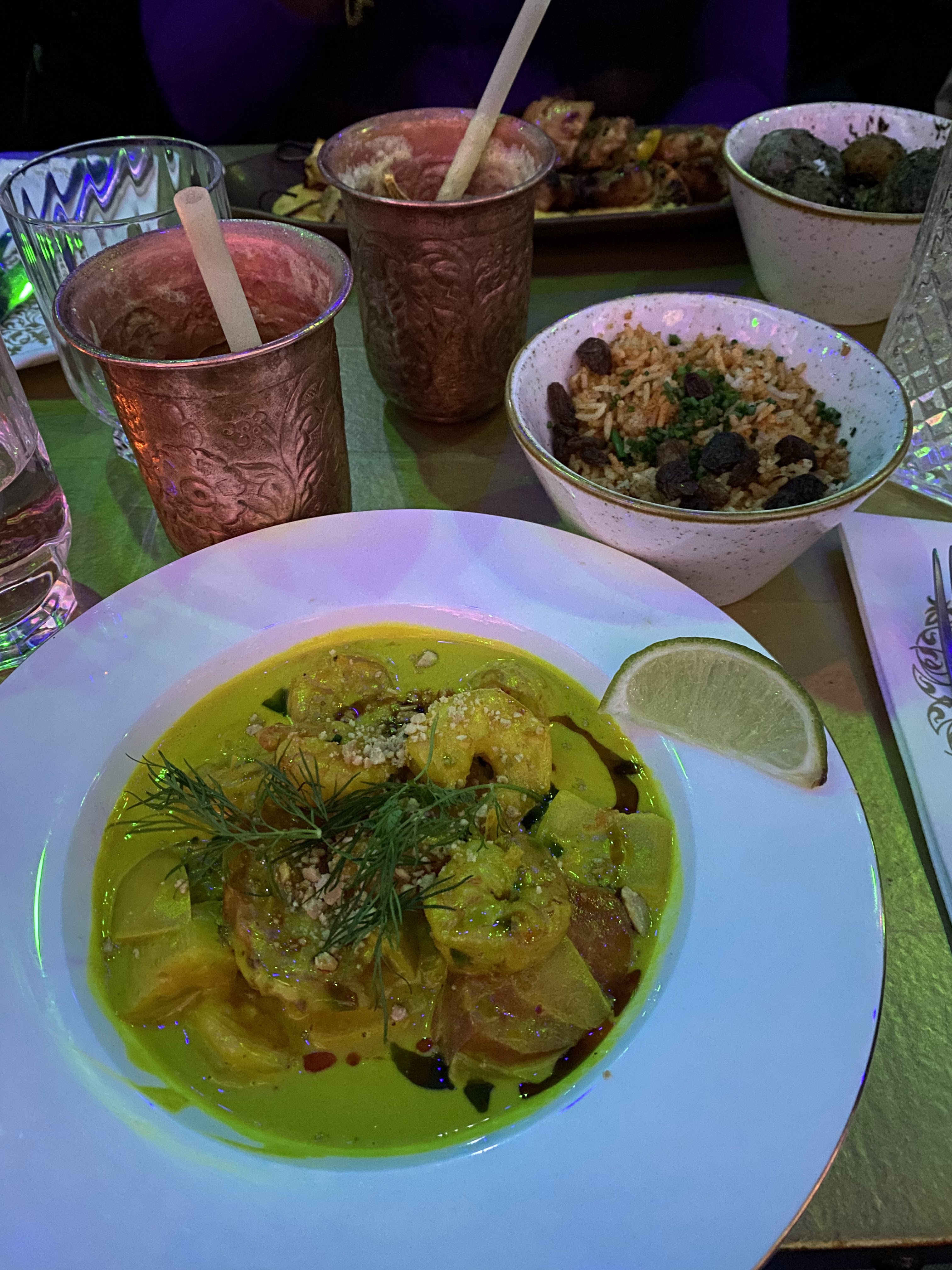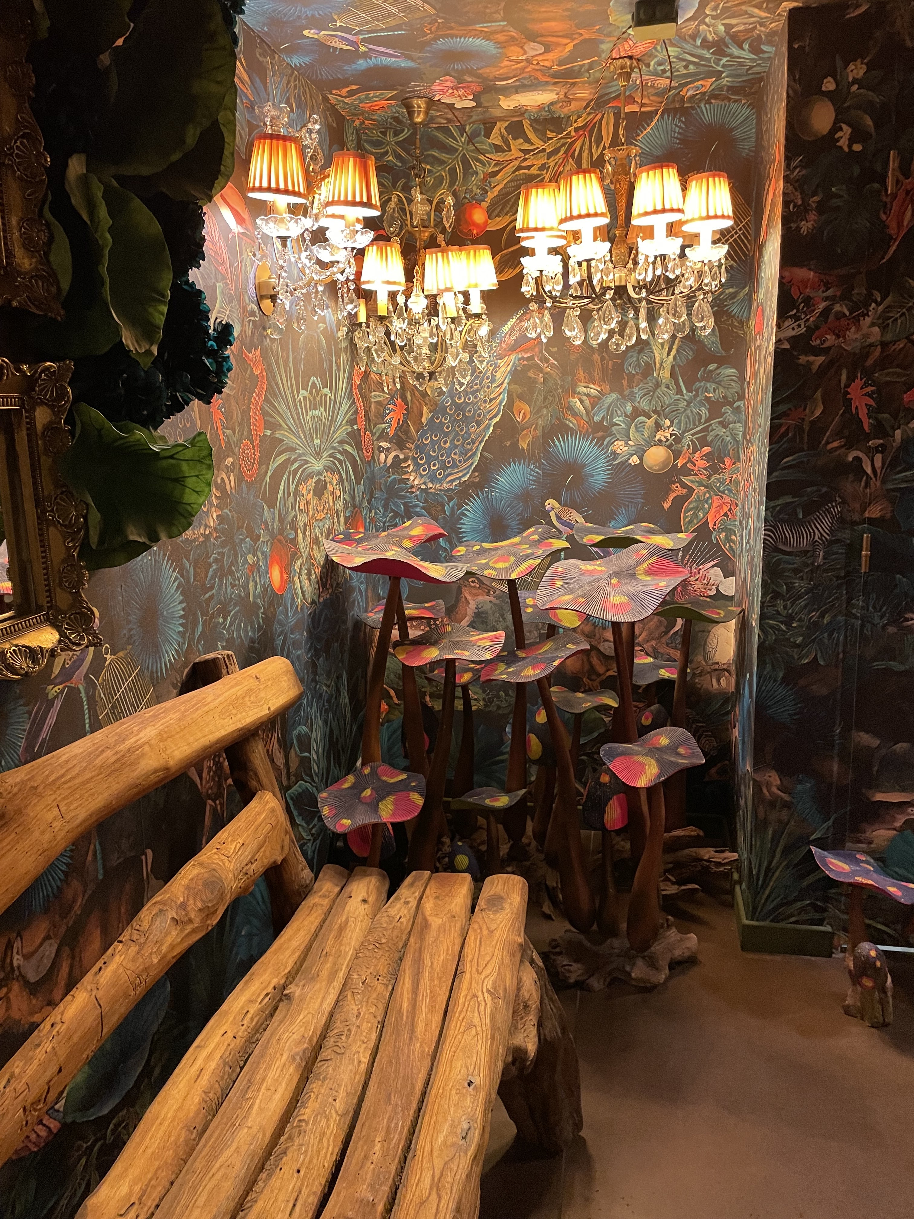 Plongez au coeur de la jungle avec cette expérience immersive. Ayant déjà eu l’occasion d’explorer un autre concept d’Ephemera, Jungle Palace aura été à hauteur de mes attentes, le lieu mérite amplement les éloges qui lui sont faites ! La décoration est sublime, chaque détail est soigné et pensé pour nous faire voyager du début à la fin. Mention spéciale pour les toilettes qui sont incroyables. Le jeu des couleurs et des projections tout au long du repas apportent de la magie et donne vie au décor. En plus de nous immerger dans un cadre sublime, Jungle palace, nous offre aussi un voyage gustatif. J’ai commencé par un cocktail, le Batida Indiana, qui était juste délicieux, j’ai vraiment beaucoup apprécié l’équilibre dans les saveurs, il n’était pas trop sucré et bien dosé. Le verre est incroyable ! En plat, nous avons choisis le curry végétarien, un vrai délice, les patates douces étaient fondantes, le curry assez léger (idéal si vous n’aimez pas quand c’est trop épicé), un plat réconfortant et bien parfumé. En comparaison à d’autres plats que j’ai pu voir passer, la portion était généreuse et suffisante. Un rapport qualité/ prix/ expérience très satisfaisant ! Seulement dommage que la carte ticket restaurant ne marchait pas …