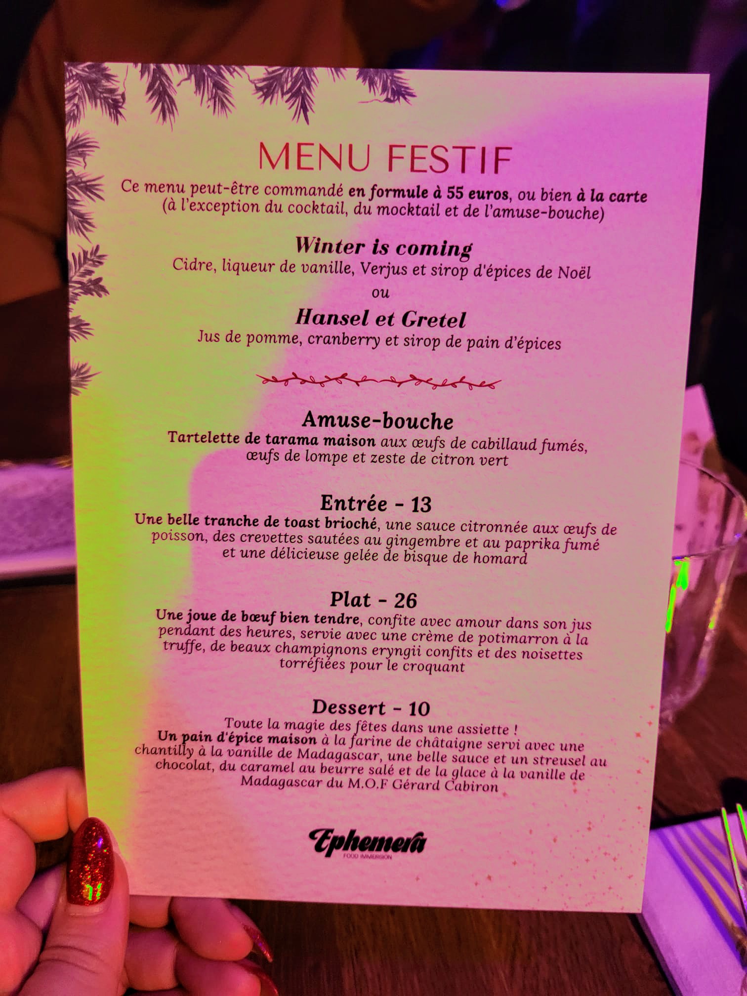 Connaissant déjà très bien le Under the Sea et le Stellar, j’étais impatiente de tester celui-ci et ni moi ni mon amie n’avons été déçues ! Ambiance immersive géniale, décoration superbe, nourriture délicieuse et Agathe, notre serveuse a été adorable et de très bons conseils. Tout le personnel était poli et chaleureux. L’expérience était réussi en ce dernier jour de l’année 2023 ! Nous avons dégusté plusieurs entrées, plats et desserts et ils étaient tous délicieux ! Merci à toutes les équipes Ephemera pour leur travail de qualité et l’expérience extraordinaire qu’ils procurent ! 🙏🏻