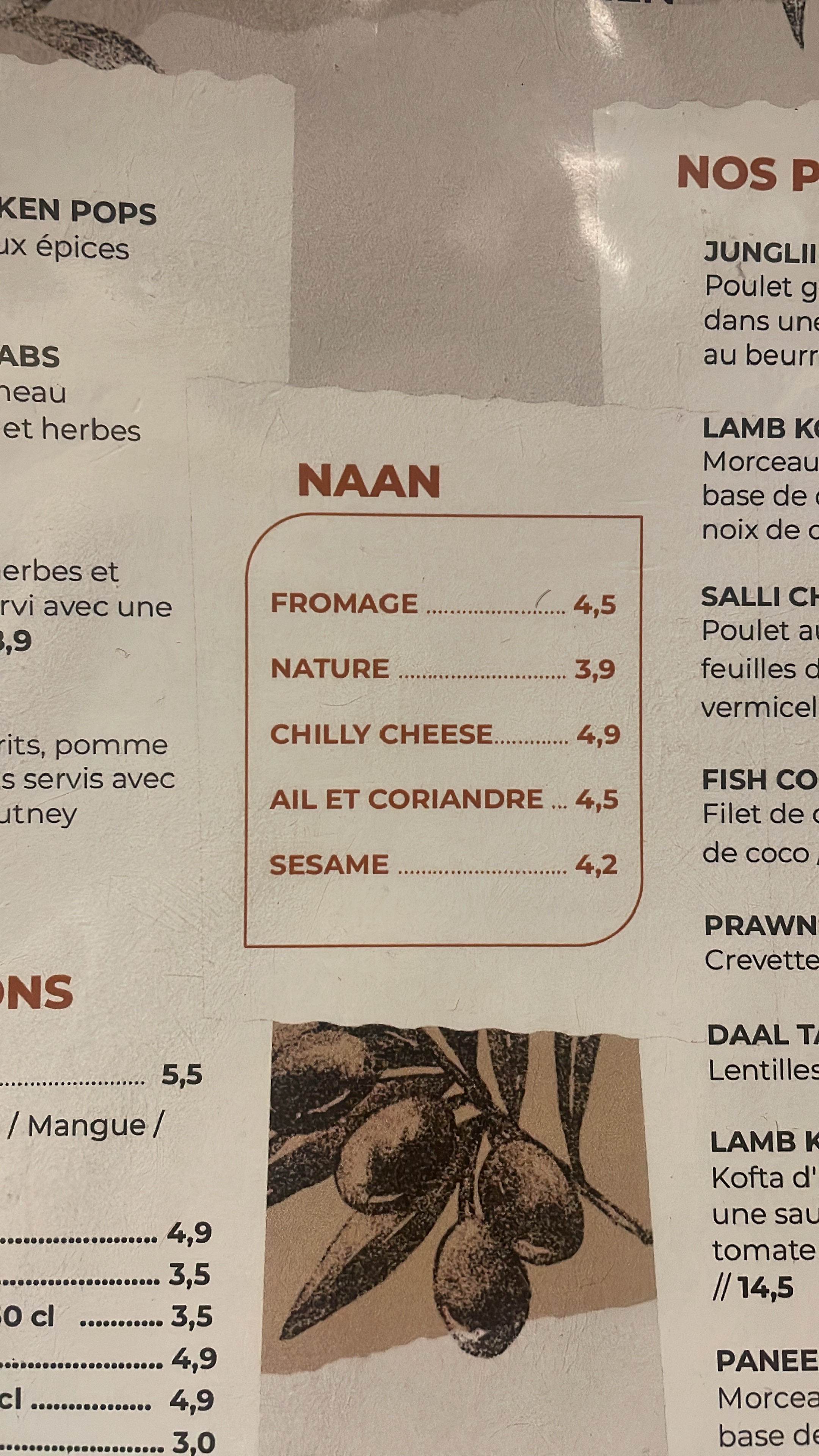 J’ai commandé en livraison, le cheese naan est très bon, le plat (butter chicken) en revanche manque de gout. Ce n’est pas mauvais, mais ca manque de tout: epices, sel, poivre...