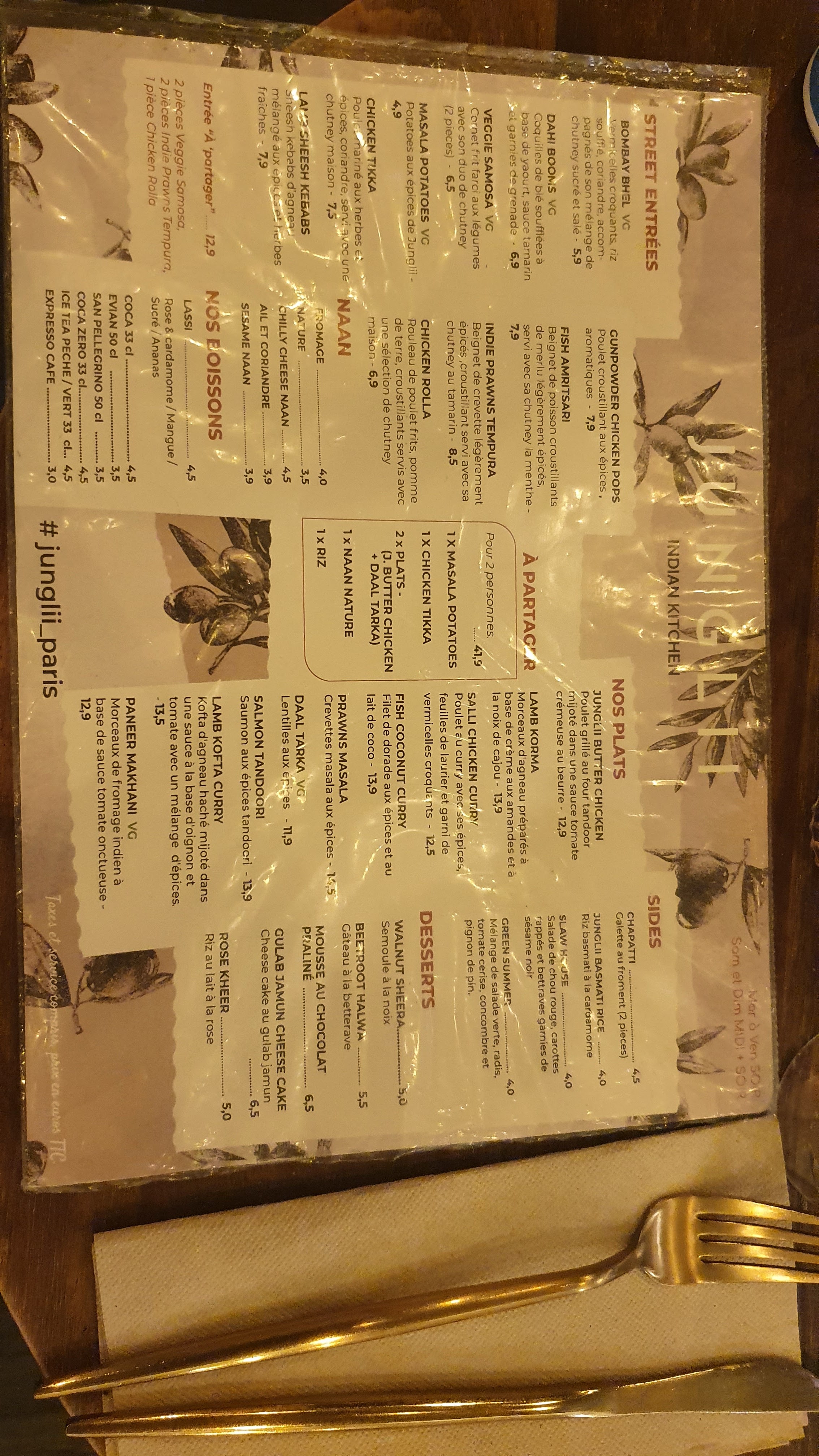 Junglii est une excellente adresse, la cuisine est très goûteuse, fine et copieuse. Le personnel est extrêmement aimable, attentionné et souriant. Devant le monceau de restaurant indien bas de gamme qui pullulent, ce restaurant mérite d'être connu. Dans un cadre intimiste sans être tamisé il est parfait pour les couples ou les sorties entre amis. Pour notre part on y retournera avec plaisir