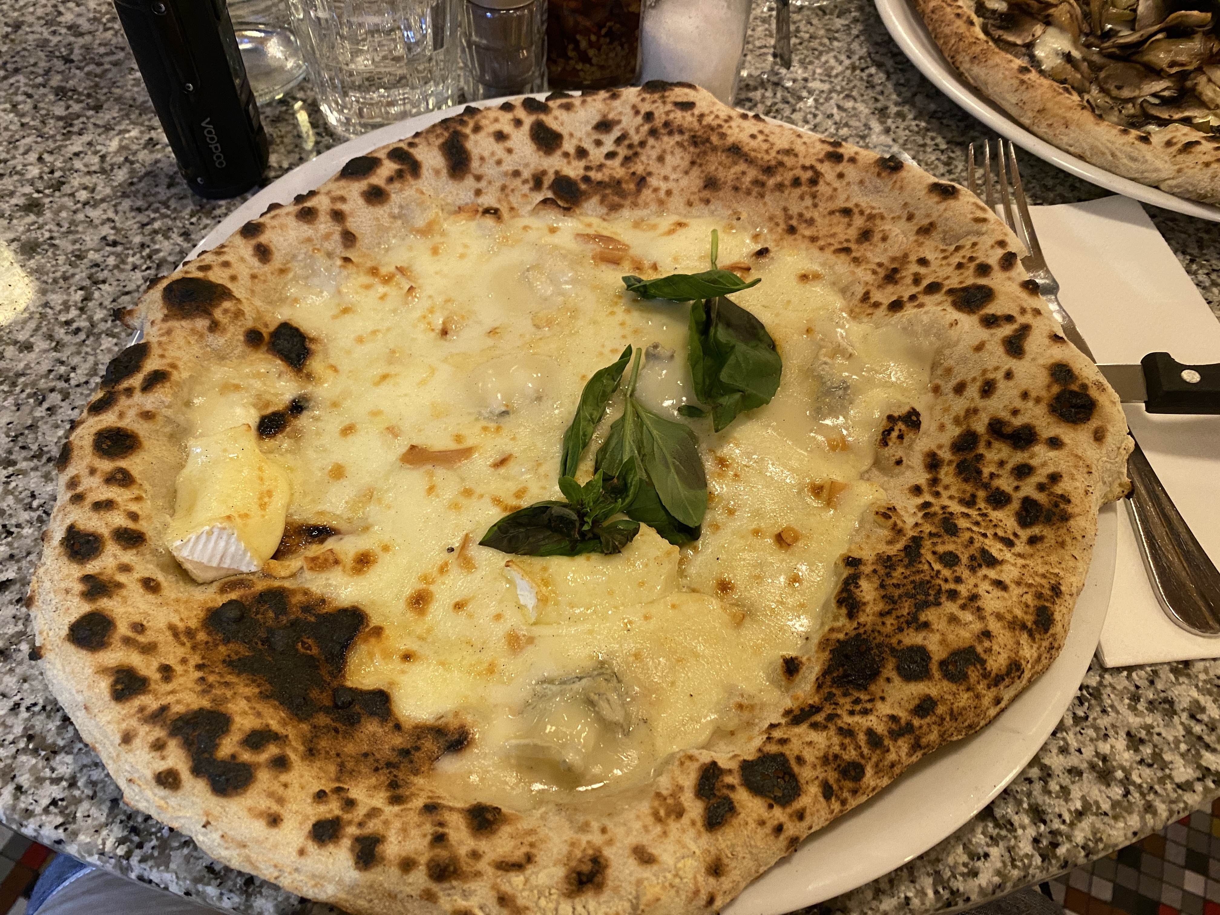 La barman qui interpelle les clients en leur hurlant « Allo ! », les serveurs pas masqués, les cuisiniers le masque sur le menton. Un vrai cluster ! + incapables de composer une pizza de 3 ingrédients (tomate mozza basilic), ils oublient le basilic et m’obligent à revenir 10min plus tard et à manger froid