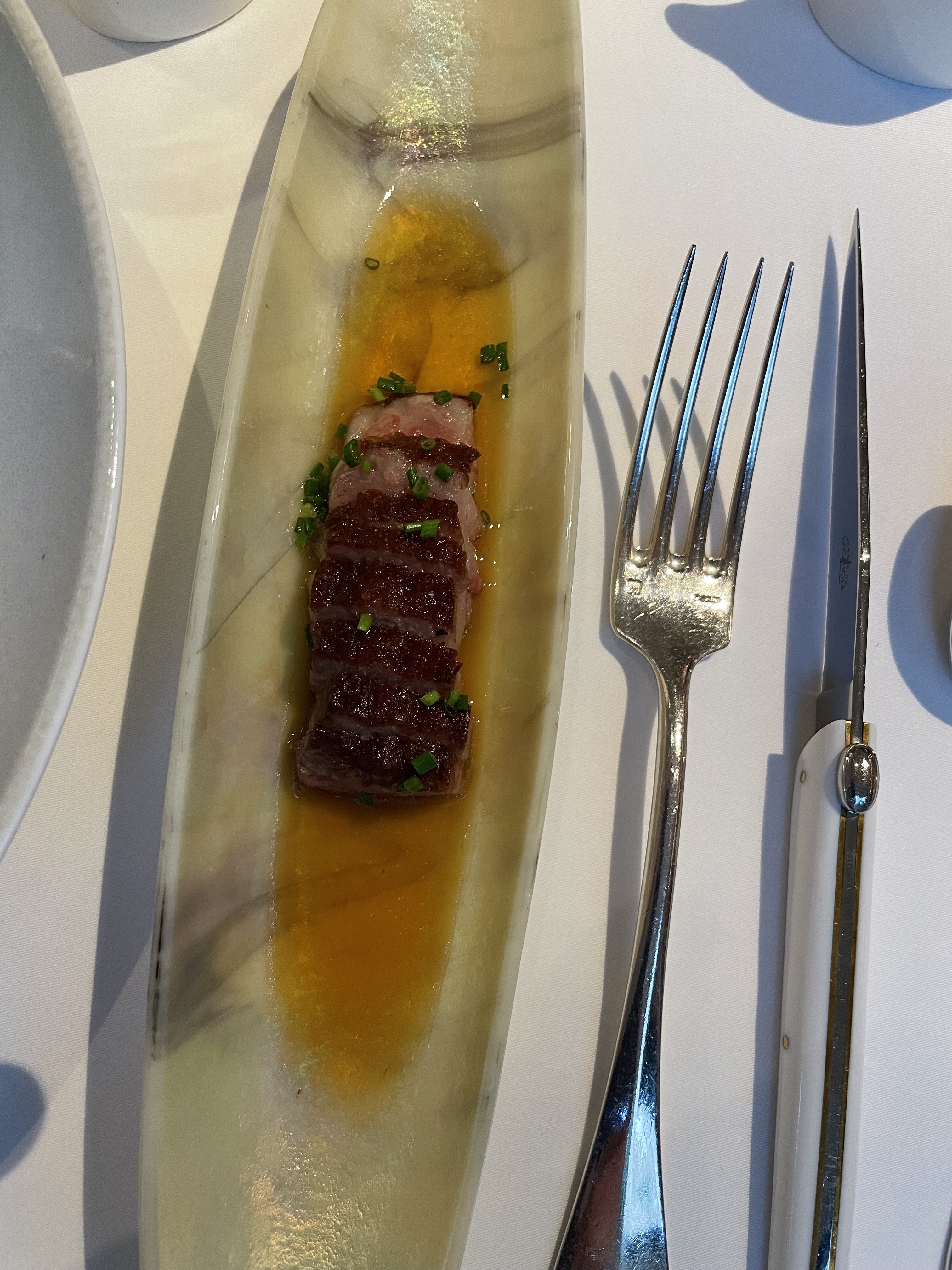 Ce restaurant était parfait, de la nourriture au service en passant par l'ambiance. Si vous aimez le thon, vous devez absolument goûter au fabuleux apéritif. Le plat de homard bleu local était poché à côté de la table et était délicat et sucré. De nombreux amuse-bouche avec de merveilleuses olives farcies comme je n'en ai jamais eu. Le personnel était très accueillant et a aidé à tout traduire en anglais. J'étais très à l'aise pour dîner en solo au petit bar. J'ai eu une belle conversation avec le chef Jean-Yves Schillinger, très modeste pour un chef aussi accompli et compétent. Le bâtiment est magnifique. Cela fait partie de mes meilleurs repas et j'ai hâte d'y retourner un jour.