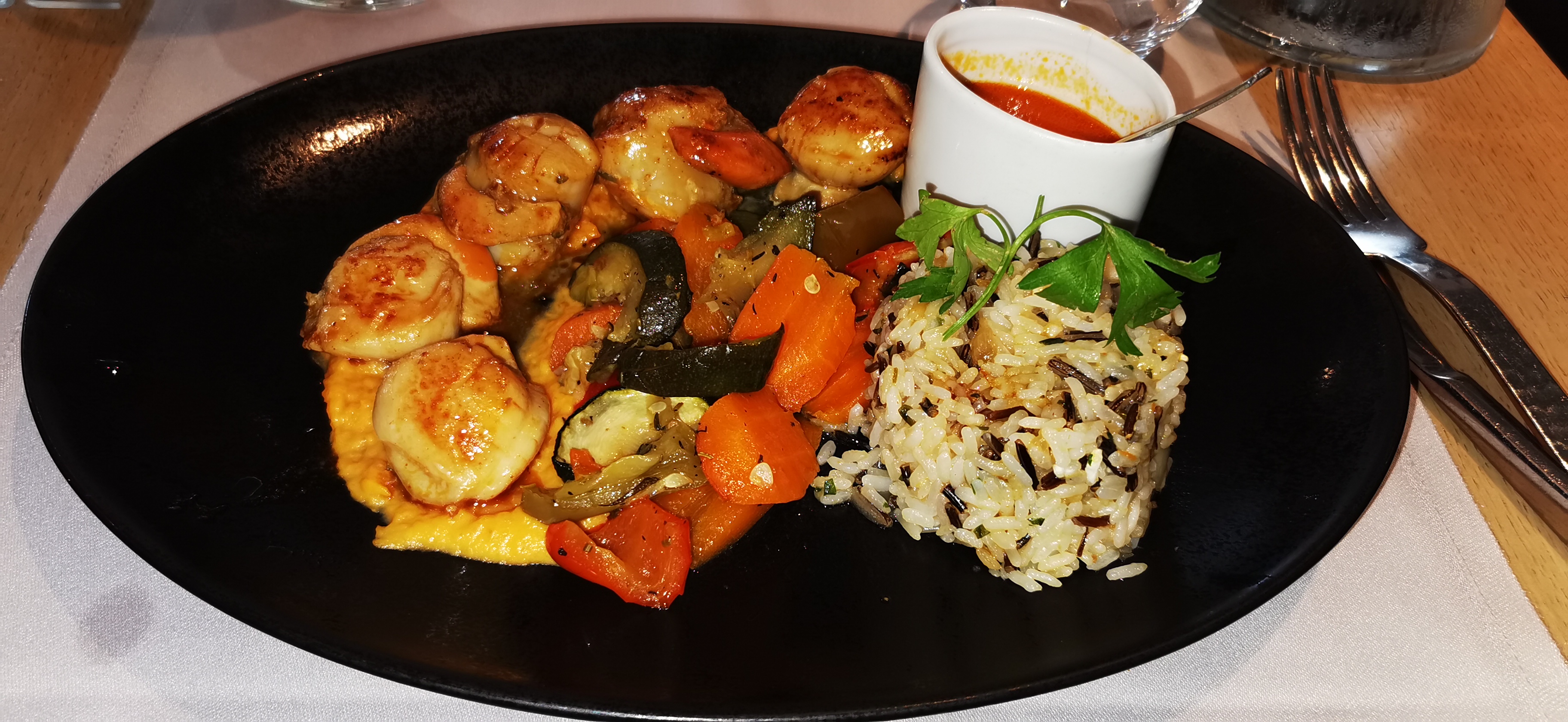 Petites remarques : Nous avons choisis dans le menu des coquilles St Jacques en entrée et en plat principal, seulement pas de variété au niveau de l'accompagnement (décevant). Entrées, les coquilles St Jacques sont servies avec une ratatouille (mélange curieux pour une entrée) en brochette avec une salade aurait été le plus appropriée. Plats, les coquilles St Jacques toujours servies avec des légumes en ratatouille et du riz, le plus judicieux aurait été de servir du riz avec des champignons pour varier le menu. A méditer pour les prochaines fois. Nous venions pour la 1ère fois et cela nous a déçu, non pas, la cuisine mais l'accompagnement du plat (entrée et plat identiques) dommage. Ne pas se remettre en question peut avoir des conséquences néfastes mais je suis certaine que mes remarques seront analysées avec justesse et pour avancer dans le bon sens. Mon avis n'est pas un mépris à votre encontre mais il doit servir à l'amélioration. Bien cordialement. Mme VIGIER Arlette