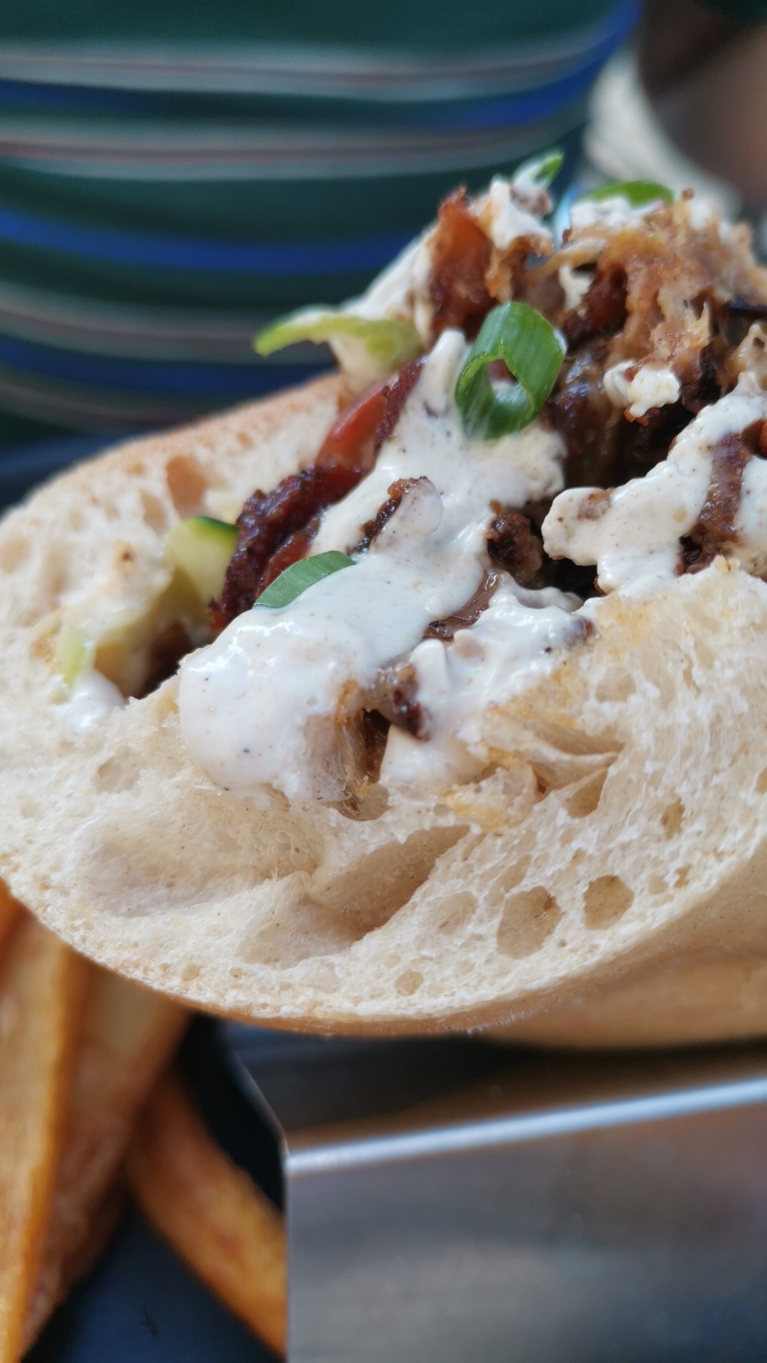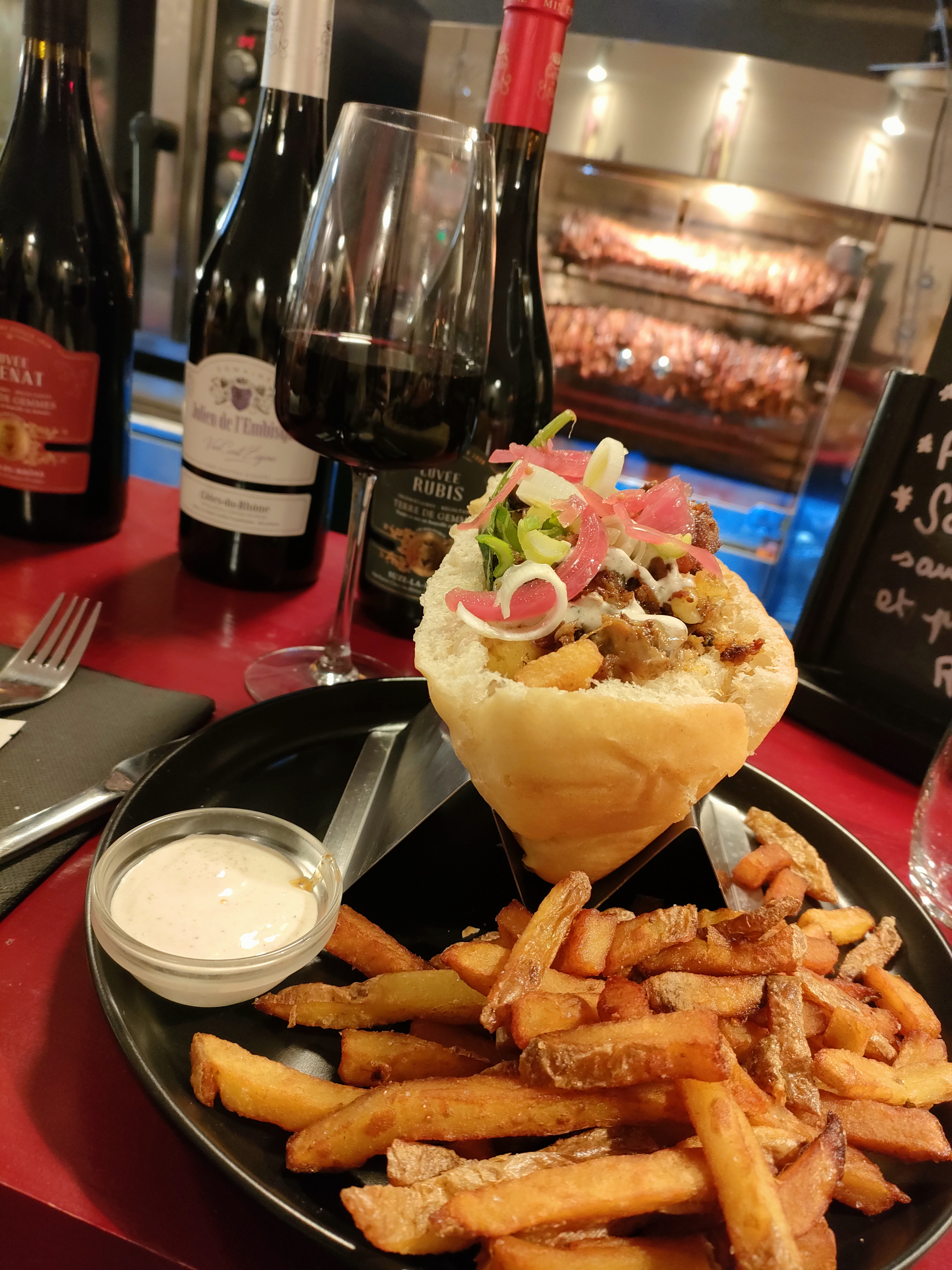 Viande excellente et locale (Allier), frites exceptionnelles (MAISON)... Équipe aux petits soins. De la bière, du rouge! Quel pied! 🥙🐷