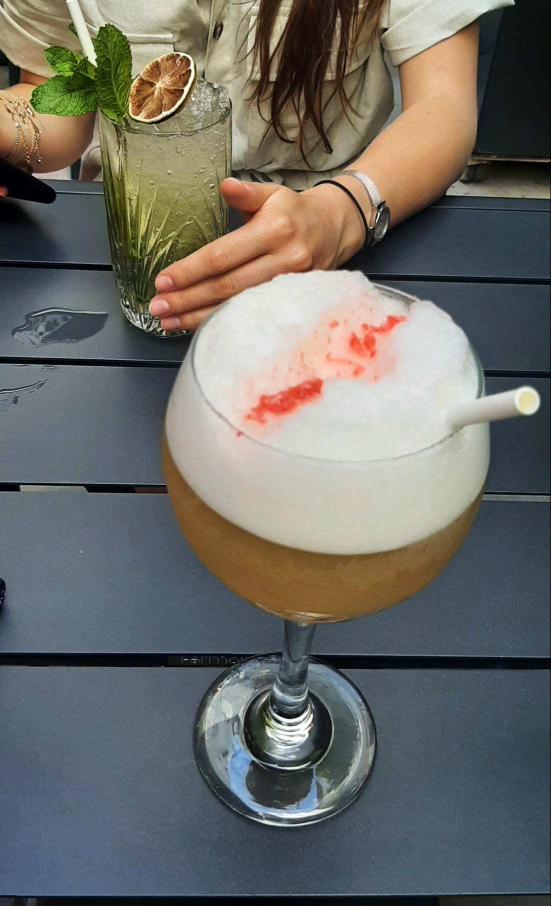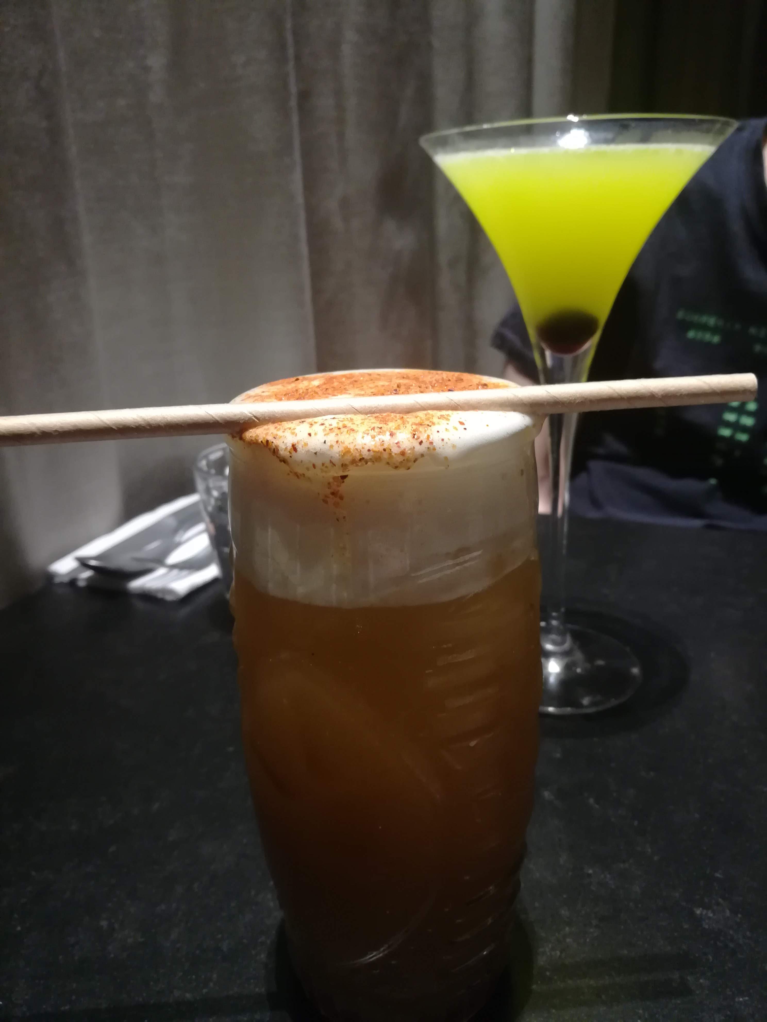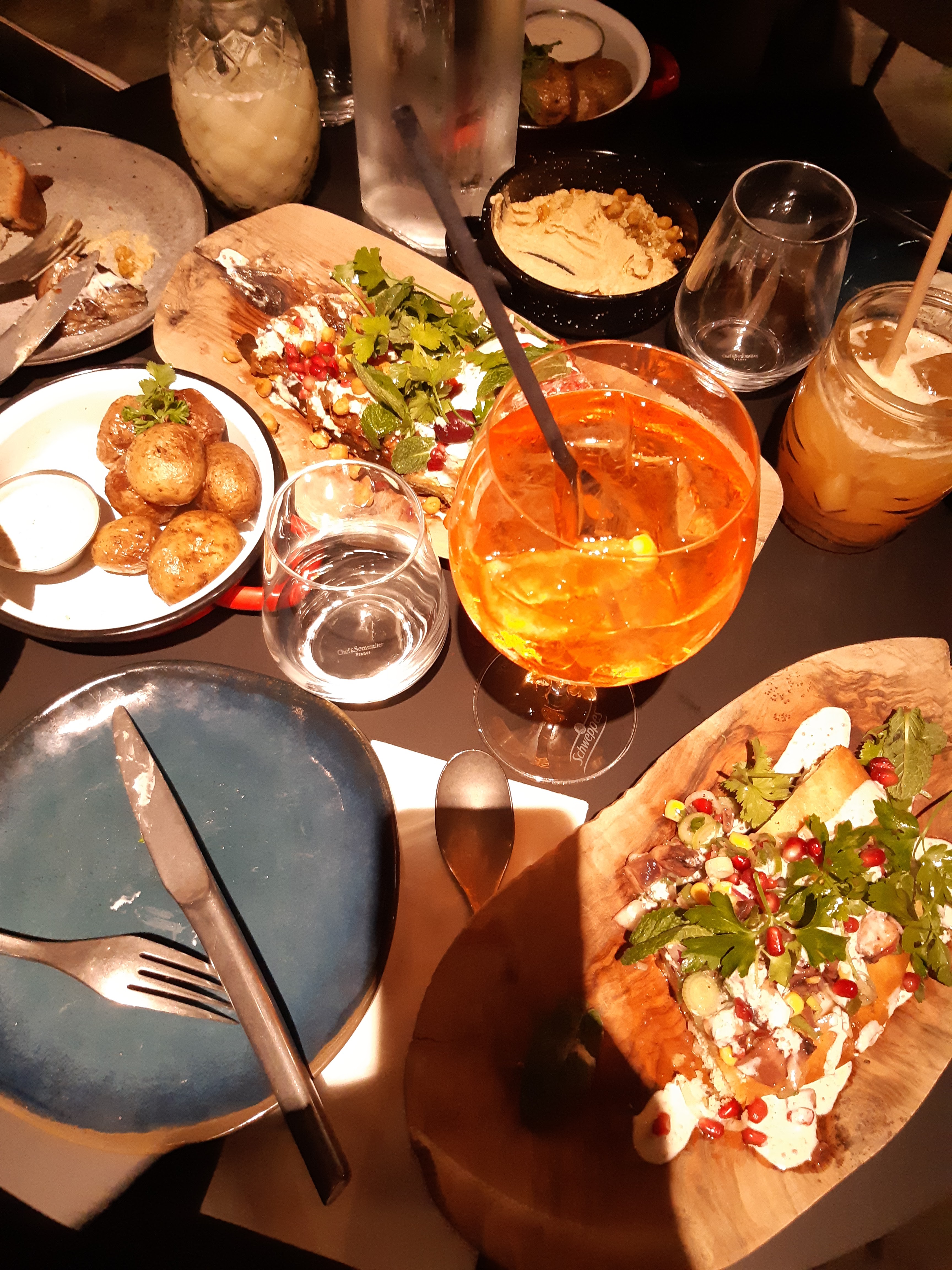 Les verres sont incrusté avec des vieux résidus, que ça soit les verres à cocktail en plastique ou les verres de table, ça fait vraiment pas bonne impression. À l’étage chaleur intenable, je transpire en teeshirt 🥵🥵🥵. On écourte notre soirée 14€ pour un gin tonic amélioré à base de sirop de framboise qui camoufle prends le pas sur le goût de tout. Les mezze sont dans l’ensemble pas trop mal mais vendus 2 fois trop cher par rapport à la quantité/valeur.