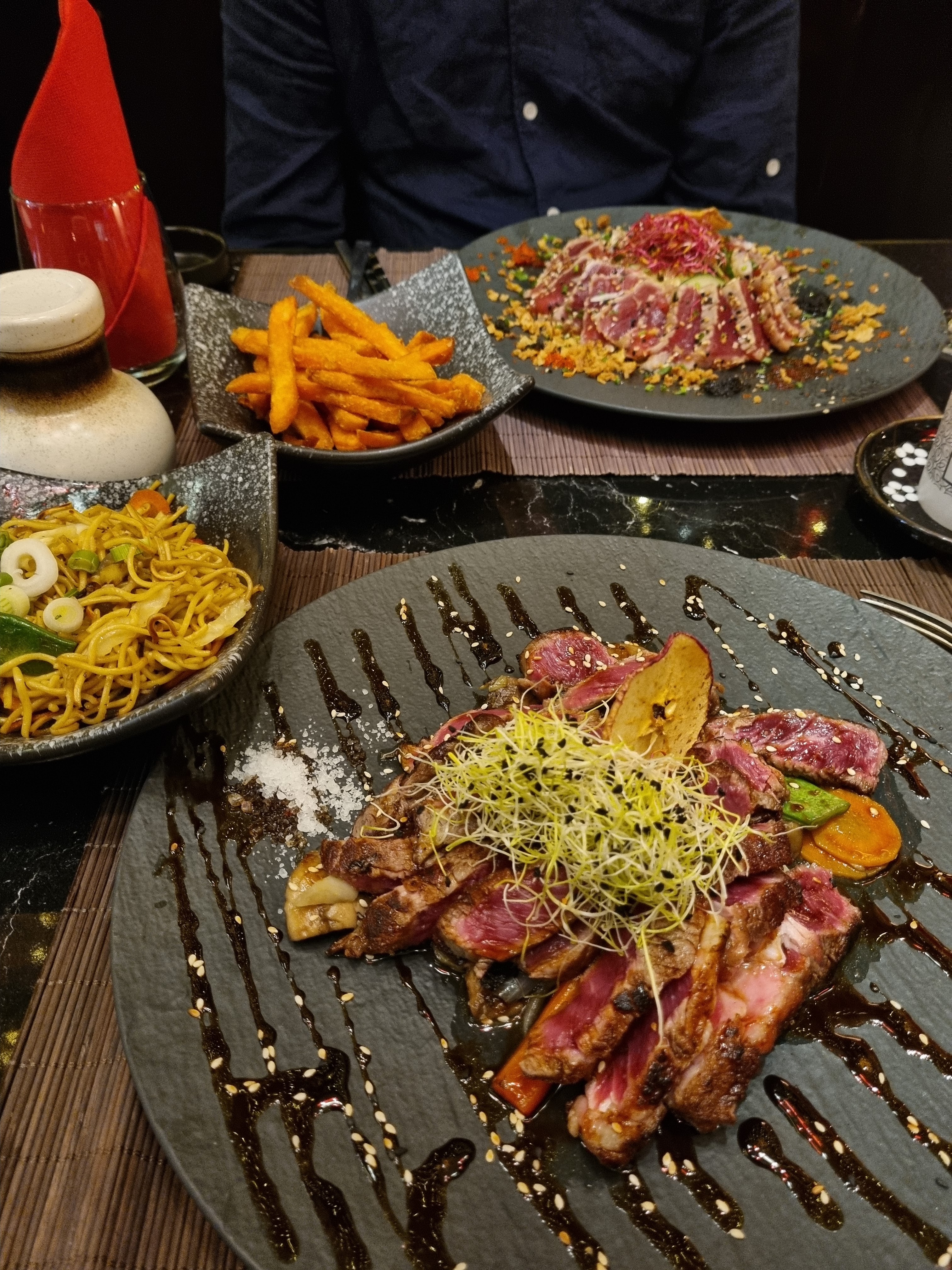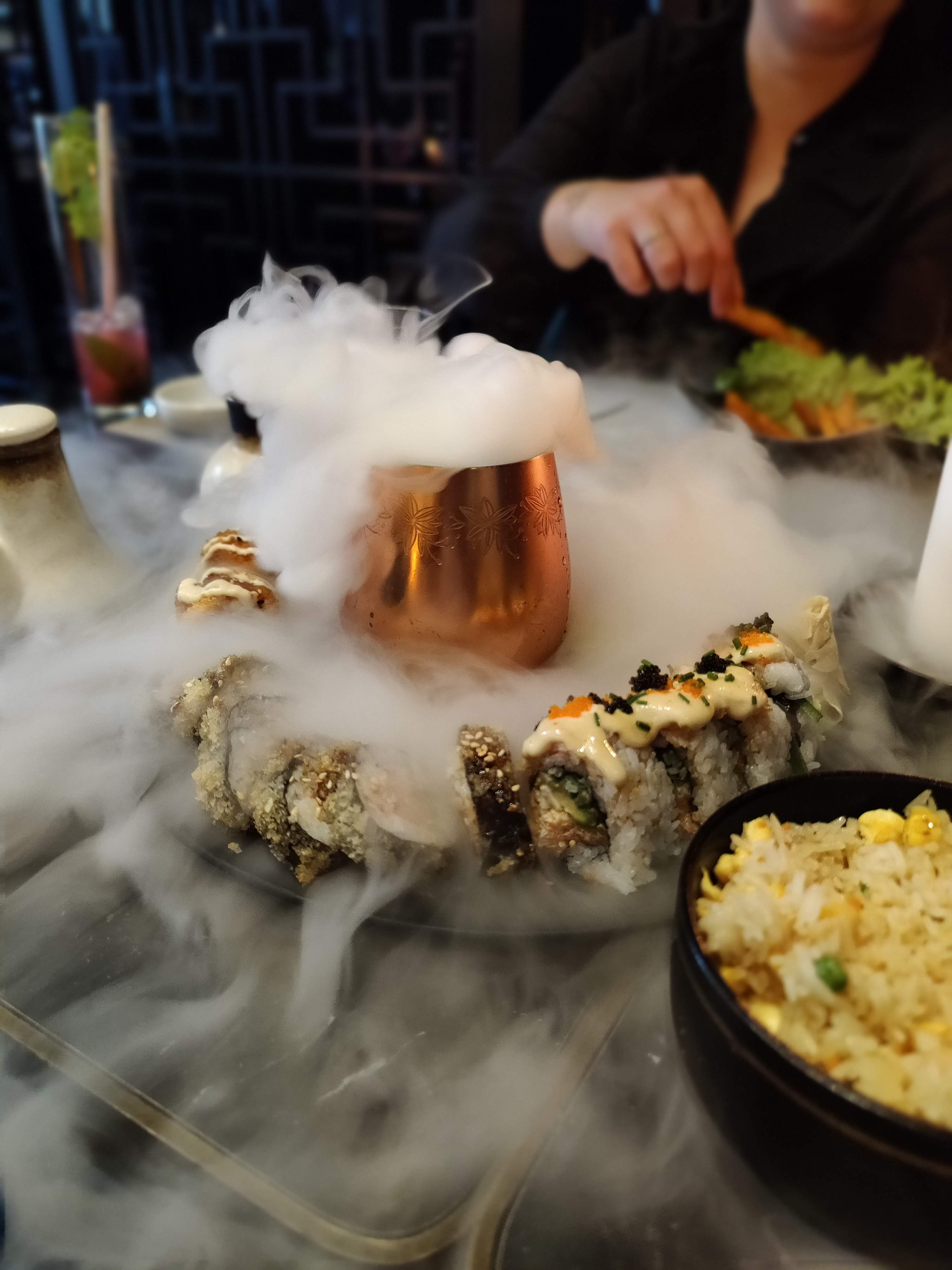 Cuisine très bonne, plats chauds à manger sans même rajouter de sauce soja, le goût est présent, cocktails nombreux à goûter aussi Effets de fumée et présentation des plats visuellement attractive, par contre les mochis ne sont pas mis en valeur par l'ajout de gâteaux et de sauce qui cassent le goût principal, je déconseille donc les desserts