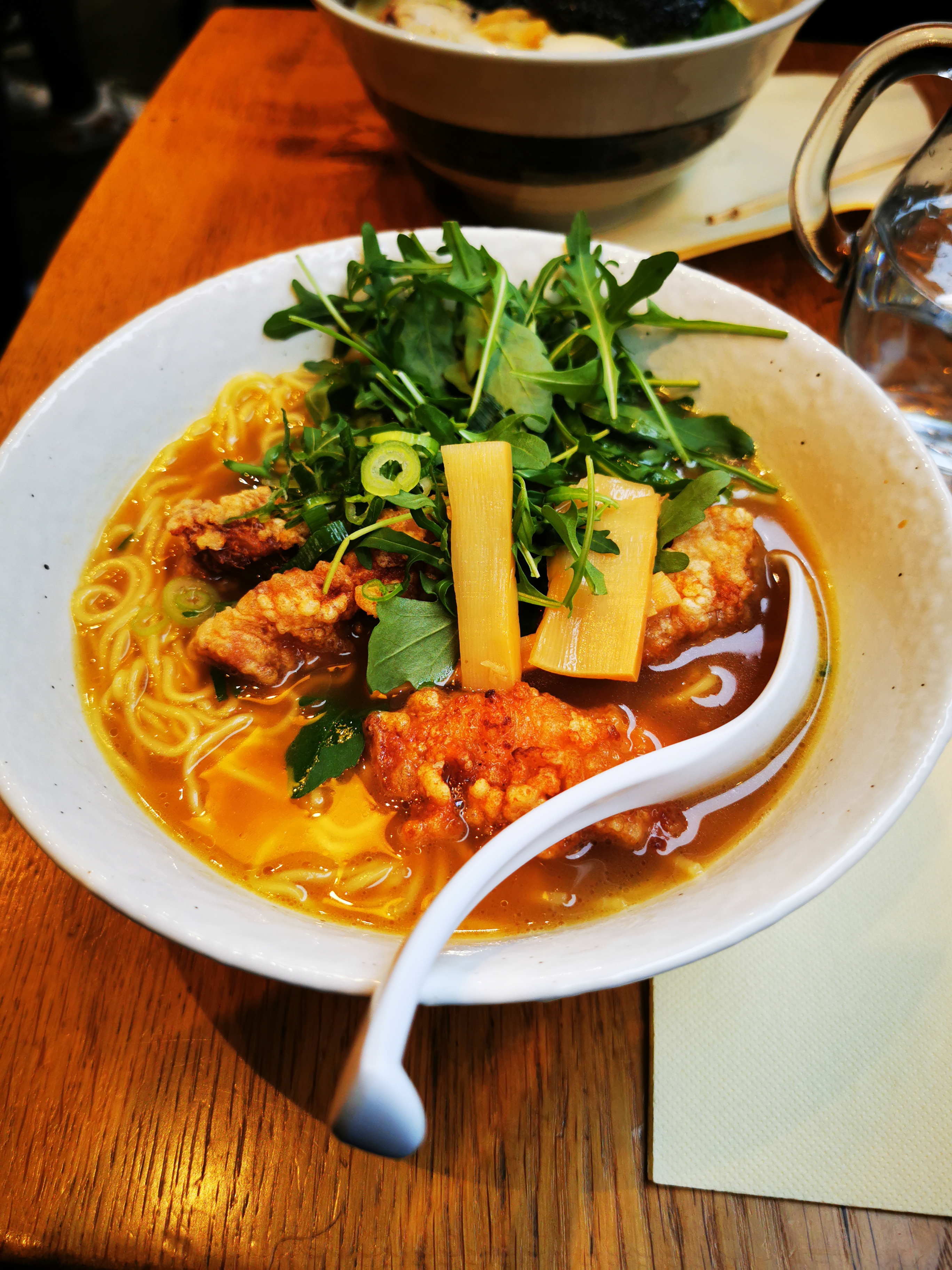 La décoration très jolie et le service était très gentil. J'ai pris un ramen au poulet croustillant, le poulet est délicieux mais une fois dans la soupe il devient tout mou... Il serait mieux de le mettre dans une assiette à côté pour que les clients puissent le tremper avant de le manger, ça conserverait un peu le croustillant. Le goût du bouillon était bon sans plus. Les œufs sont bons. Je retiendrais surtout le très bon poulet.