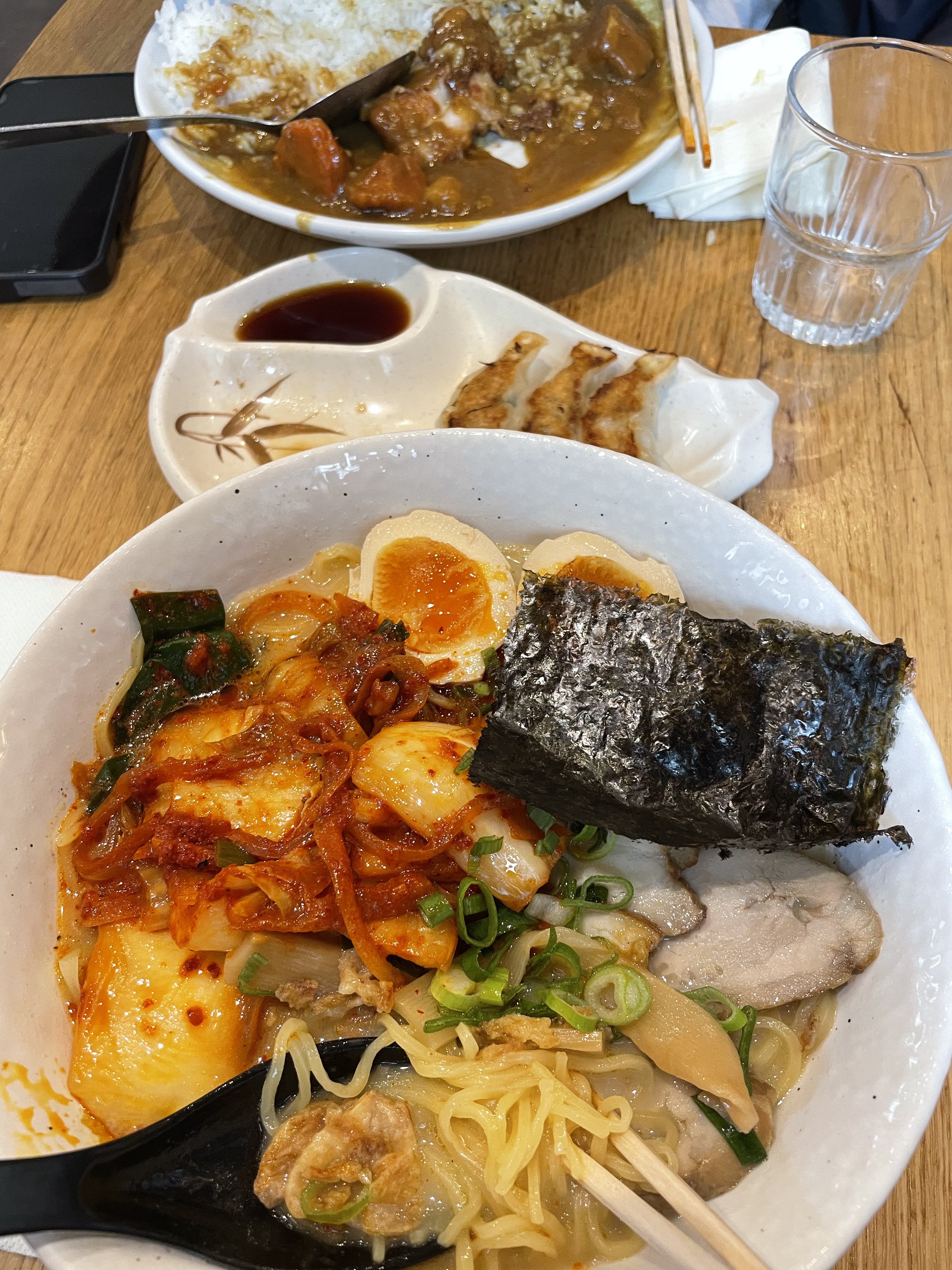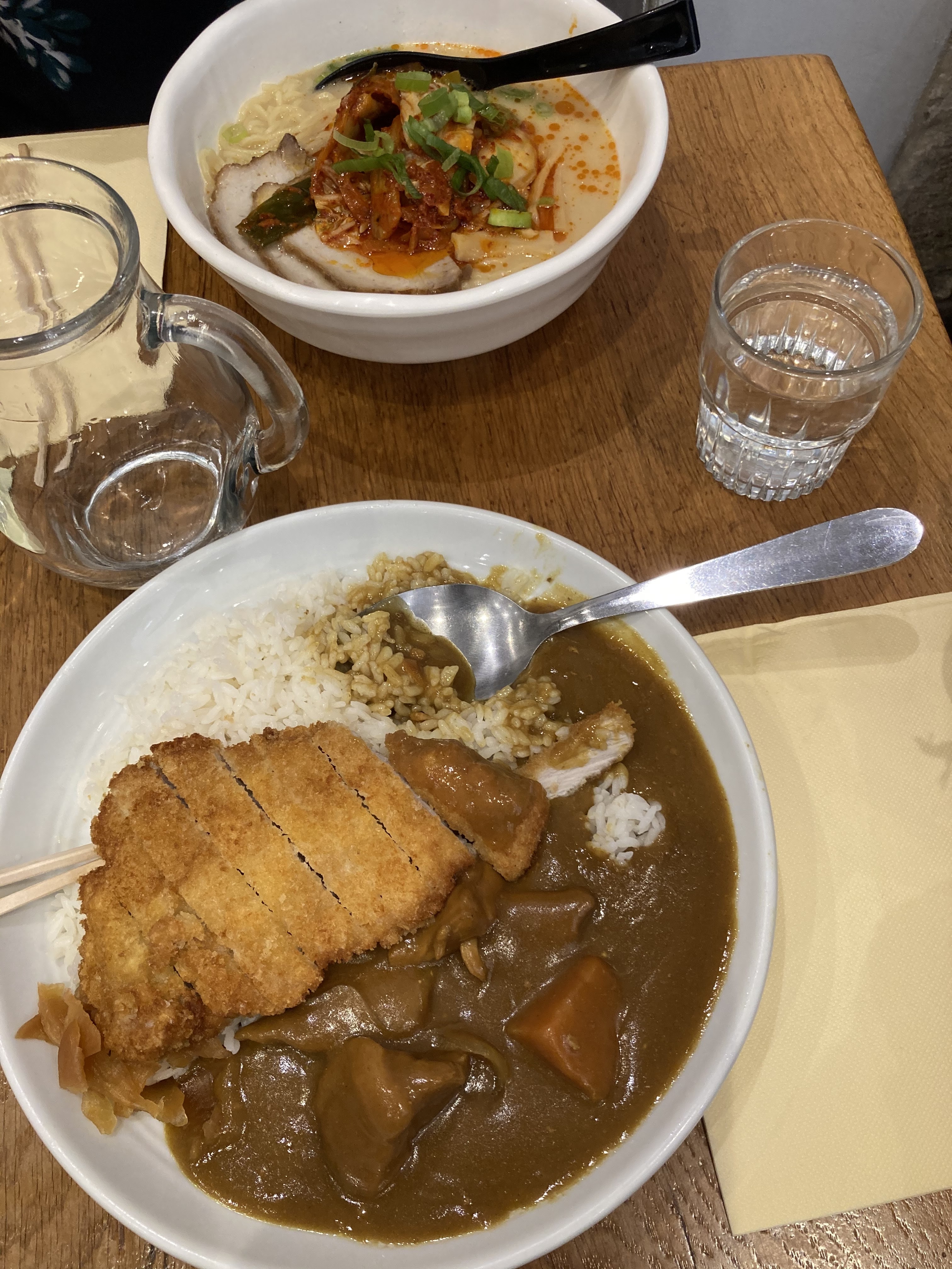J’y suis allé avec des amis, on a été installé dans la salle en bas et c’était très cozy, l’ambiance était cool. On a été servi assez vite ! Le personnel était très serviable, aucun problème Cela dit je trouve ça un peu cher pour la qualité et le goût, les nouilles des ramen sont pas superbes même si le bouillon était très bon ! le poulet aussi était bon ! Les gyozas étaient cependant secs à l’intérieur ce qui est dommage ! Les portions étaient cependant très généreuses , surtout pour le curry ou les nouilles sautés que mes ami.e.s ont prit! Mais dans l’ensemble ça allait ☺️