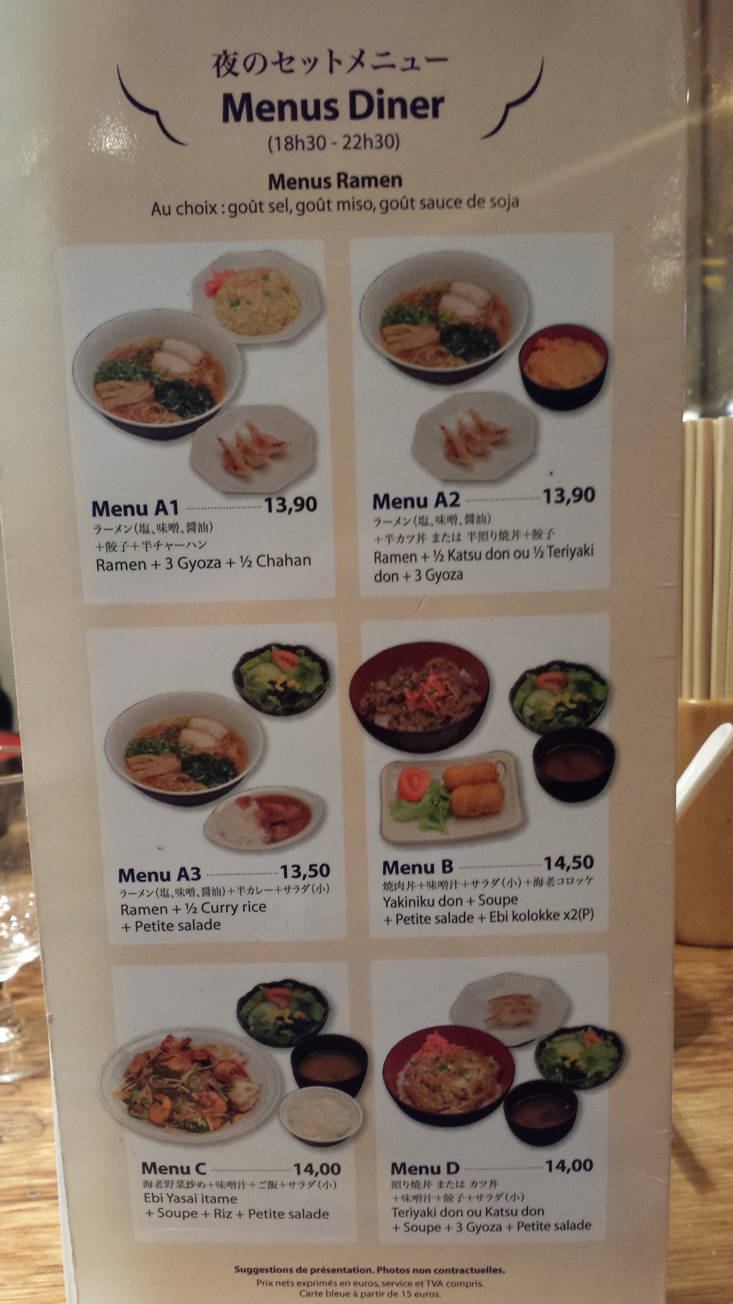 Tout d’abord l’ambiance, ce restaurant est généralement très fréquenté, voir TROP c’est à dire que je suis venu à 22:00 et le restau était encore pleins à craquer; impossible de s’entendre parler, un bruit de fond très pesant. Espace entre les tables très restreint, j’ai dû demander à la personne assise derrière moi de se décaler pour pouvoir tirer ma chaise. Service : correct mais pas assez rapide. CUISINE : passons aux choses sérieuse, je ne suis pourtant pas difficile quand il s’agit de nourriture mais alors la, c’était IMONDE. Nous étions 4, donc 4 plats différents, et pas 1 seul était à la hauteur. Je m’explique : poulet très gras, plus de peau que de viande, bouillon qui a le goût d’un cube de supermarché, légume très mauvais goût. Pourtant les nouilles étaient bonnes, mais le bouillon à tout gâché. Petit point positif, les boulettes de poulpe étaient excellente, rien à dire ! Mais face aux plats principaux, un désastre. Parlons maintenant des prix, 14€ pour des ramens ou 3 bouts de viande se battent en duel, oui j’ai connu mieux et je suis déçue. Je n’y retournerai pas.