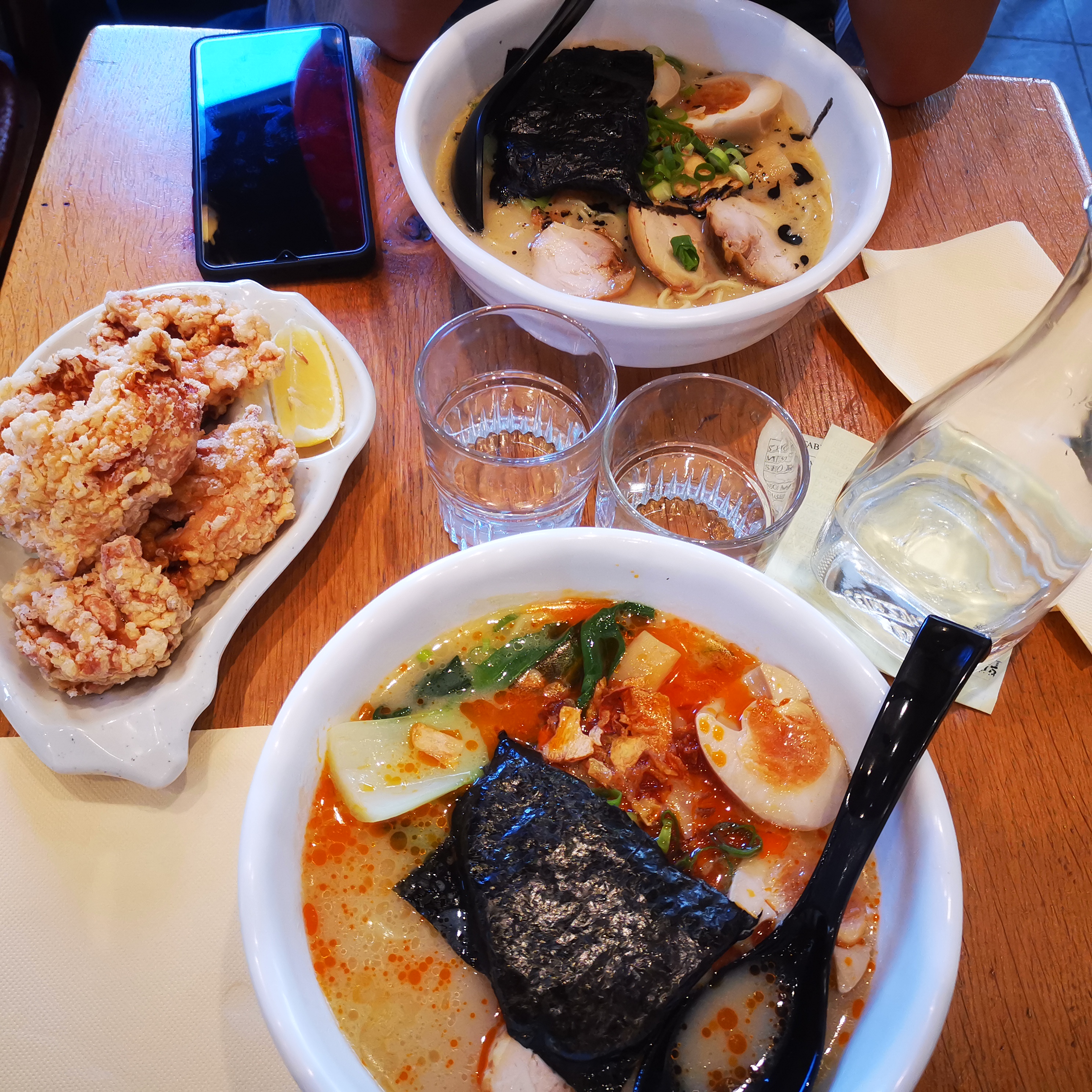 Avec ma mère et ma tante nous avons commandé 3 différents ramens et une assiette de poulet karaage. Le poulet frit était très bon mais les 3 ramens étaient chacuns très fades. Celui qui devait être pimenté était pleins d'huile mais 0 épicé. Le service est moyen. Nous sommes réparties avec les 3 ramens encore pleins... nous aurions dû tenter les autres plats peut être meilleurs à la place des ramens. Quel dommage