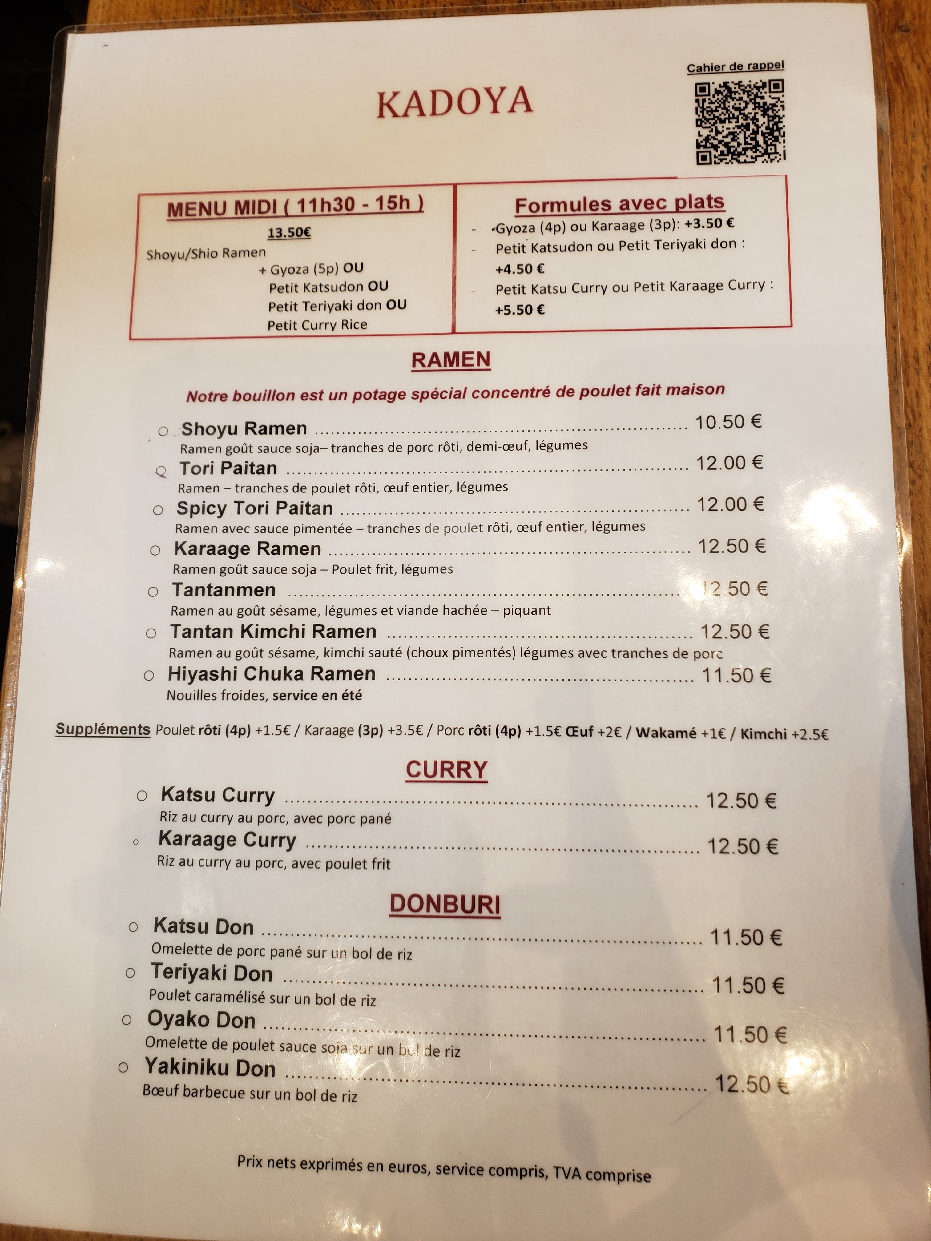 Toujours bien reçu chez kadoya, les ramens et plats sont délicieux. Service rapide, parfait 👍