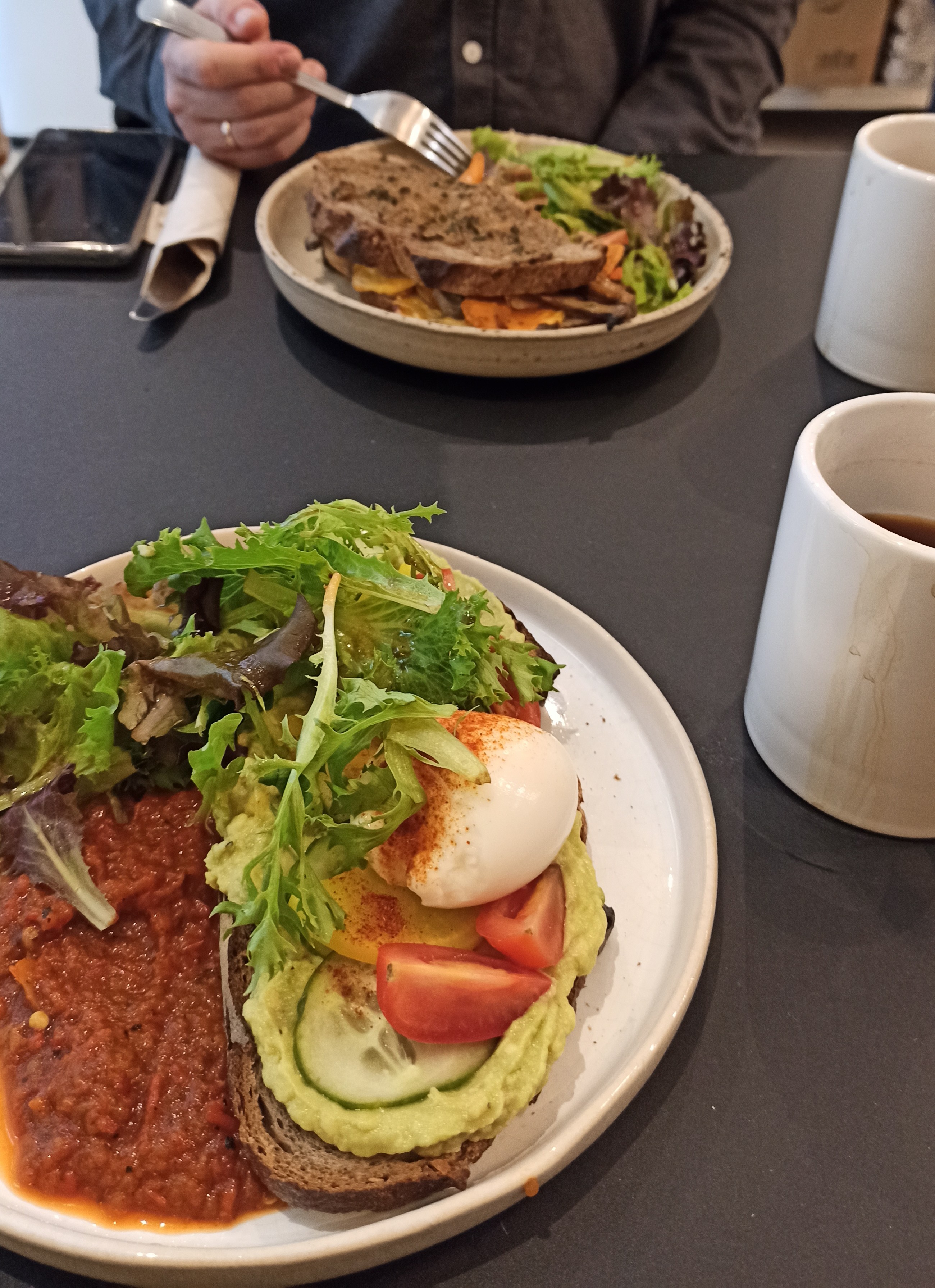 C'est un endroit génial et une nourriture à un prix assez économique :) Je suis moi-même venu ici assez souvent et à chaque fois, j'aime leur café et leur nourriture :) Dans cette photo: - Vous verrez Filtre V20 (Pas fan de café mais après avoir essayé ce café je l'ai adoré) - Tartine grillée aux fromages et ses légumineuses à la provençale ( génial pour les légumes comme moi :) Essayez-le, vous l'aimerez sûrement