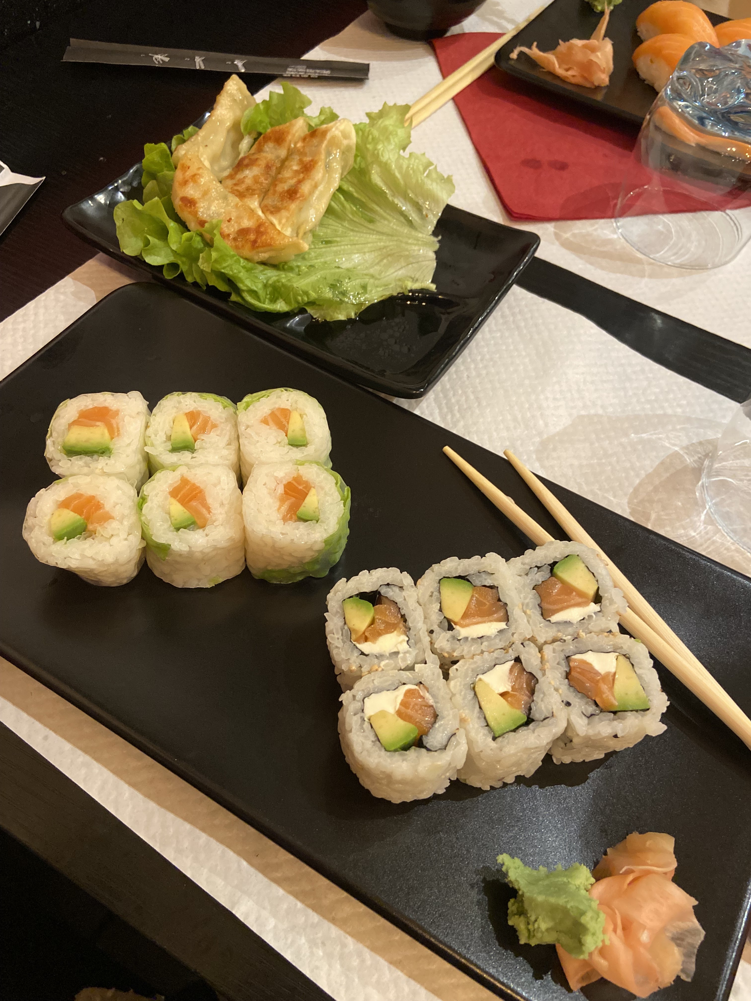 Les portions sont copieuses pour des prix raisonnables comparés à ce que l'ont peut trouver ailleurs (les tranches de sashimi étaient bien épaisses). Les plats chauds types gyozas et nems avaient l'air d'avoir été achetés et décongelés, donc pas le meilleur goût malheureusement. Possibilité de manger en terrasse quand il fait beau, ce qui est très agréable !